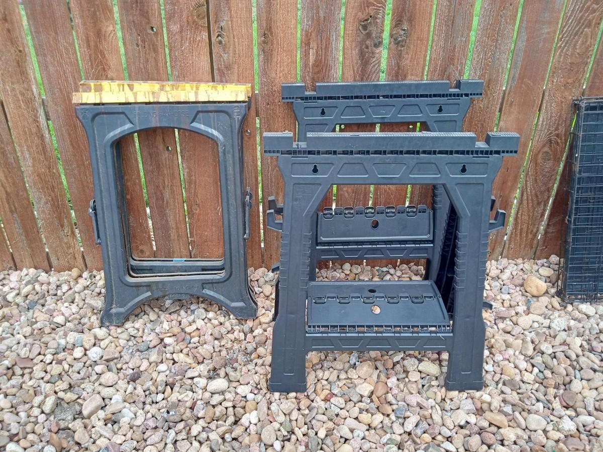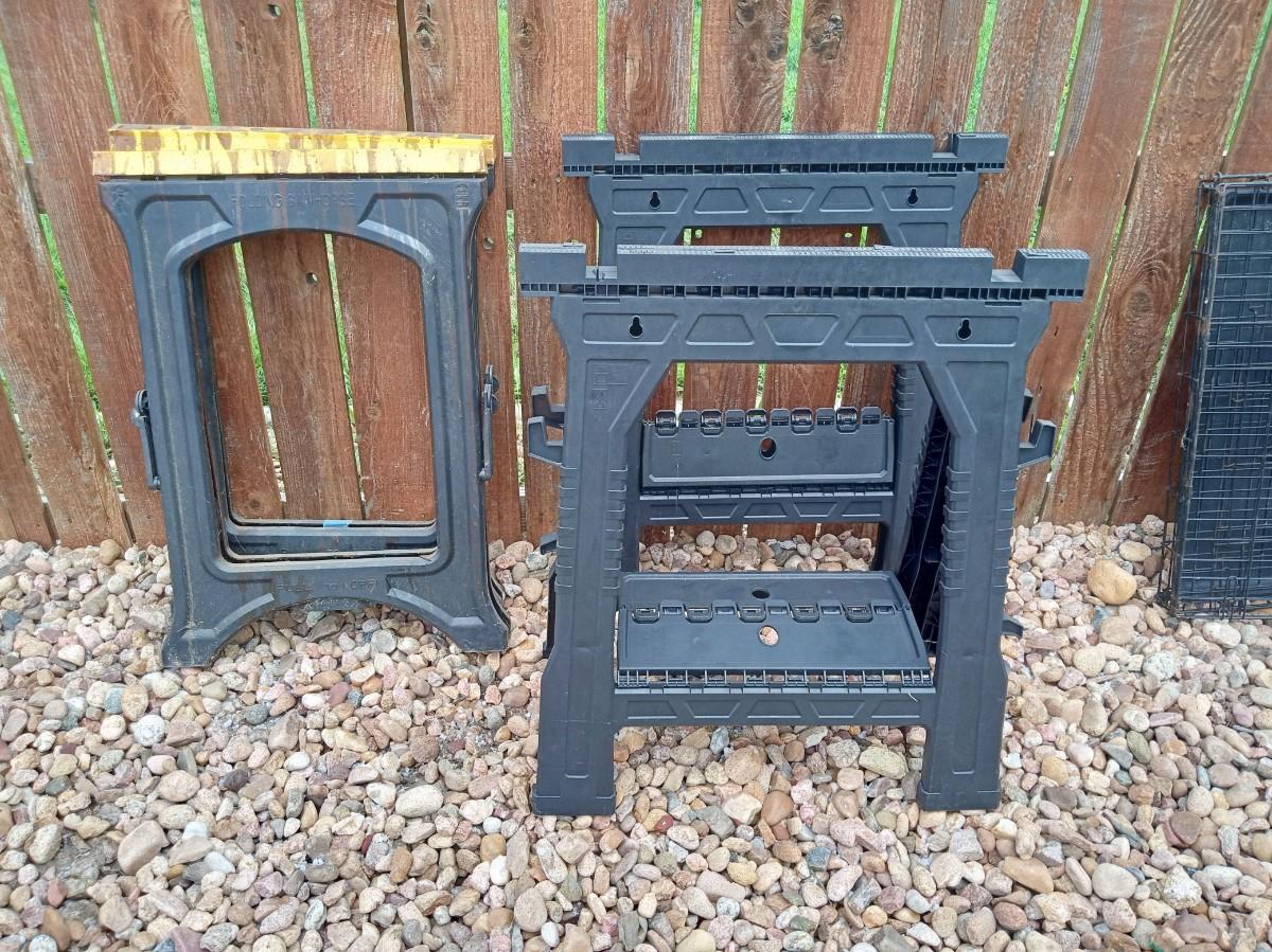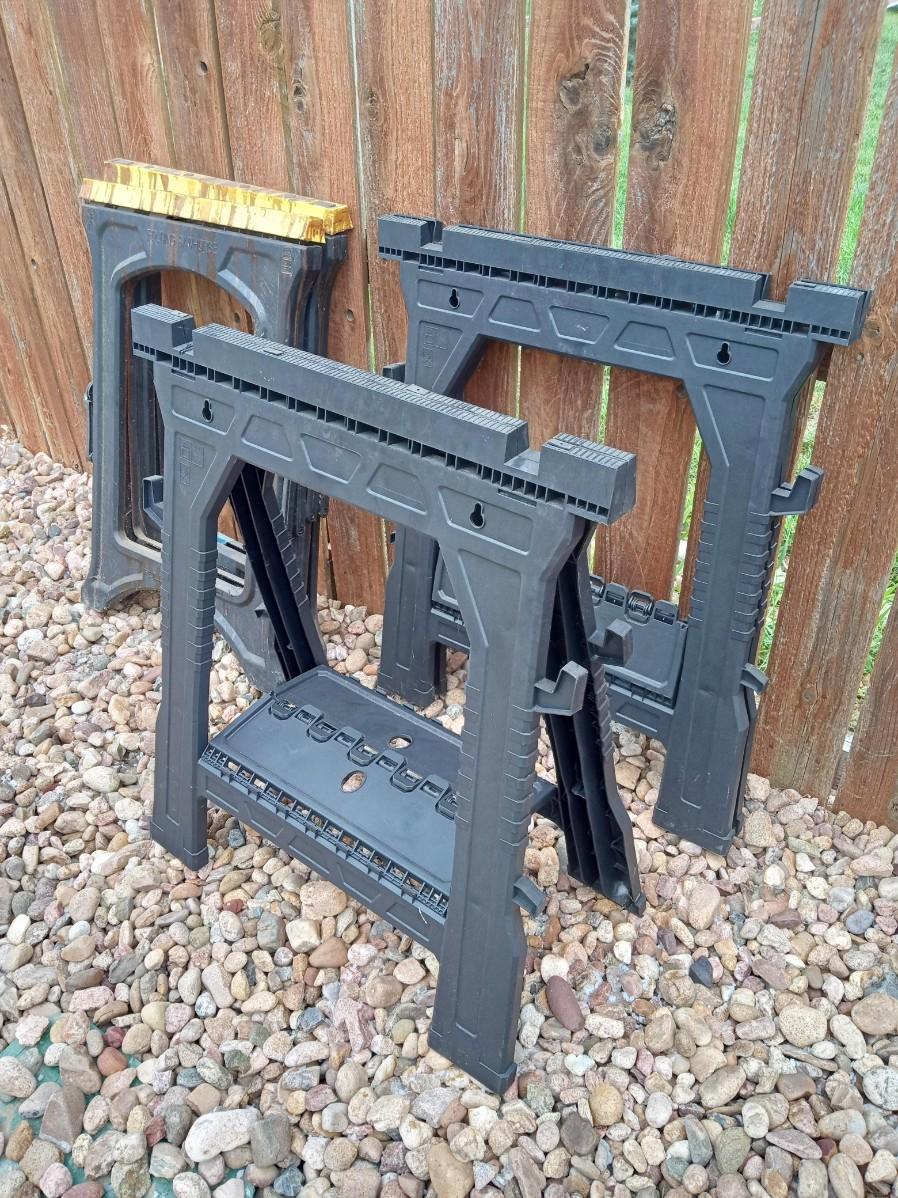 1 OF THE SAWHORSES WITH THE YELLOW TOP IS CRACKED TOWARD THE BOTTOM (SEE PIC)