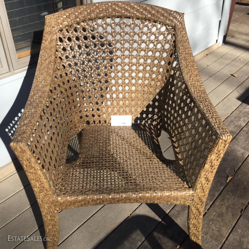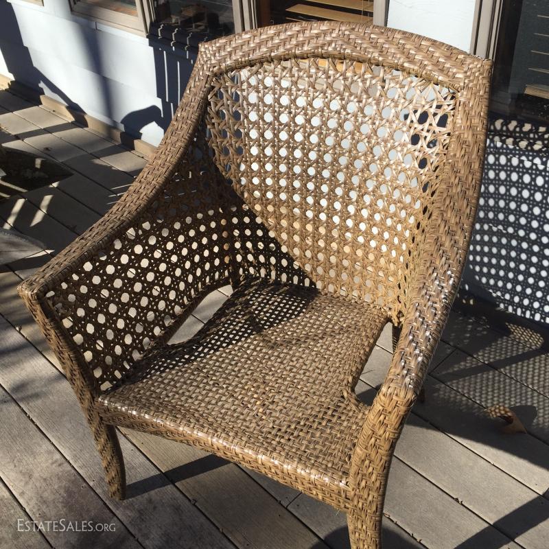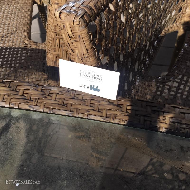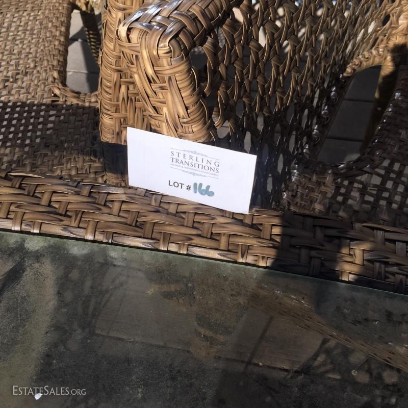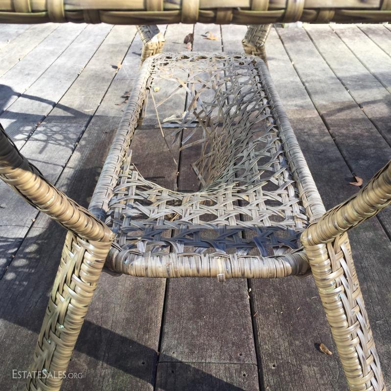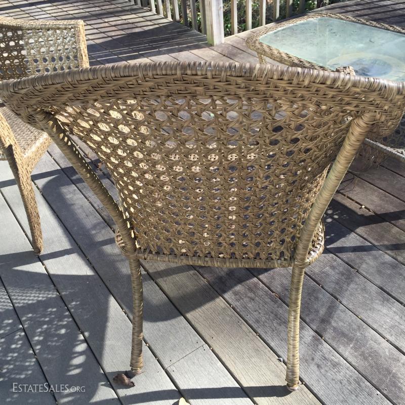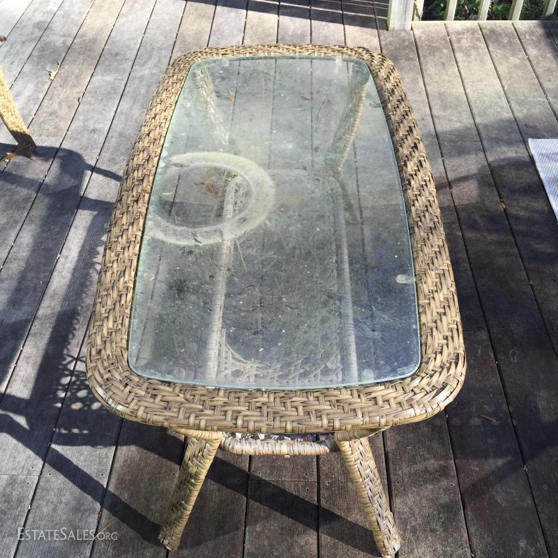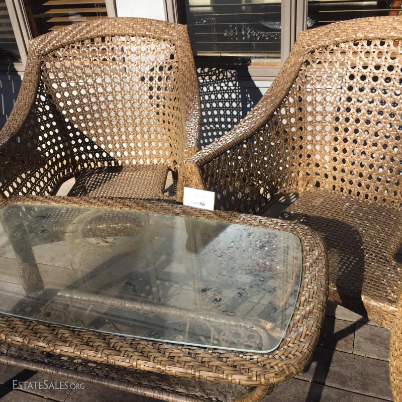 Two wicker chairs and wicker table with glass top. Weaving at bottom of table is broken. See photos. Sold as is.