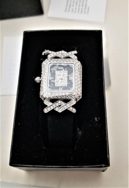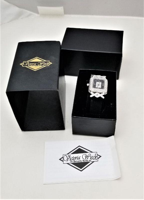 Victoria Wieck watch - new in box - never used. Has been in storage so may need a battery. Black suede band and "antique" styling. Set with CZs.