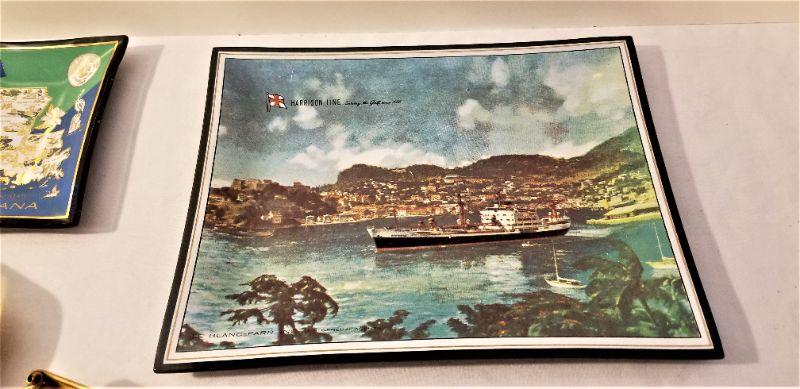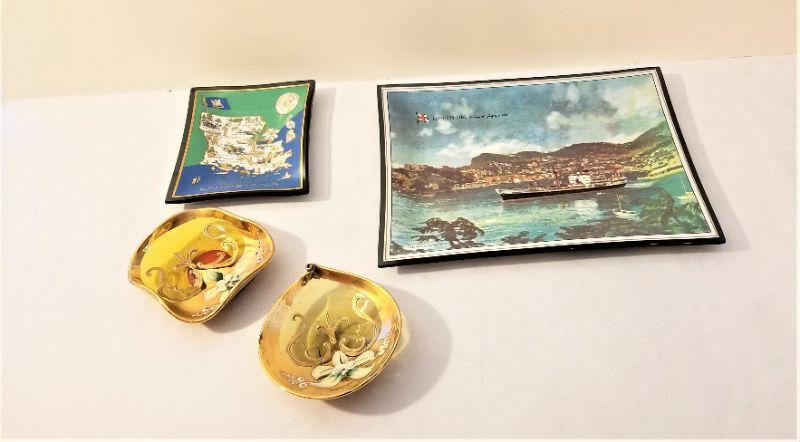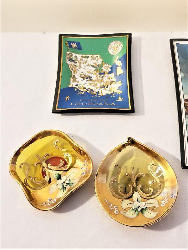 You get all you see here: vintage Kerr Steamship Line ashtray, State of Louisiana ashtray, and two nice "fancy" individual ashtrays. The largest measures 9" x 7". Vintage condition.