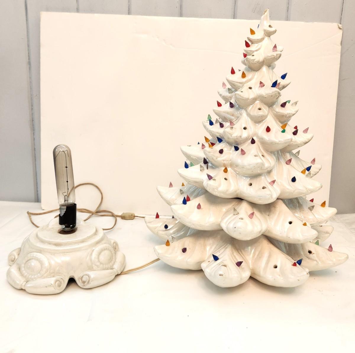 Attic find! Large vintage ceramic Christmas tree, works. Light socket should be replaced because of wear. Tree is missing some bulbs (you can buy then on ebay), some are glued in, and the peak of the tree where a star can go is chipped. 23" tall on base. The old white trees are a lot harder to find than the green ones.