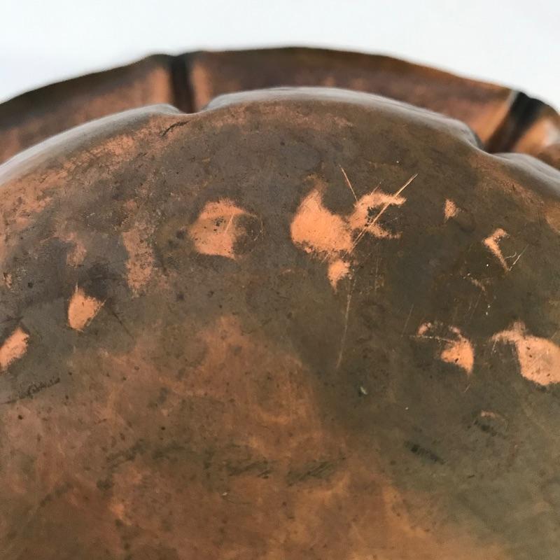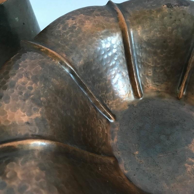 Two vintage hammered service pieces for decor or your dining arsenal. First, a hammered floral-esque 11.5” bowl that appears to be hand forged copper. Paired with the bowl is a hammered metal 13” pitcher. Pitcher is completed with sturdy finial, handle and hammered design. Some wear on copper and bronze colored body shows a silver color under finish. See photos.