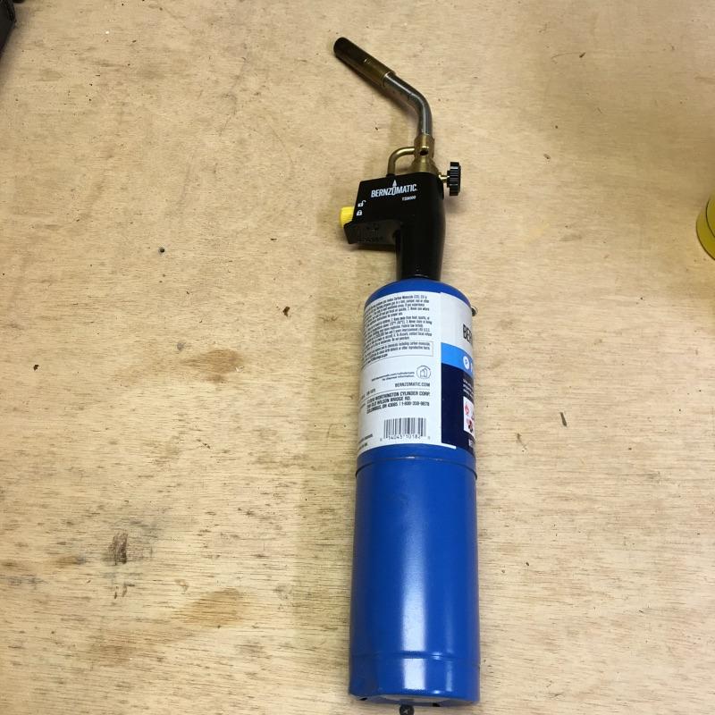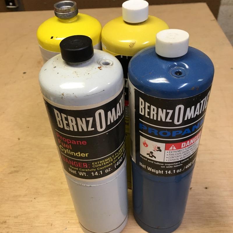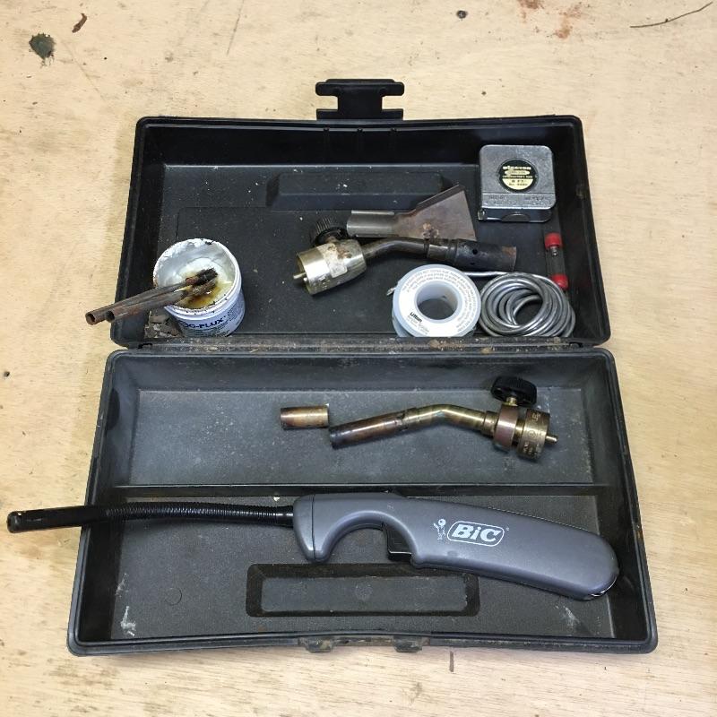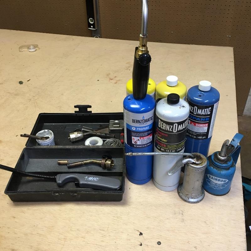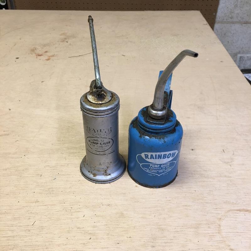 A pair of vintage oil cans made by Rainbow and Eagle, Benzomatic torch with tanks and two torch ends and more.