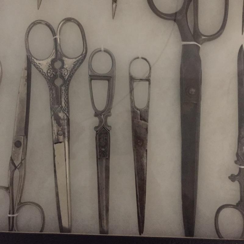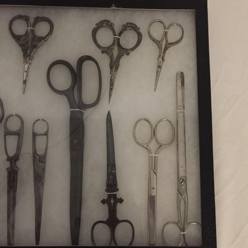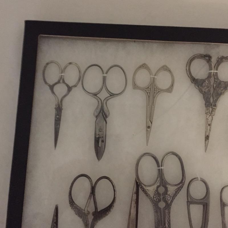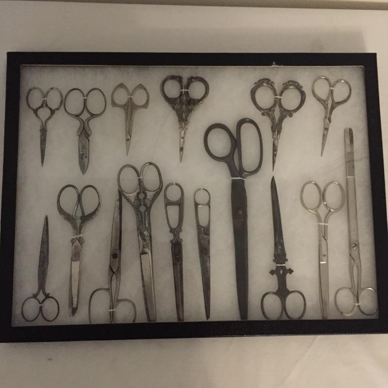 Vintage scissors in display frame. Nice array of scissors. Great for collectors.
