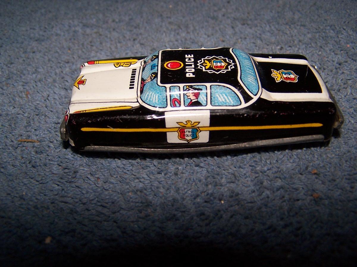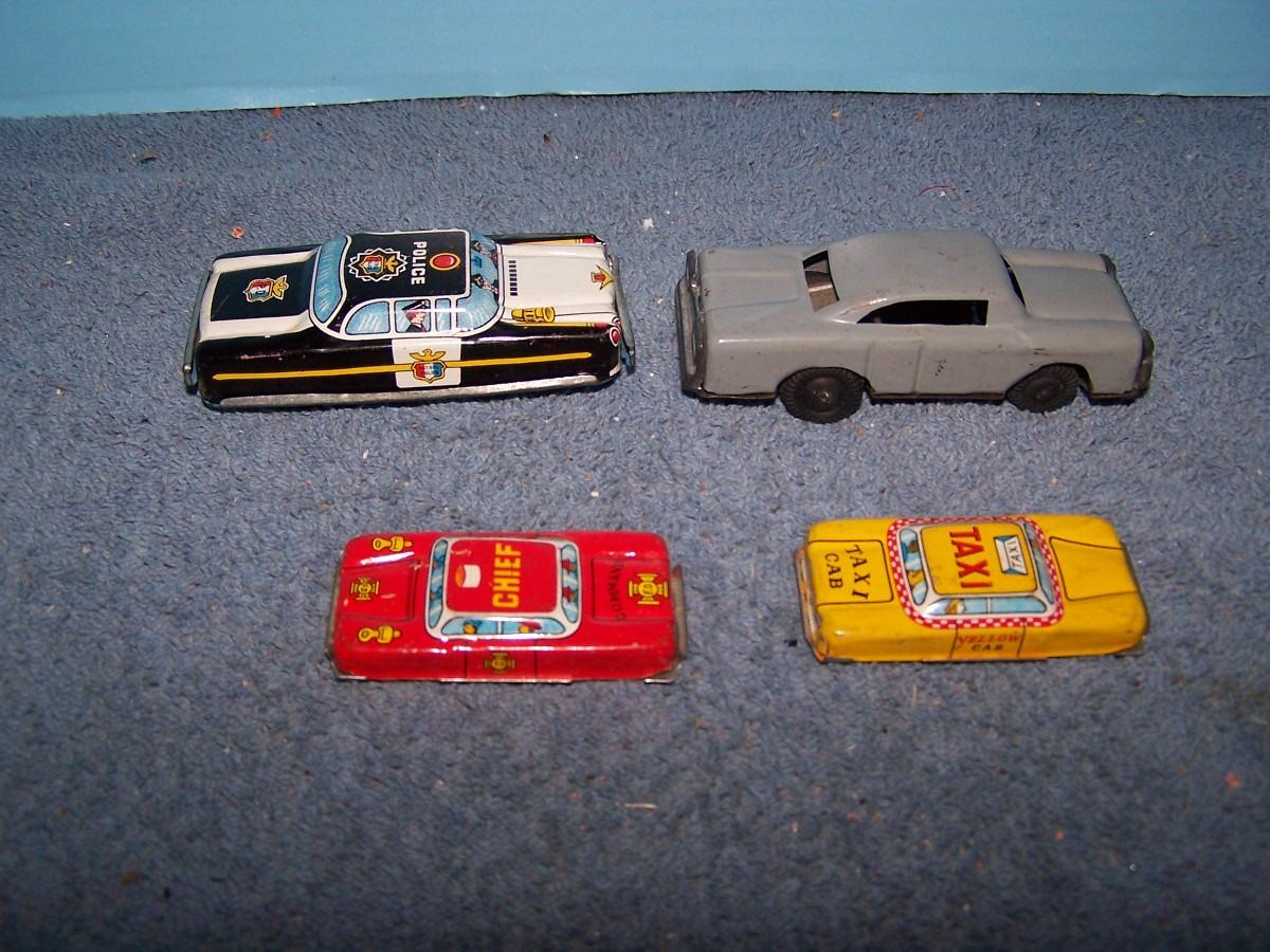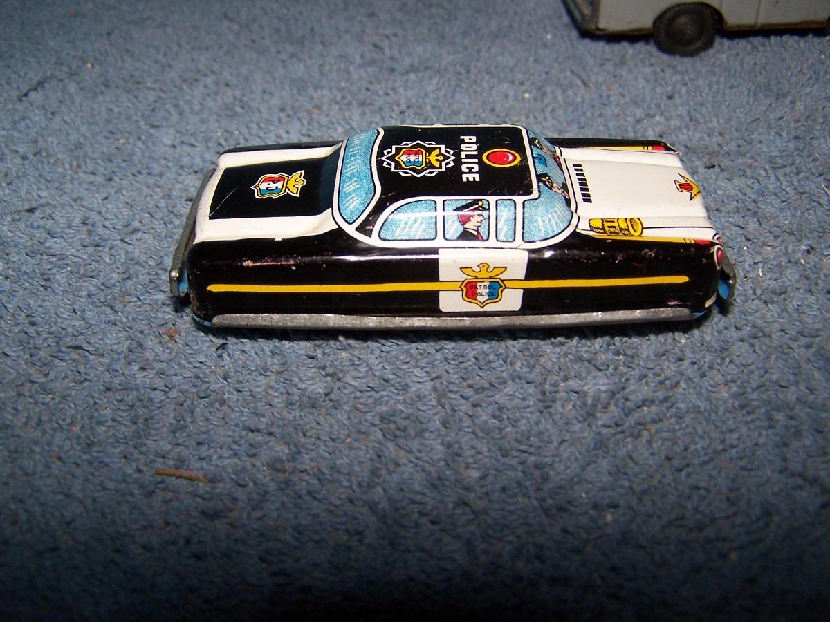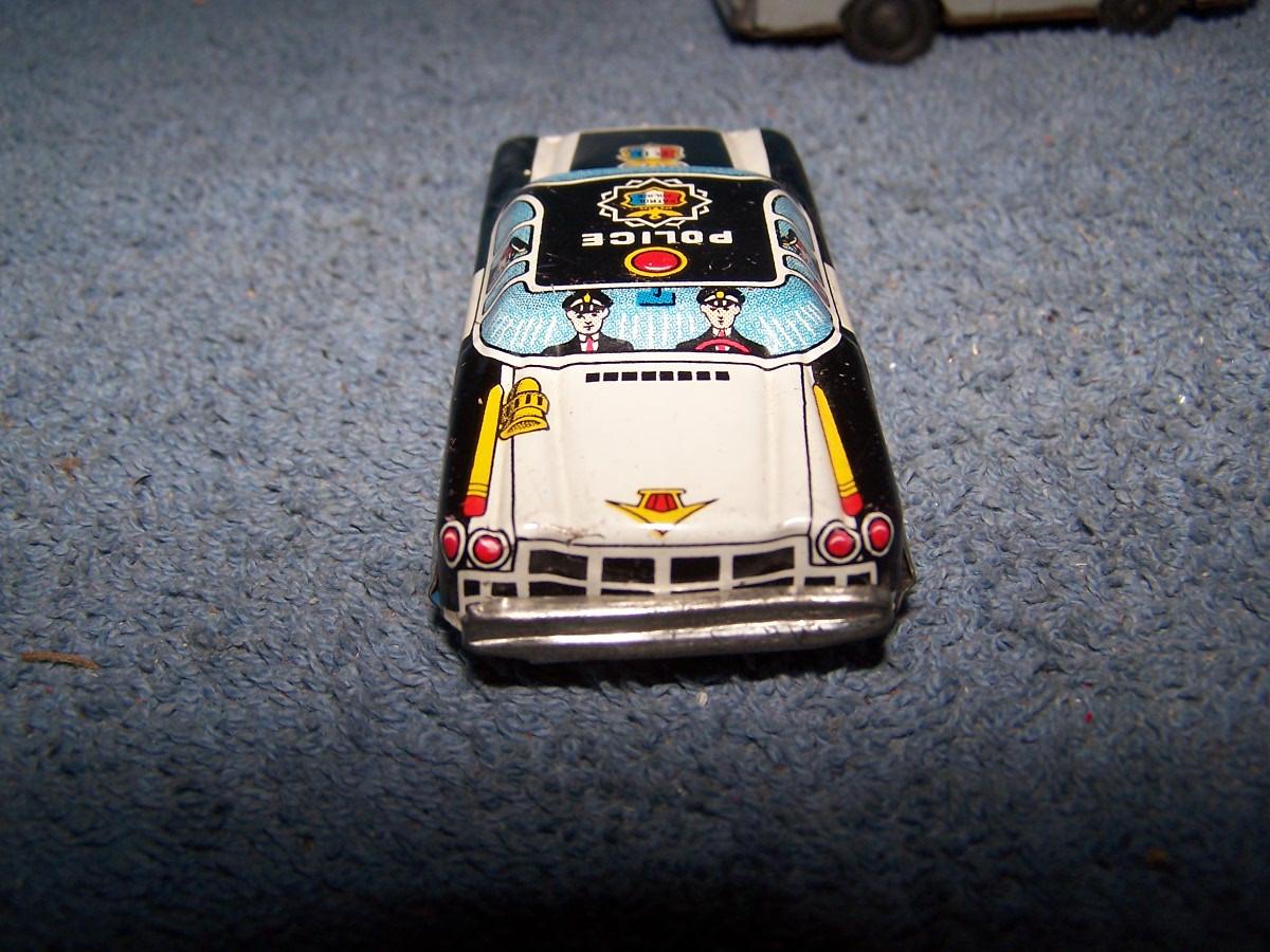 THESE ARE GREAT VINTAGE TIN LITHO CARS! POLICE CAR IS 3 1/2'' LONG, MISSING 1 TIRE.. FRICTION.. ALL TOYS HAVE BEEN PLAYED WITH..
