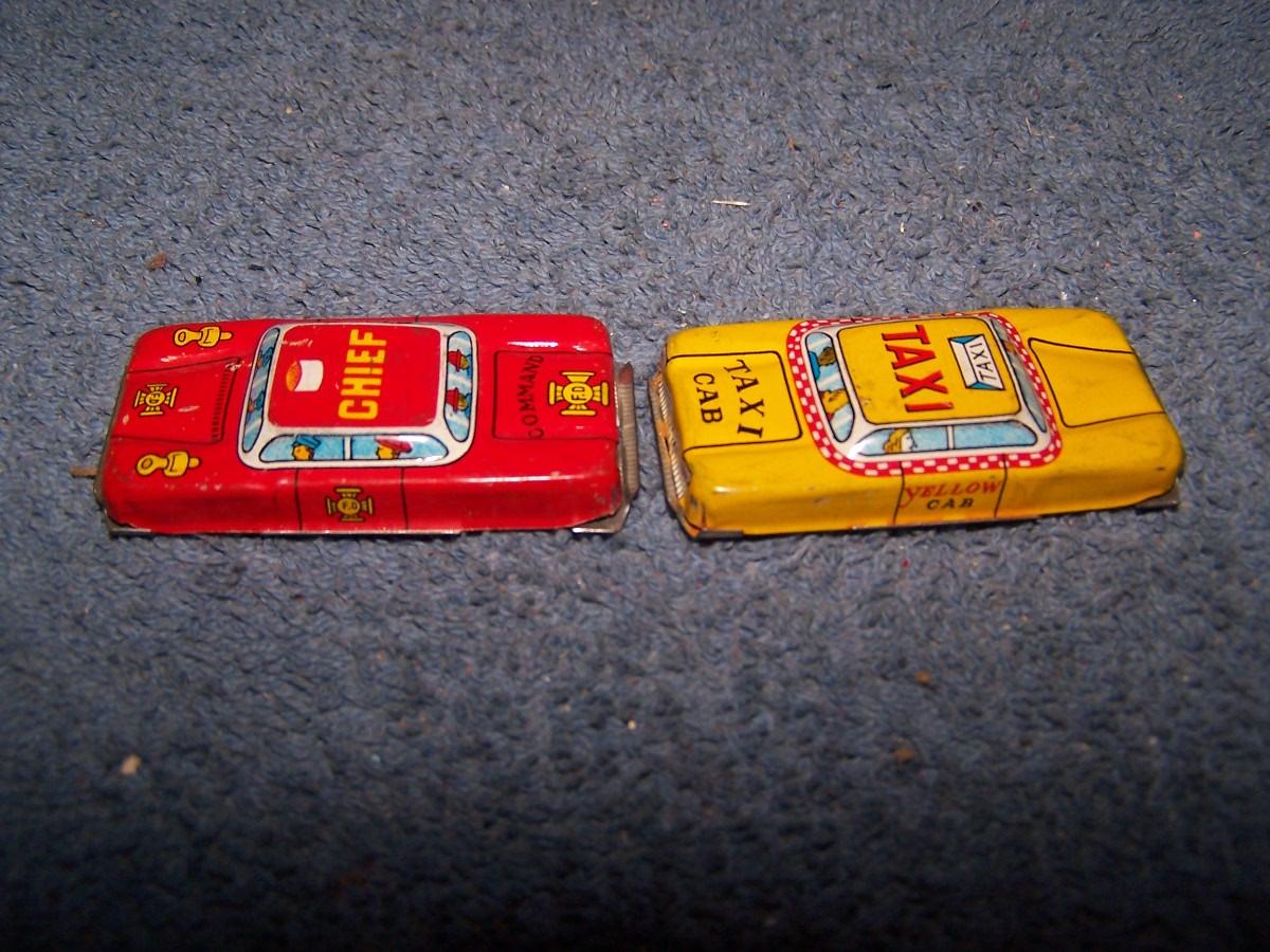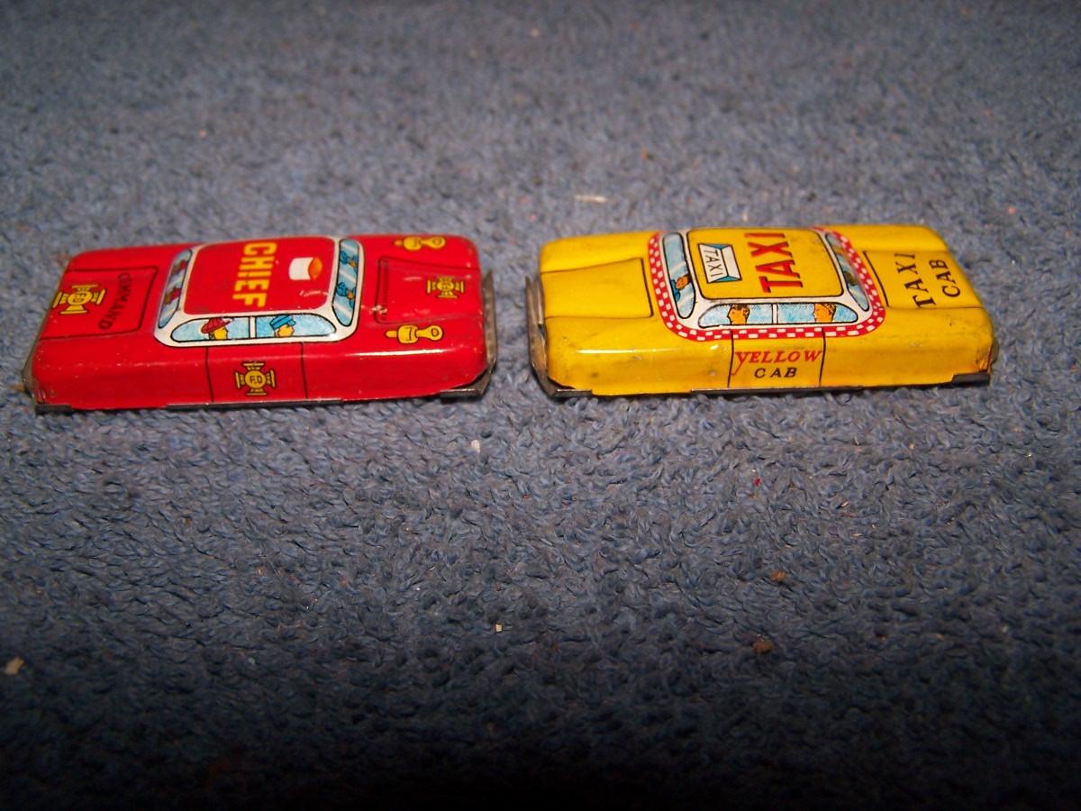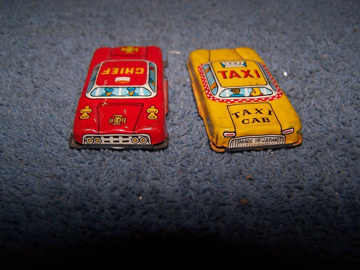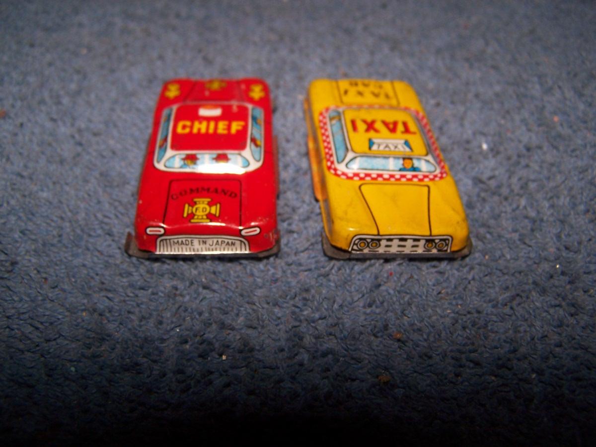 THESE ARE GREAT VINTAGE TIN LITHO CARS! POLICE CAR IS 3 1/2'' LONG, MISSING 1 TIRE.. FRICTION.. ALL TOYS HAVE BEEN PLAYED WITH..