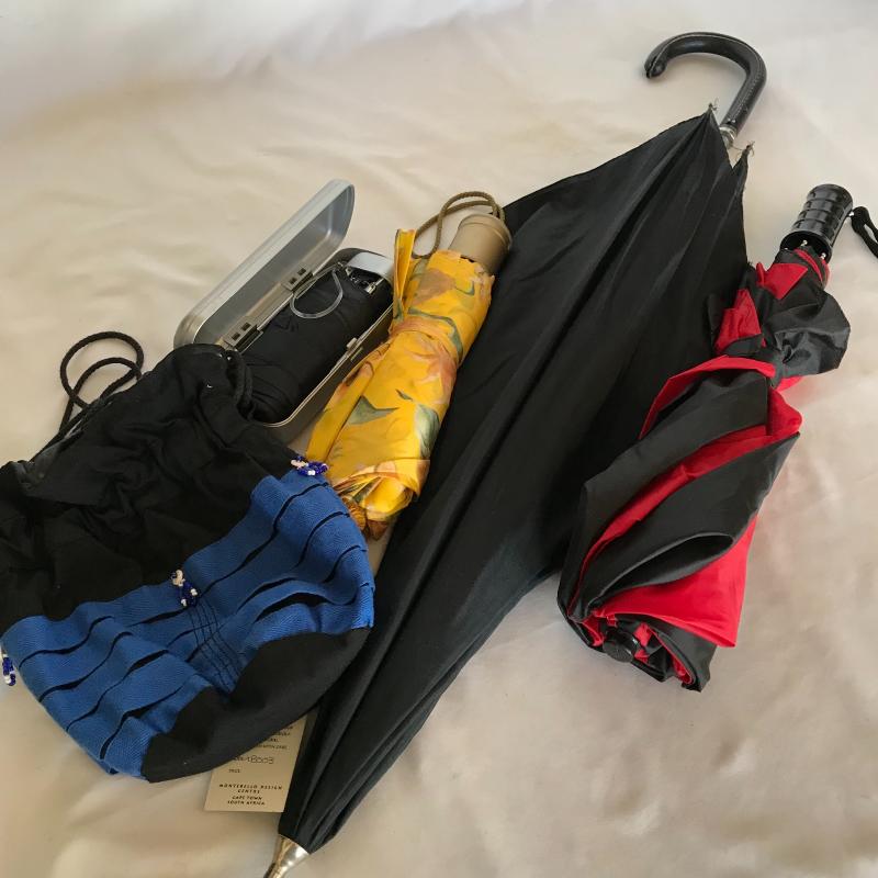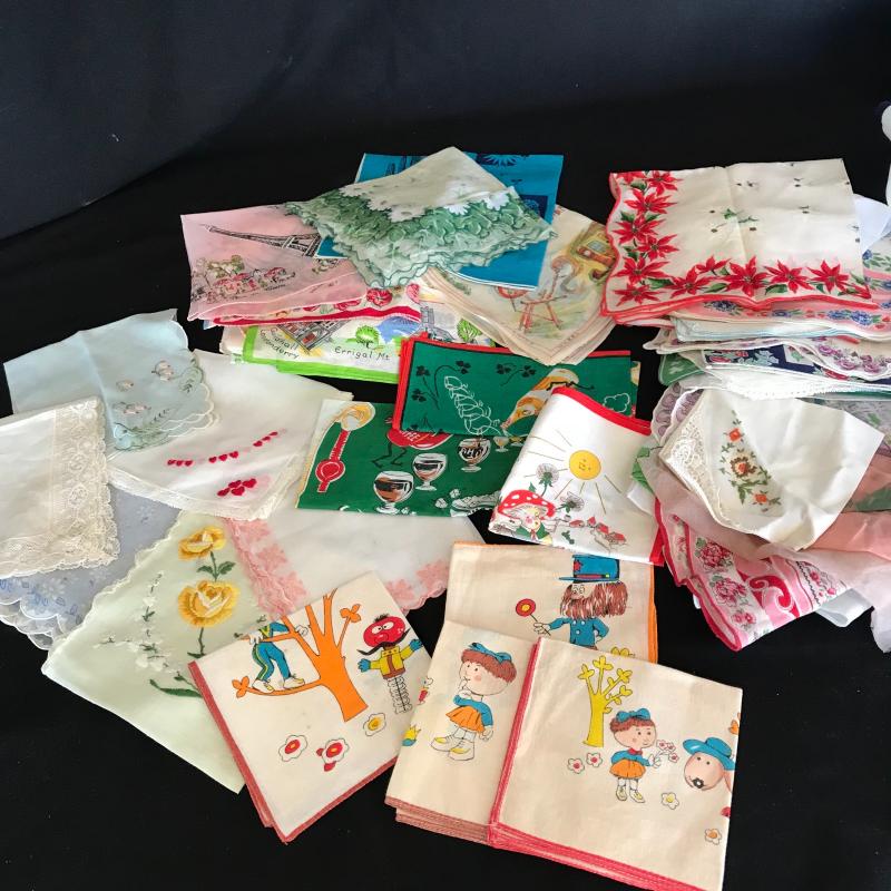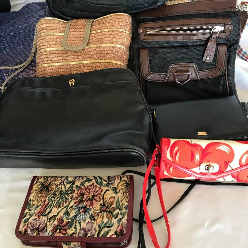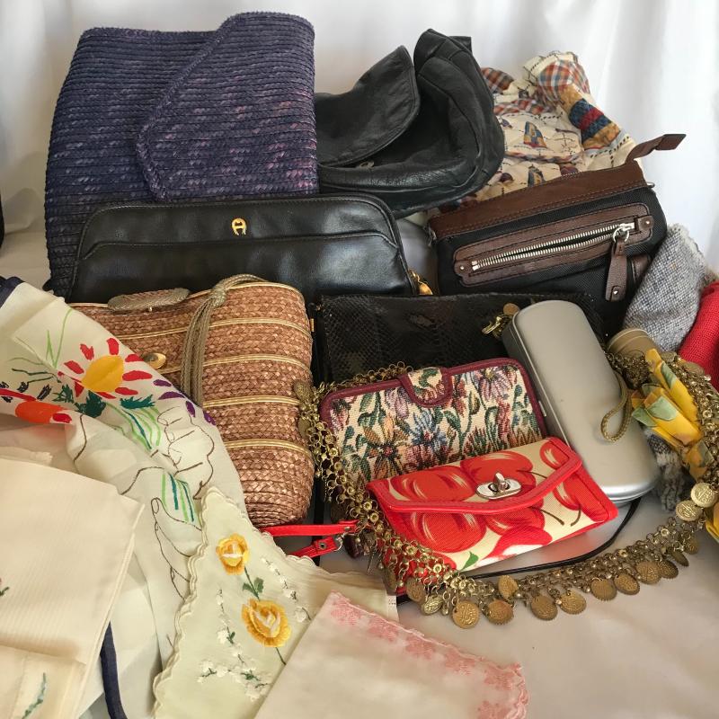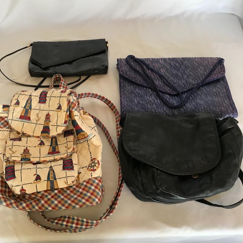 Large lot of purses for different occasions including Wilson’s Leather. Lot includes plethora of vintage handkerchiefs from delicate sheer to fun cartoons. Umbrellas and a lighthouse backpack are also included. See photos for entire inventory. No shipping.