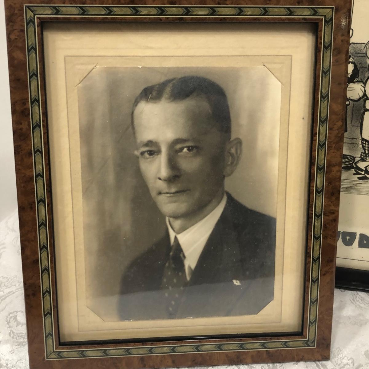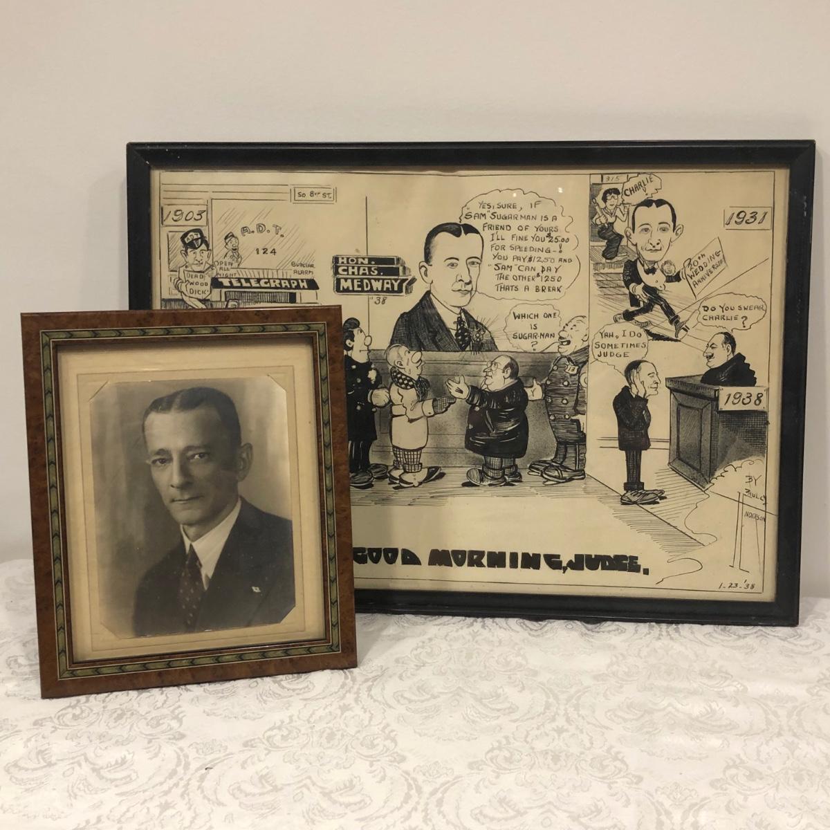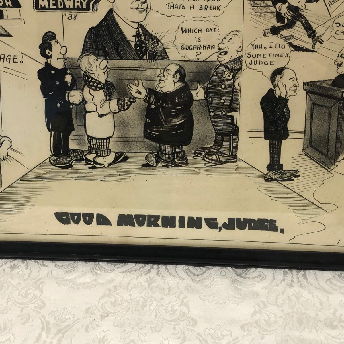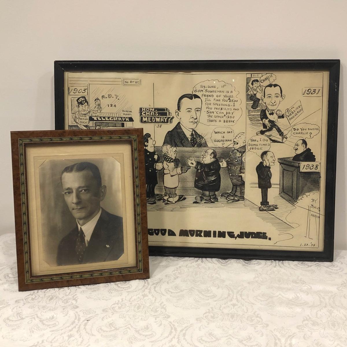 Photo measures 9.5 x 11.5 inches. Framed cartoon measures 23 x 16.5 inches.
