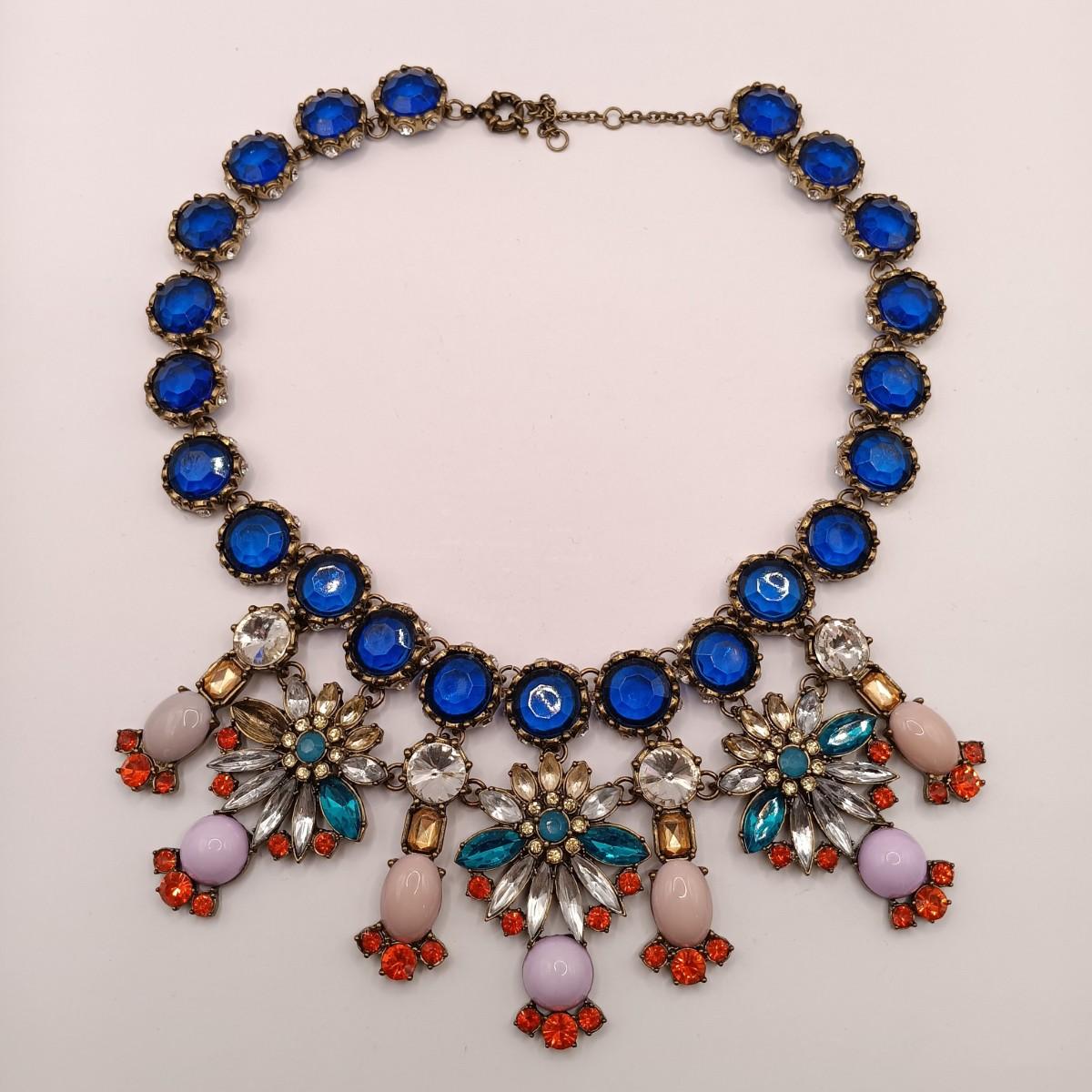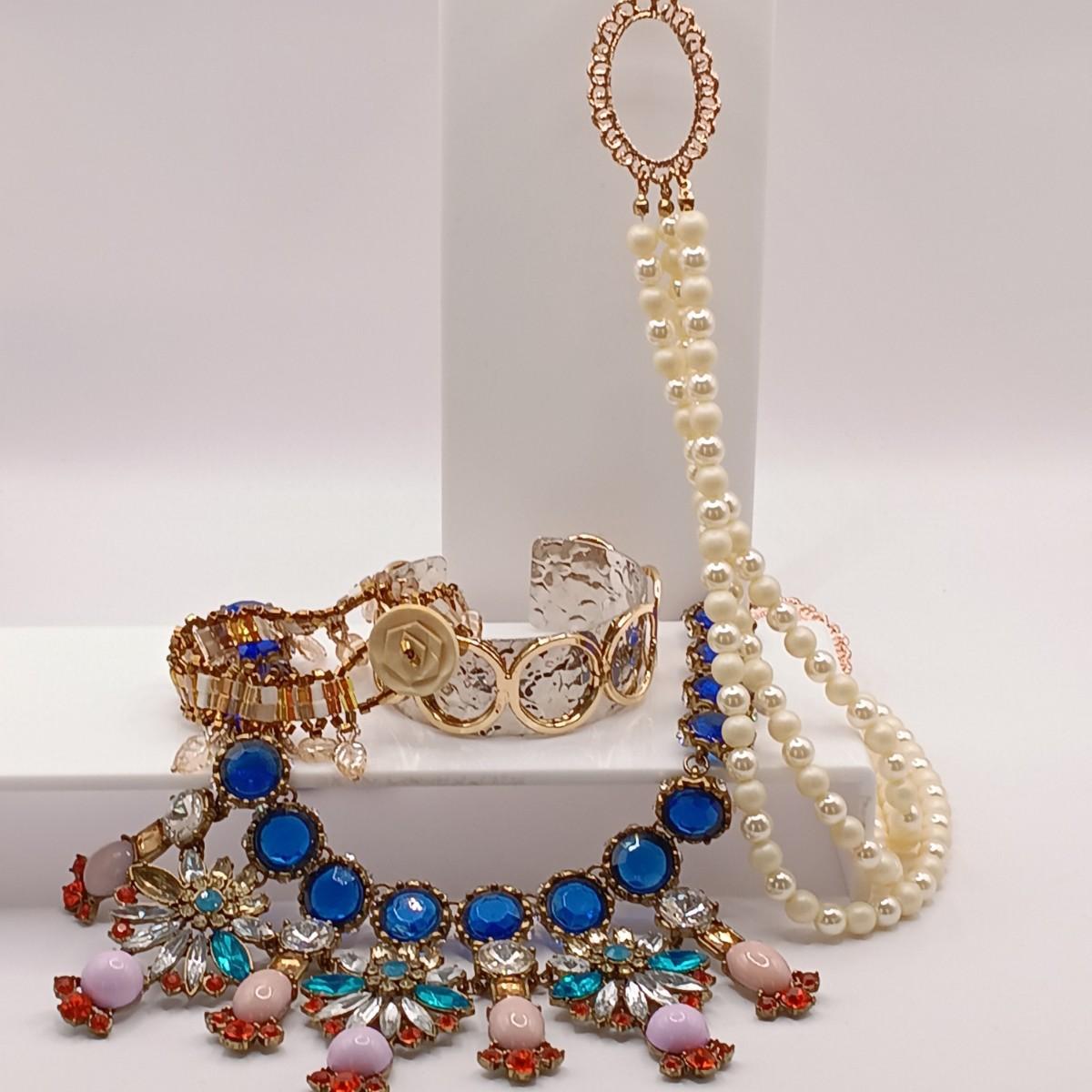 LOT 167: Multi-Color Rhinestone Statement Necklace w/ Multi-Strand Feaux Pearl Necklace, Metal Cuff & Stretch Bracelet