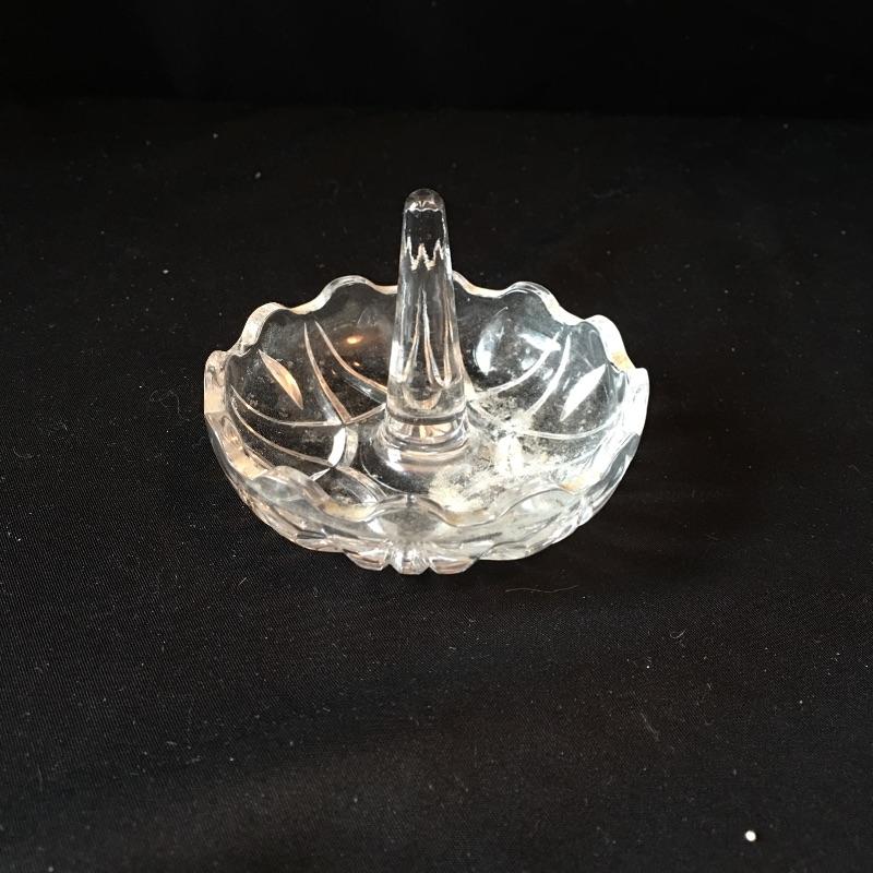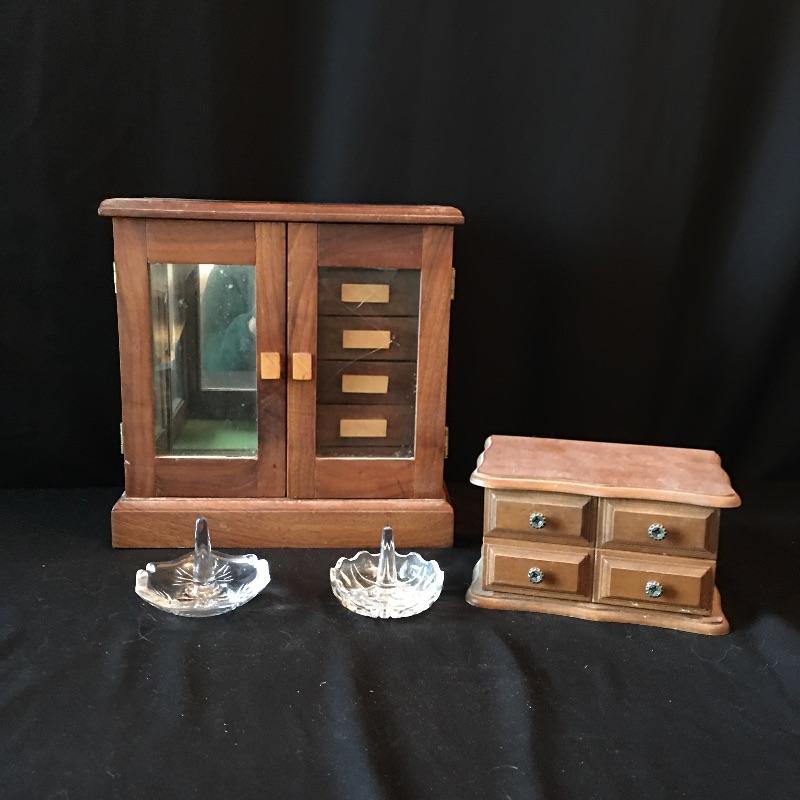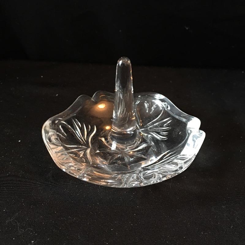 Lot includes signed Waterford ring stand to keep your nice rings safe. There are other jewelry holders like the small two part jewelry box, an unsigned ring stand, and a larger jewelry box. Larger jewelry box has cracked glass on door, see pictures.