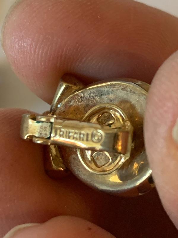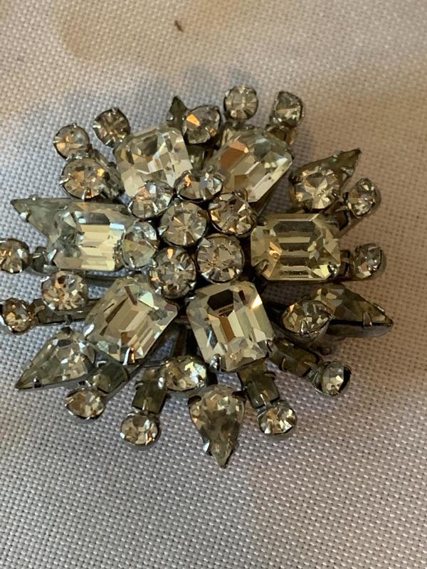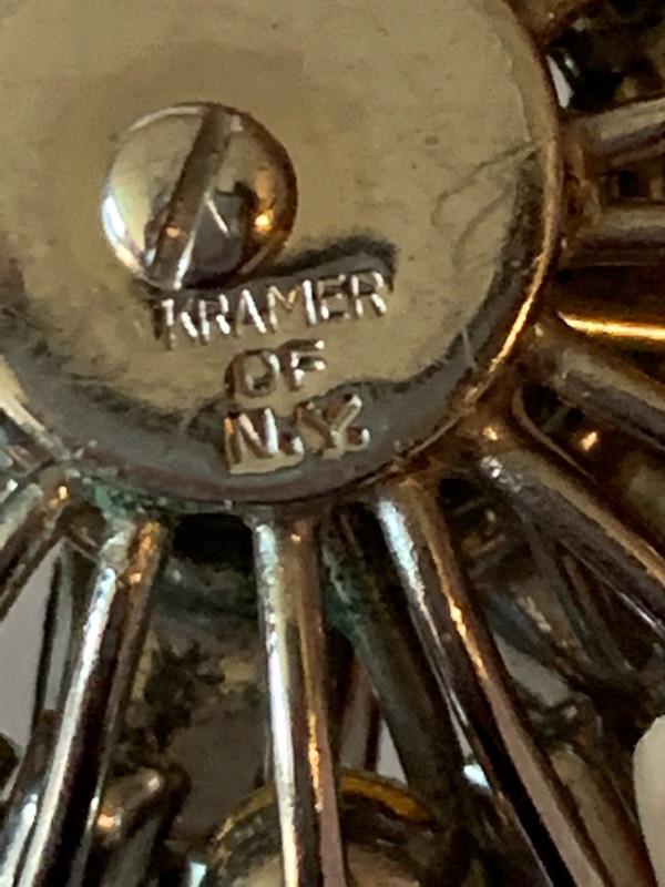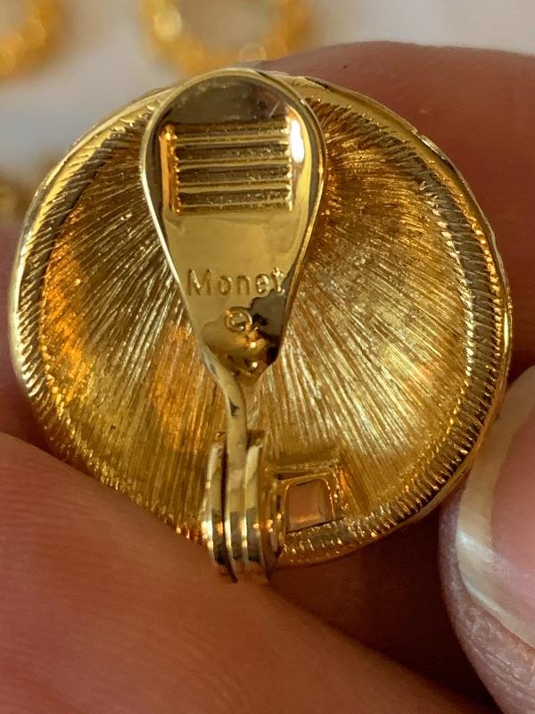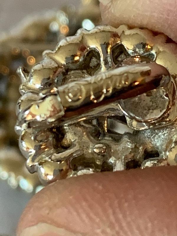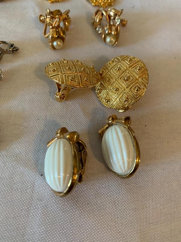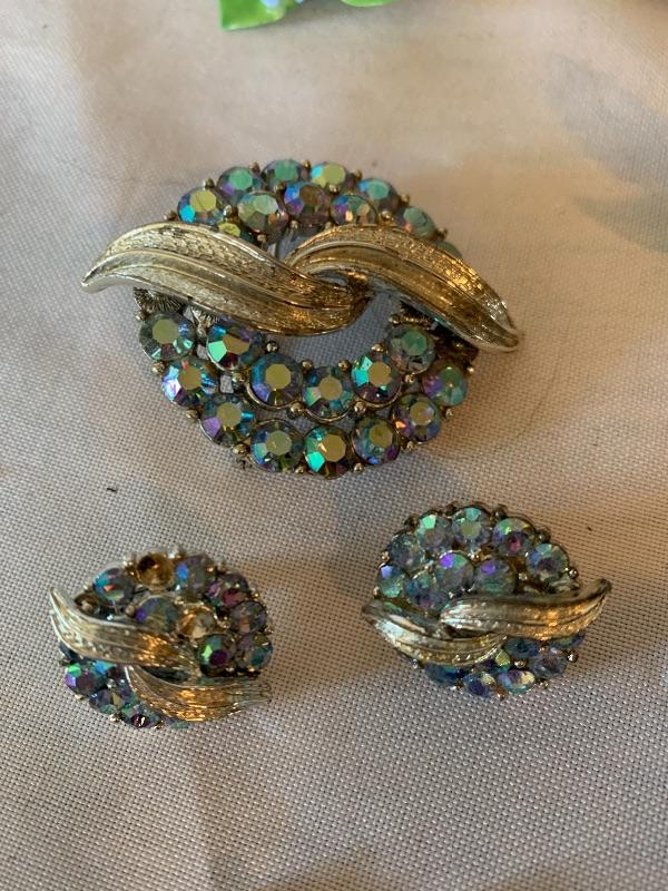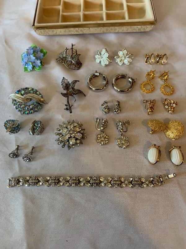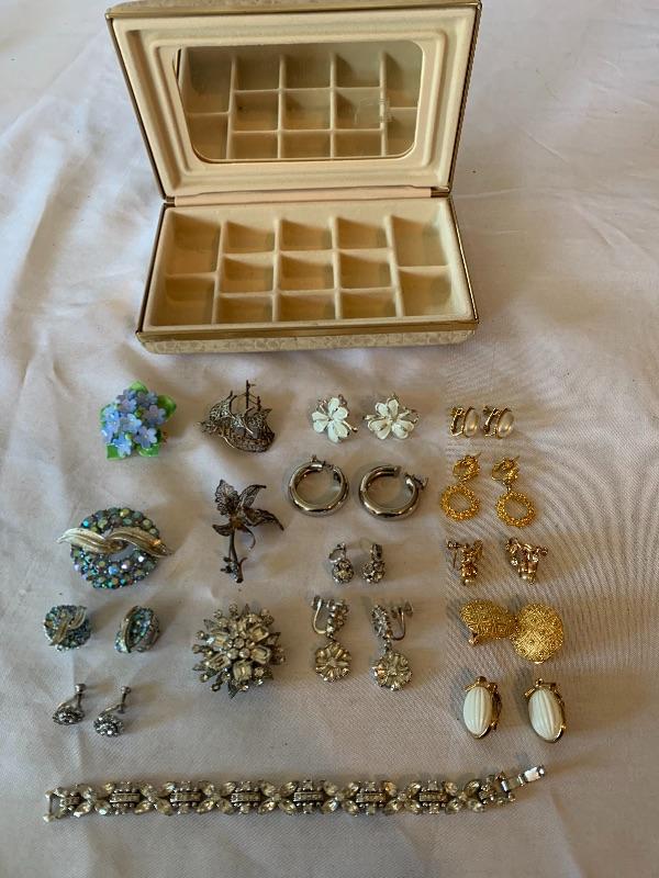 This classic collection has eleven pairs of clip earrings. Markings found include Sterling, Trifari, and Monet pairs. A lovely blue sparkle pin with matching earrings by Kramer of NY. Two delicate silver pins with the ship having 925 stamp. From sparkle to British classic this is a sweet lot that also includes a nice travel leather case that has some wear on the outside. Shipping available.