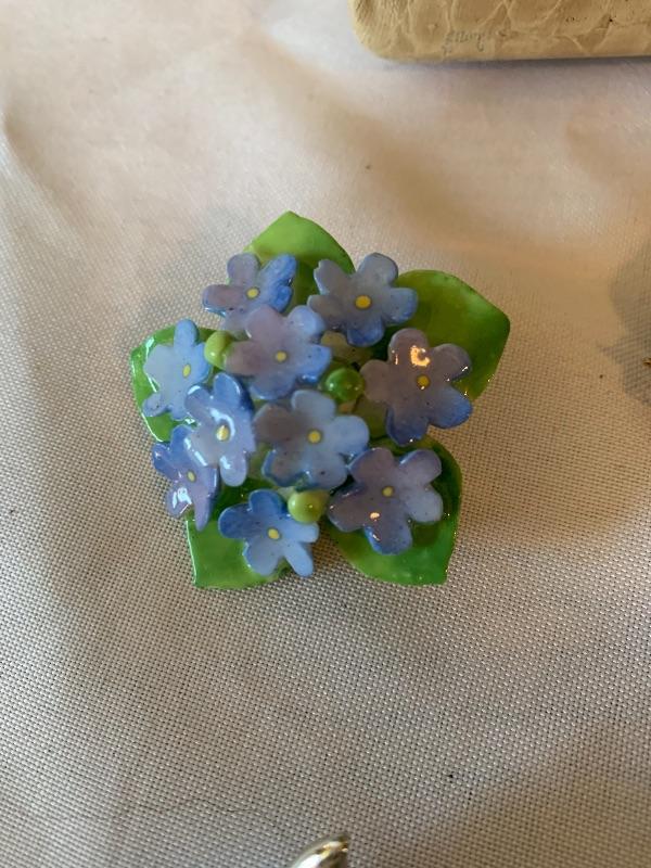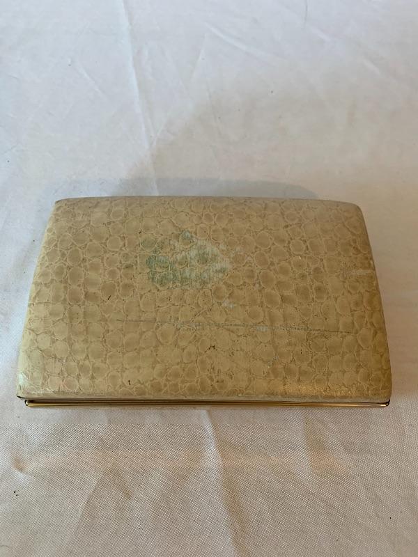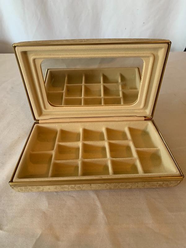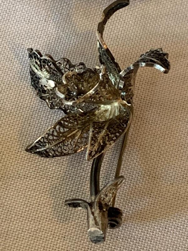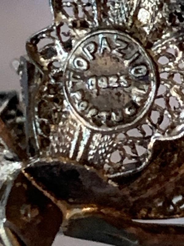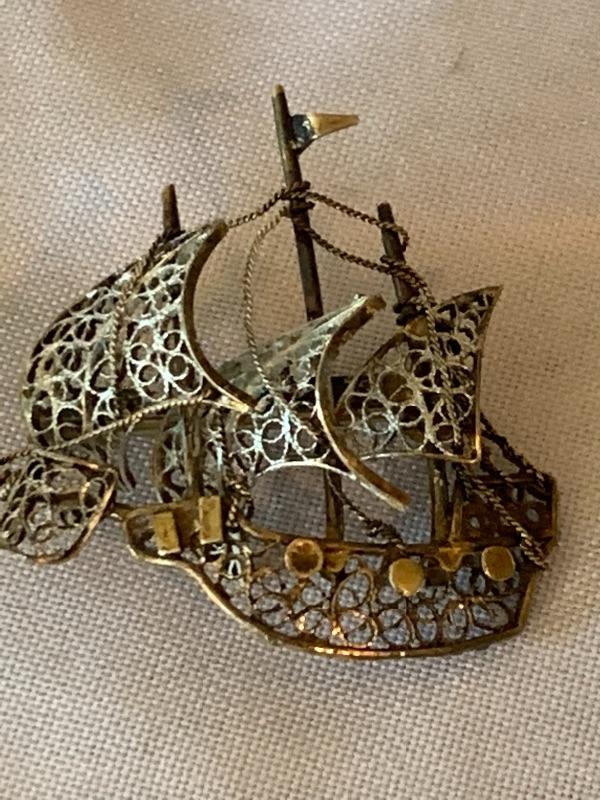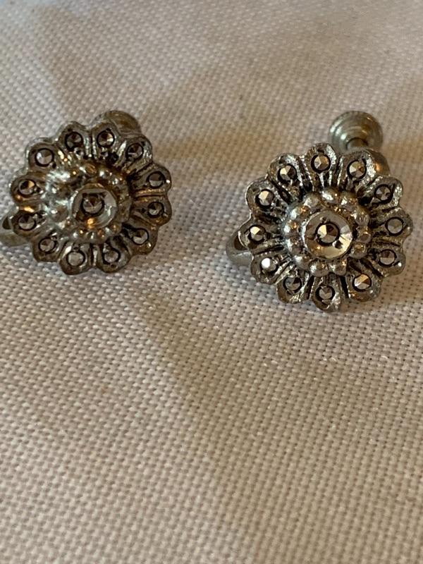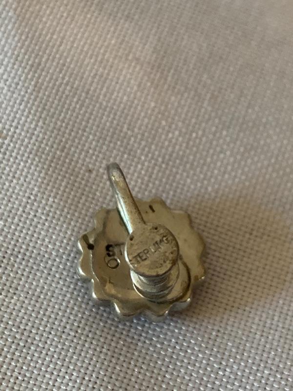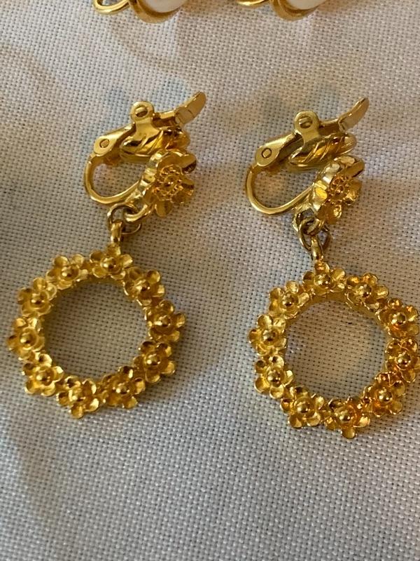 This classic collection has eleven pairs of clip earrings. Markings found include Sterling, Trifari, and Monet pairs. A lovely blue sparkle pin with matching earrings by Kramer of NY. Two delicate silver pins with the ship having 925 stamp. From sparkle to British classic this is a sweet lot that also includes a nice travel leather case that has some wear on the outside. Shipping available.