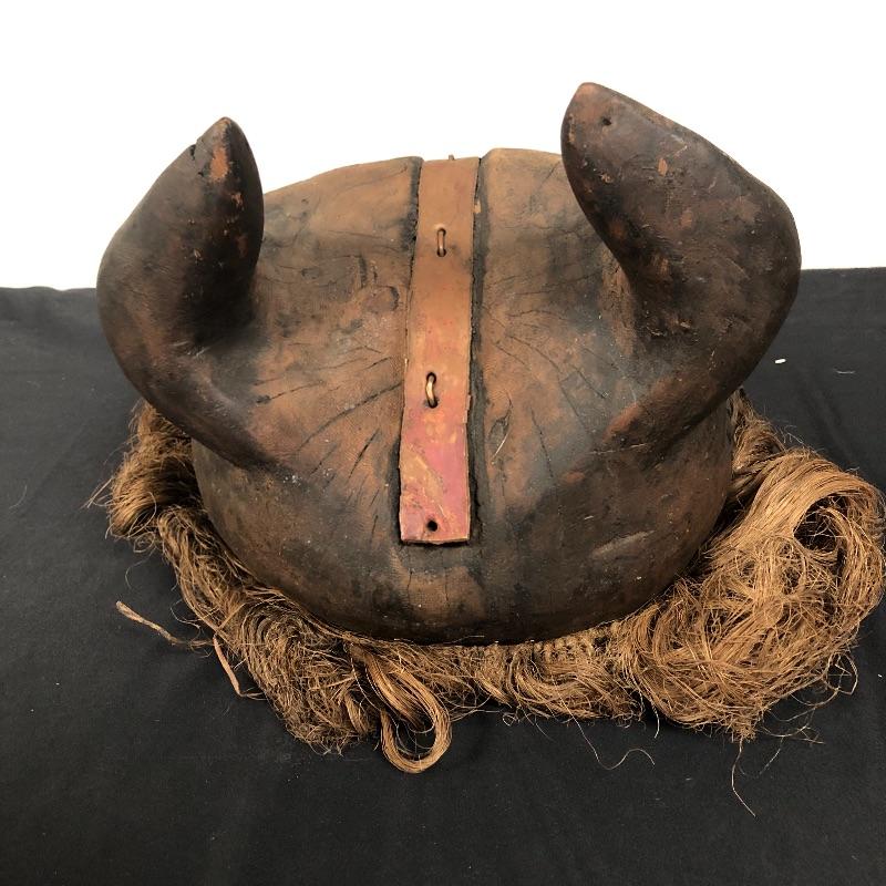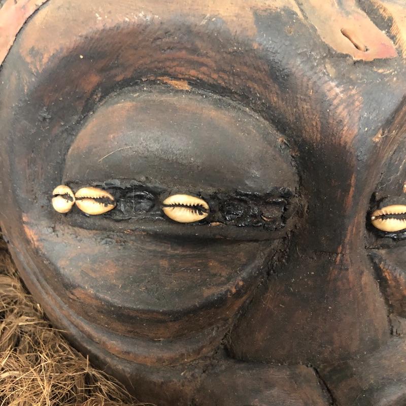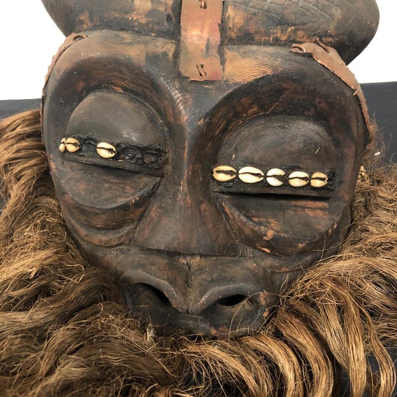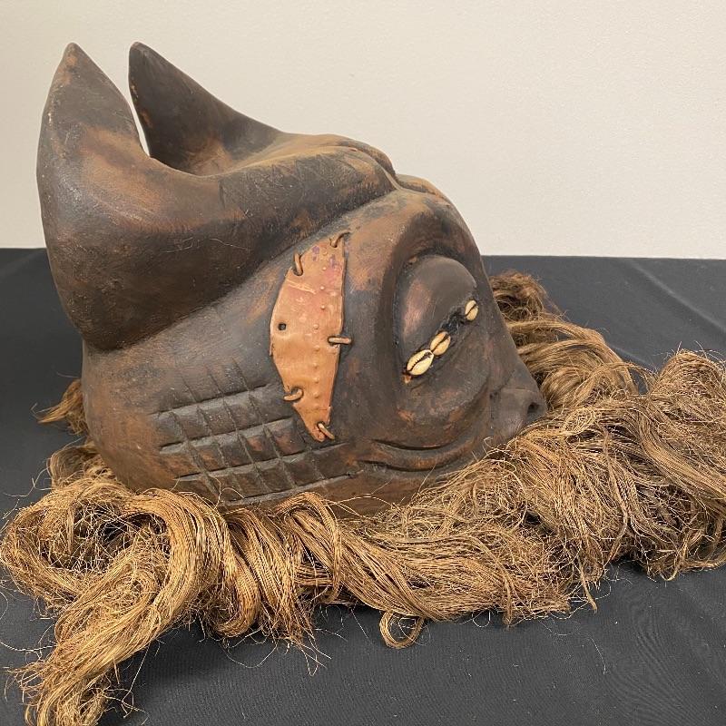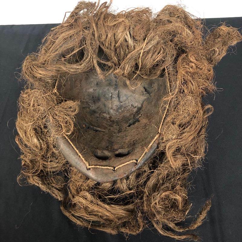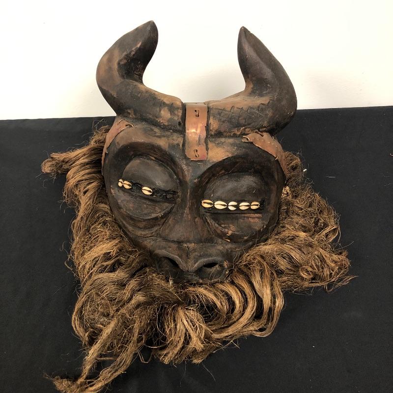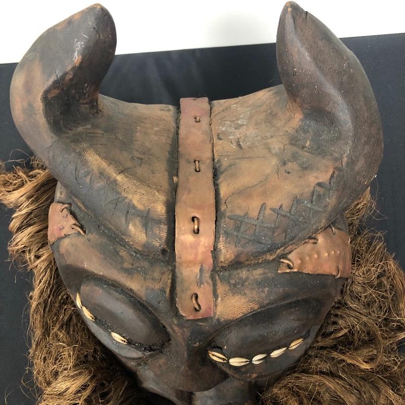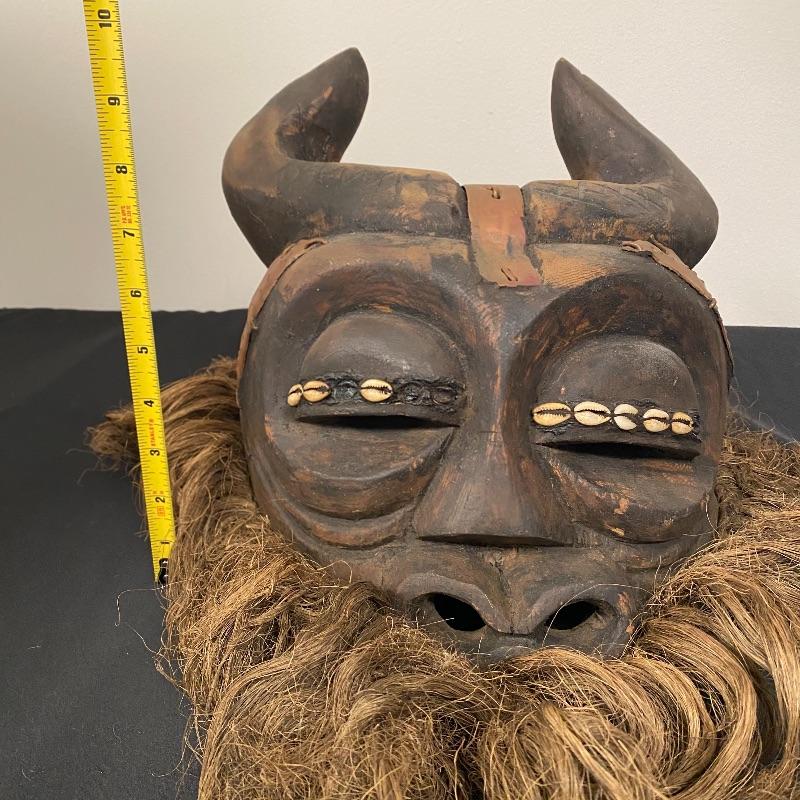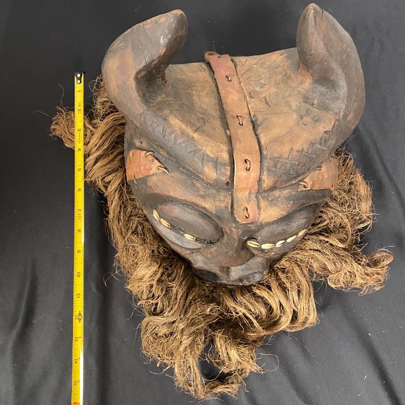 This large mask (12” x 13” x 8”) has horns with shells on the eyes. It is missing a few shells on one of the eyes. Is also has hair made out of rope like material and a copper attachments on the head. Please get quote prior to shipping as this is large.