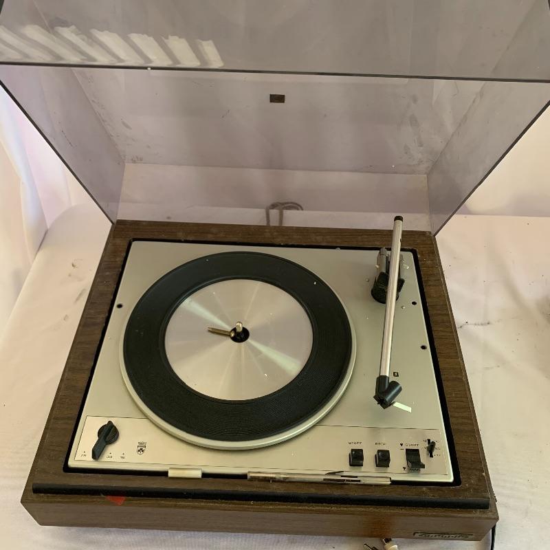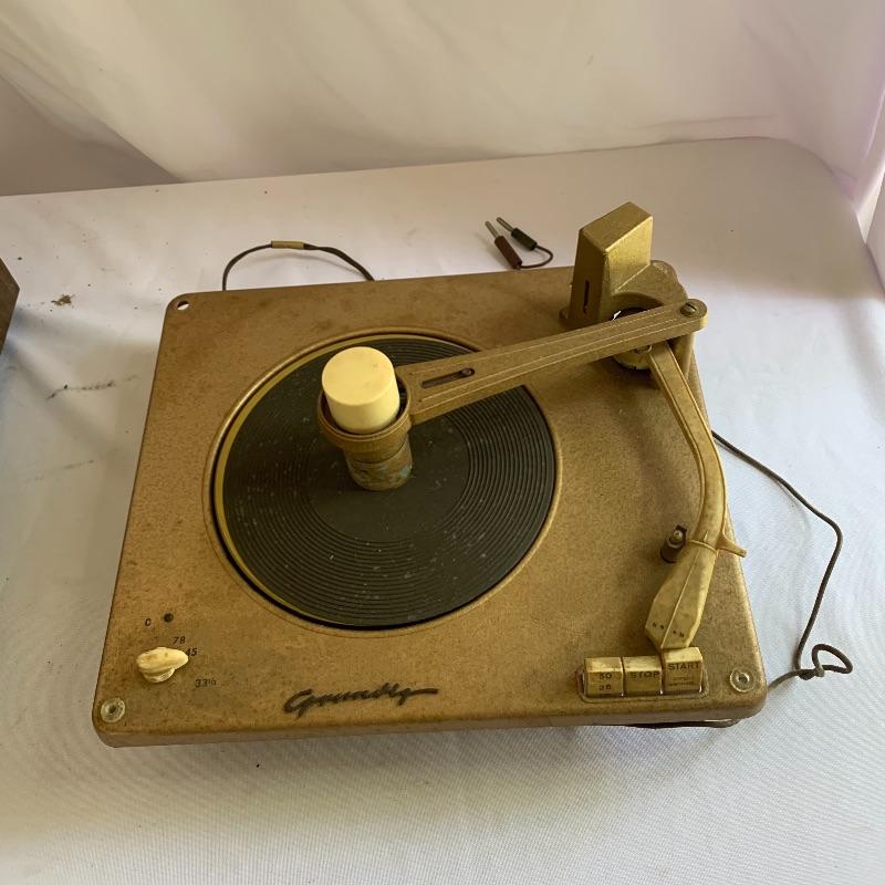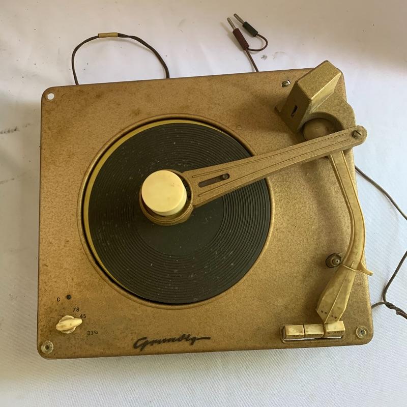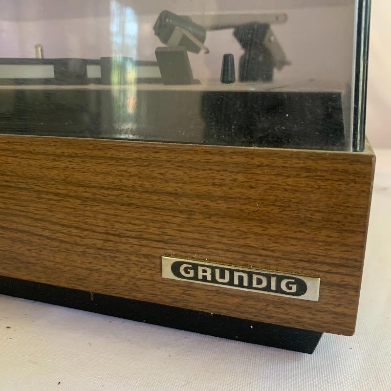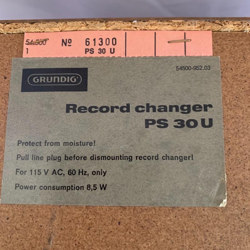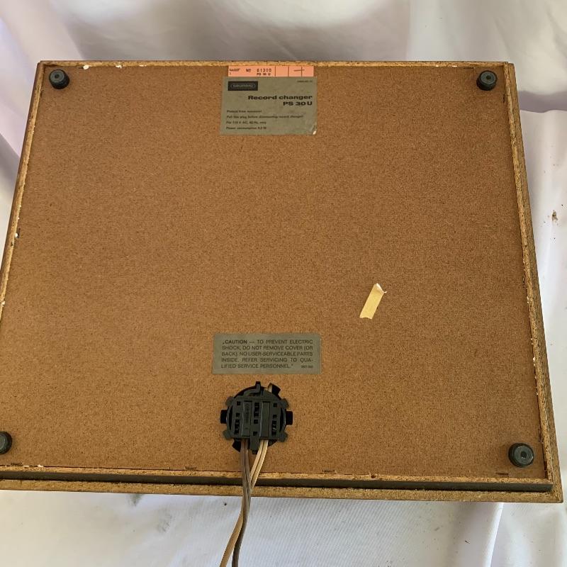 This lot includes one Grundig Record Changer PS 30 U and one Grundig AG 1003 D record turntable. The Grundig PS 30 U has a couple pieces that came with the record changer (see pictures). The stylus base is broken and the top of the stylus is missing. The record changer measures about 14.5in x 16.5in x 8in with the plastic top included. The Grundig AG 1003 D is only the turn table not the box and top. One of the cords is severed (see photos) and the dial appears to be broken. It measures about 12in x 13.5in. Cannot confirm either turntable works.
