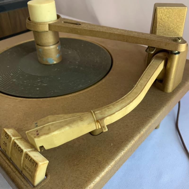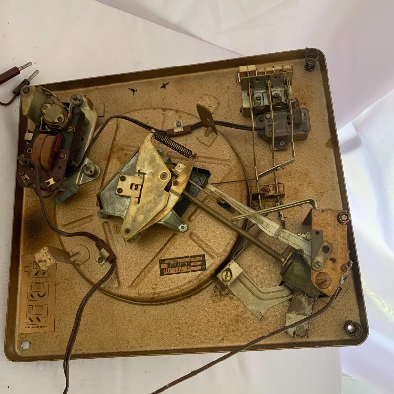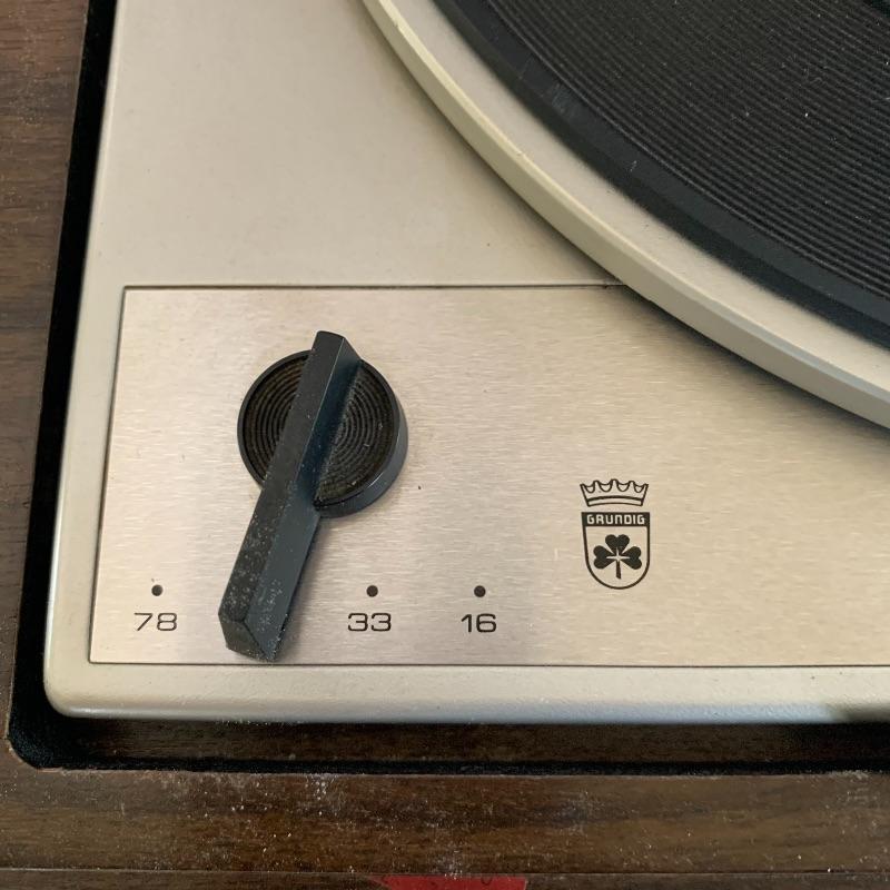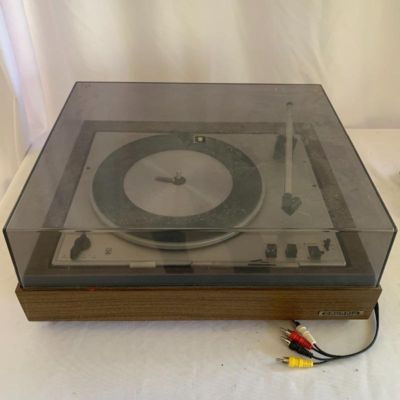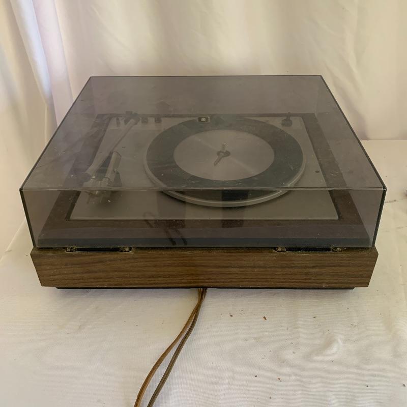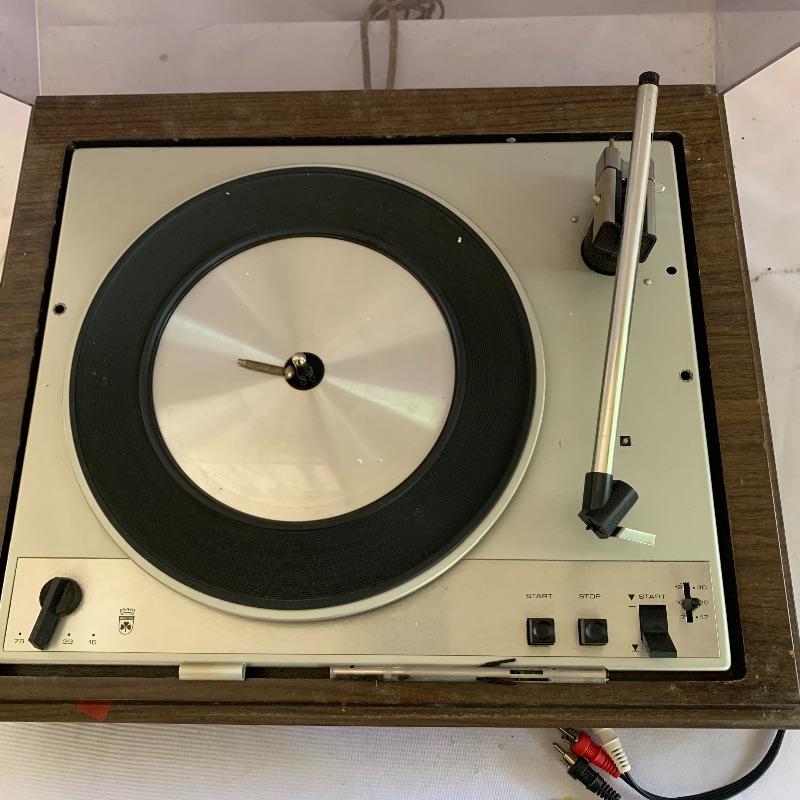 This lot includes one Grundig Record Changer PS 30 U and one Grundig AG 1003 D record turntable. The Grundig PS 30 U has a couple pieces that came with the record changer (see pictures). The stylus base is broken and the top of the stylus is missing. The record changer measures about 14.5in x 16.5in x 8in with the plastic top included. The Grundig AG 1003 D is only the turn table not the box and top. One of the cords is severed (see photos) and the dial appears to be broken. It measures about 12in x 13.5in. Cannot confirm either turntable works.