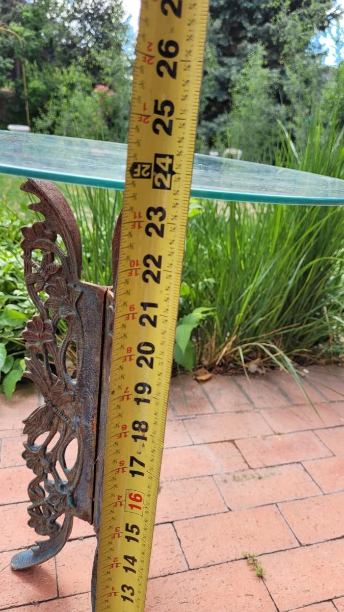 Can also be used as a plant stand without the glass. Base is a bit rusty with remnants of green paint.