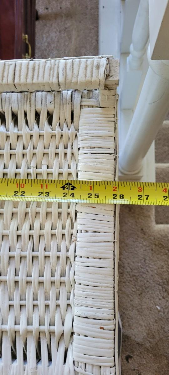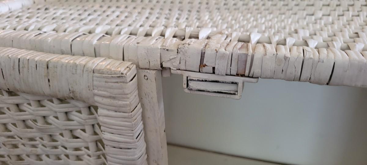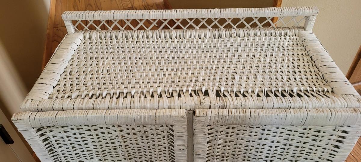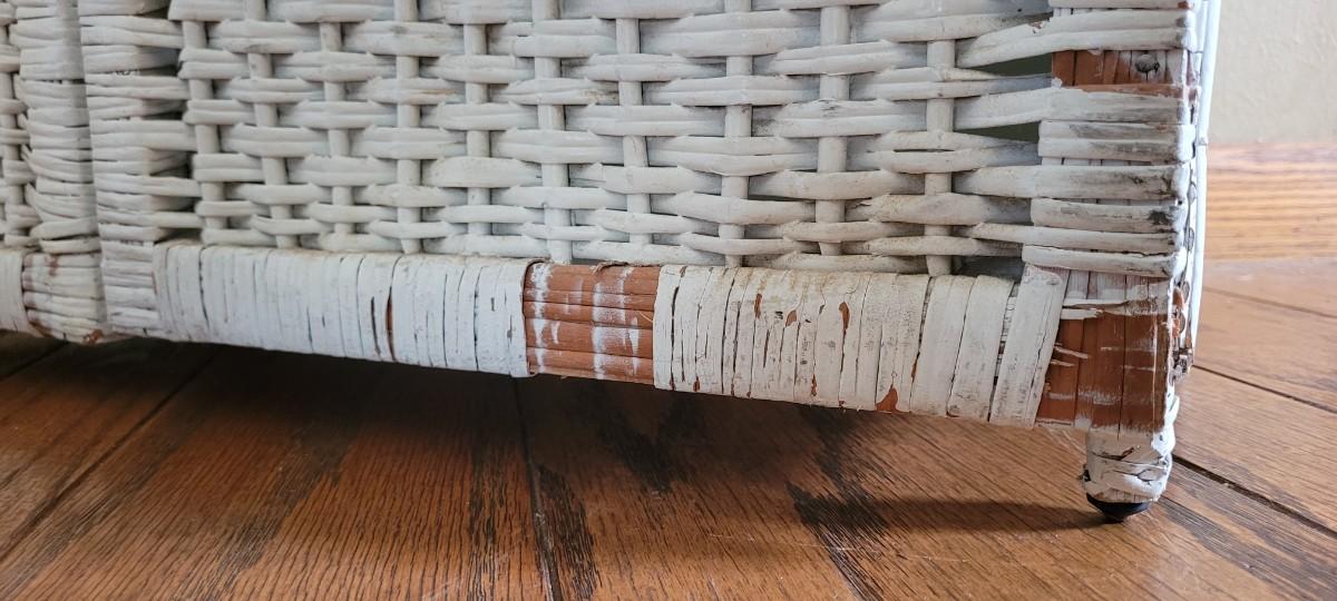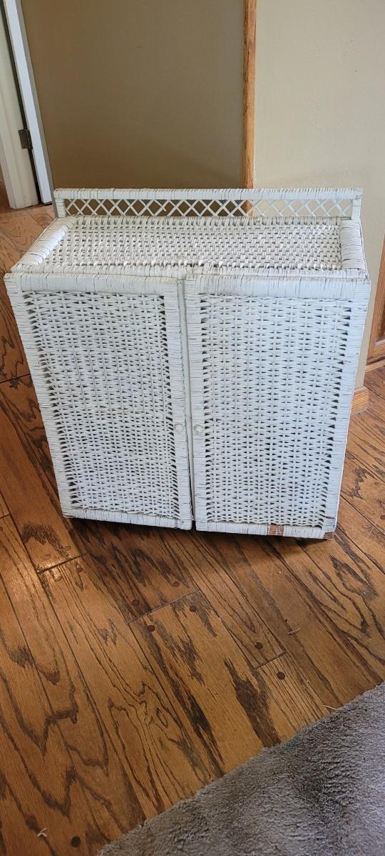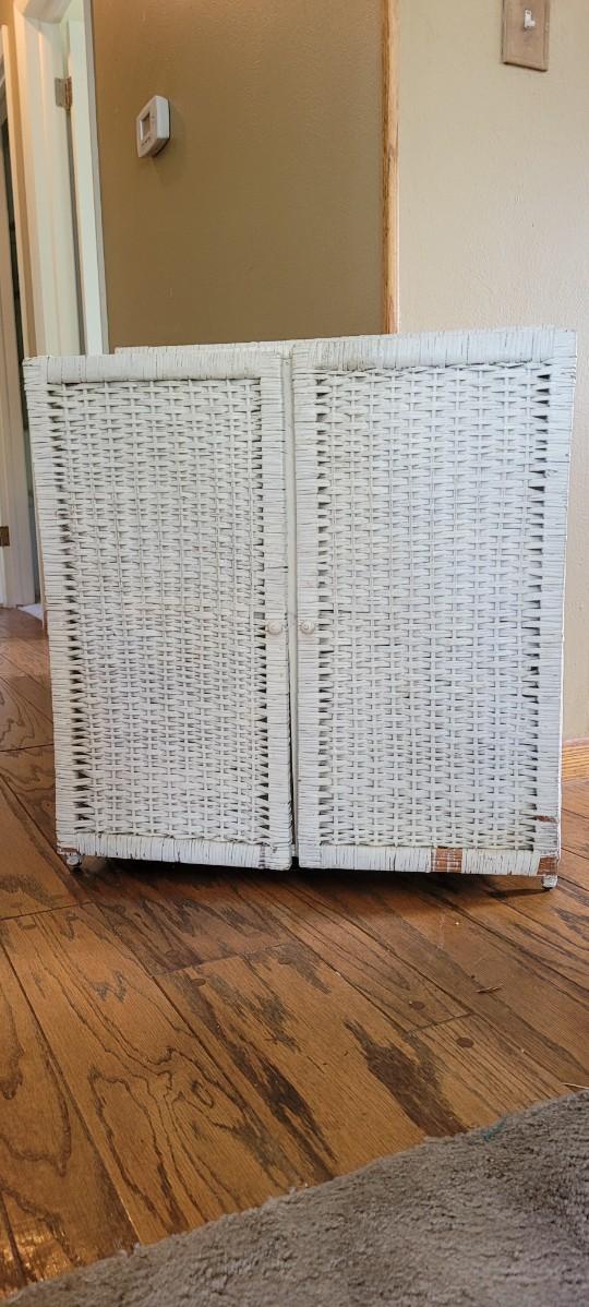 Two Door Vintage Wicker Storage Cabinet that shows a bit of wear to one of the lower sections of the door.
