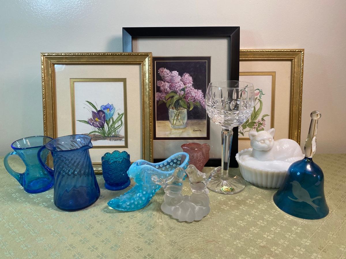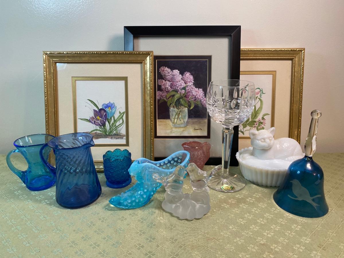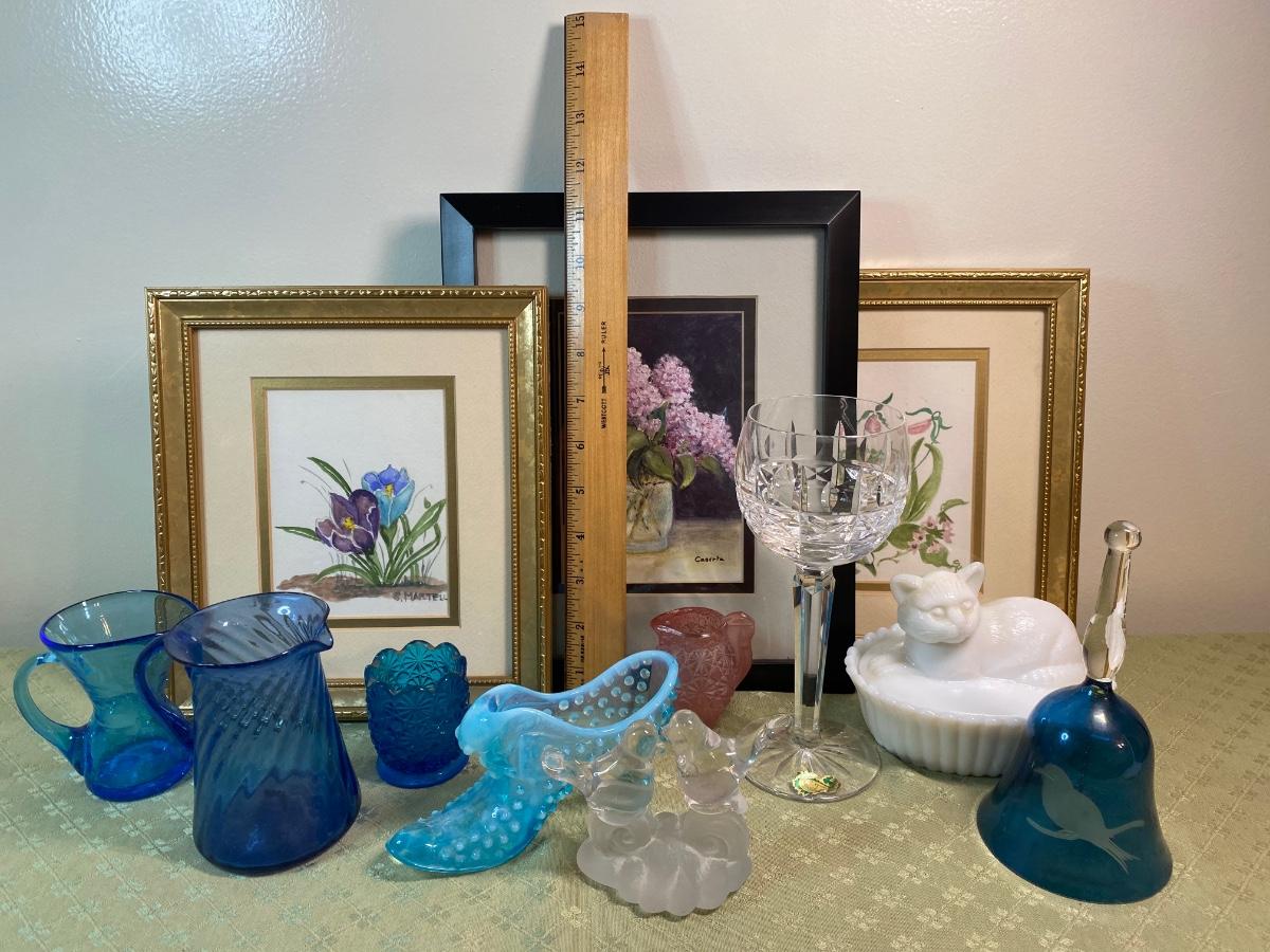 Waterford Crystal Glass, three decorative framed prints, colored glass trinkets and clear glass love birds.Please see all pictures as they are the best representation of the items. The pictures show condition, measurements if taken, and what is included in the lot. Due to the large amount that we photograph and the time frame, we are not always able to take measurements. All items unless noted, are pre-owned and have been used. If you purchased furniture, you must bring help. We do not allow one person to carry large furniture out on their own. Bring help, tools and a truck for the safety of our client’s homes, and your personal safety. Any damages that result to the property including walls, and floors due to moving of the furniture will be charged to the buyer. Company policy. Thank you.