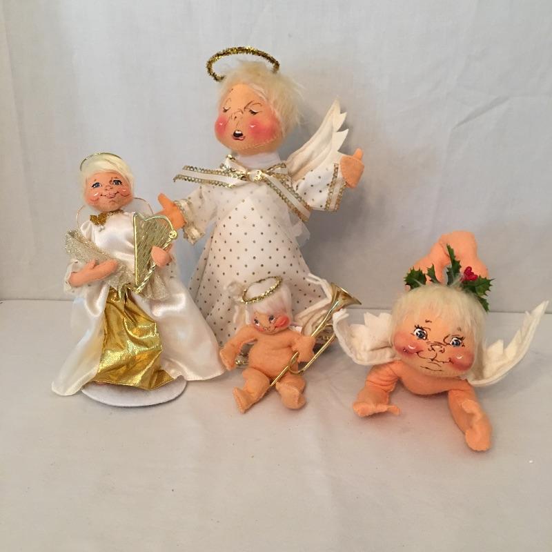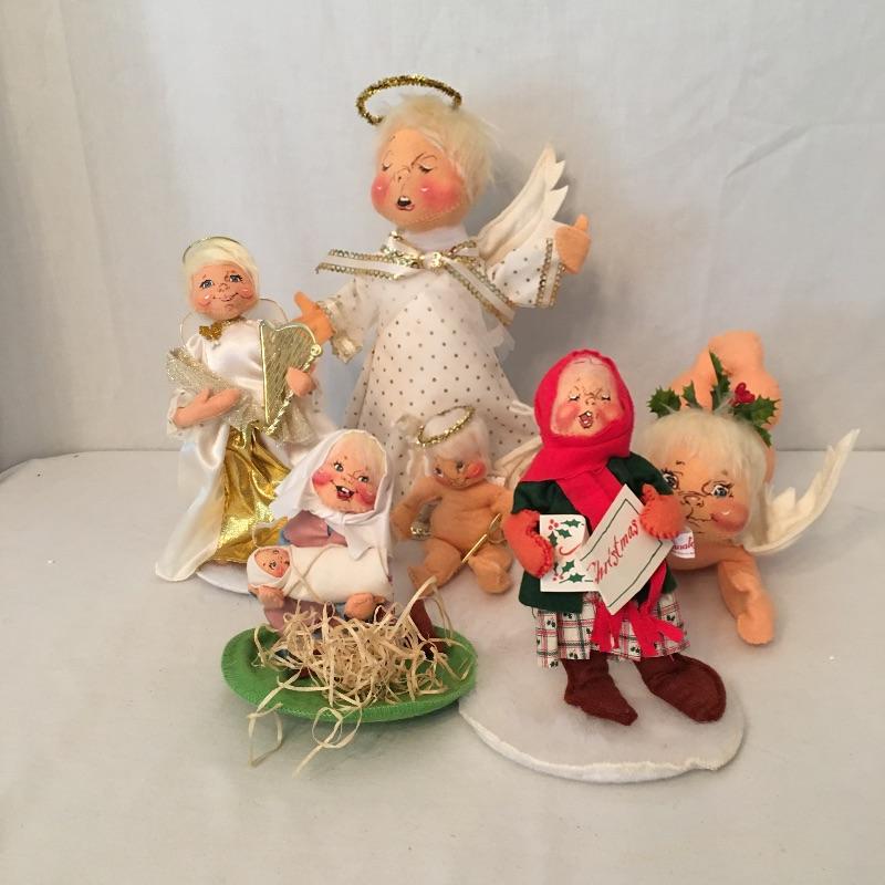 Superb collection of Annalee angels that includes four angels, a caroler and a mother with child. Get your Annalee Collection started with these whimsical angels. See images for the year these lovelies were made. Largest angel measures 12” tall.