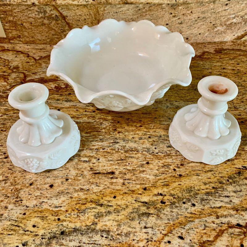 Antique milk glass ruffled bowl and 2 candle holders. Grape pattern
