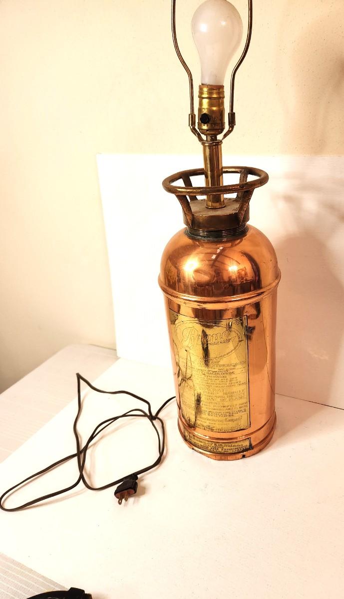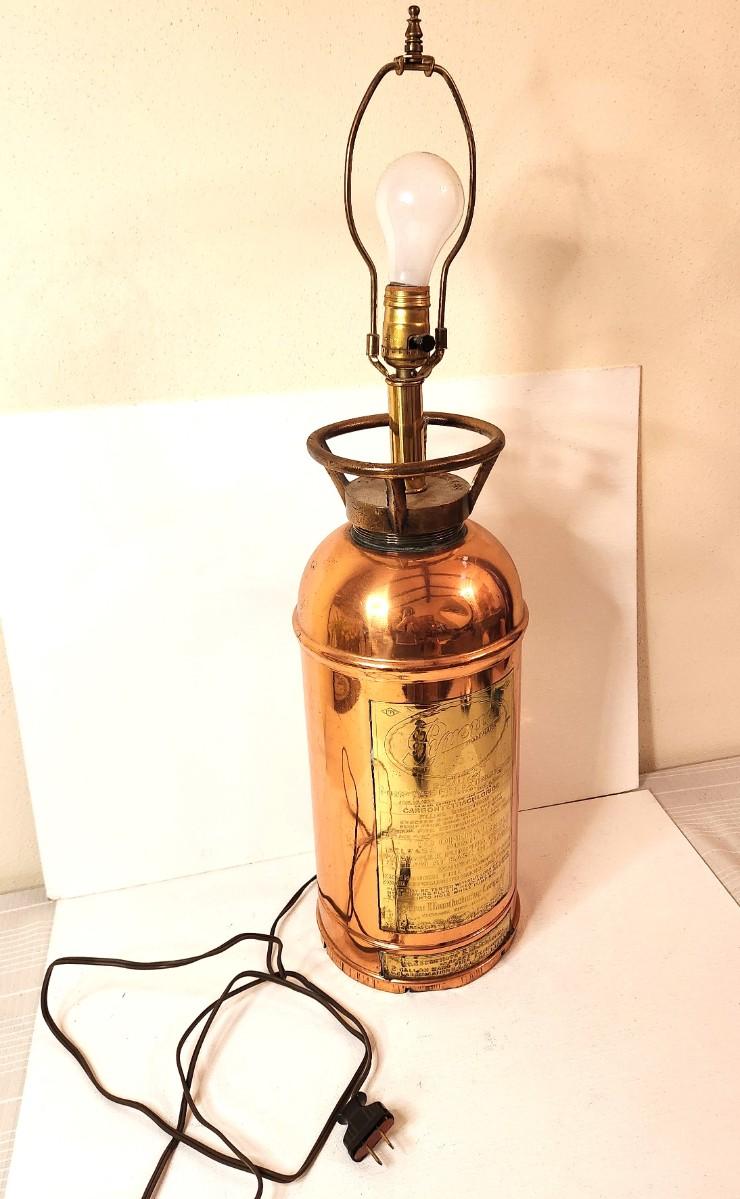This antique Pyrene First Extinguisher is a beauty - turned into a table lamp - no shade - works. From Newark, NY. 29" tall.