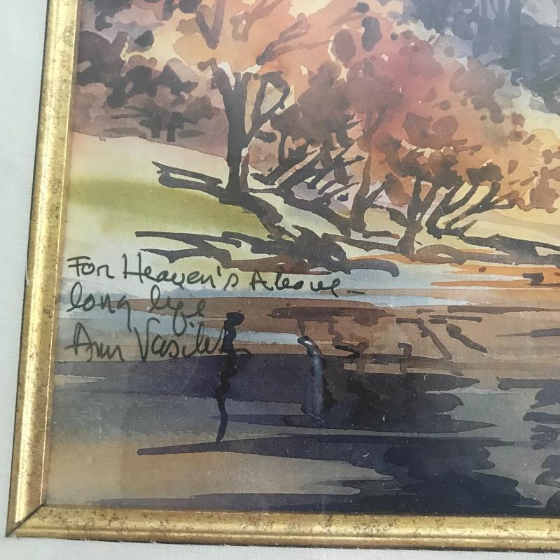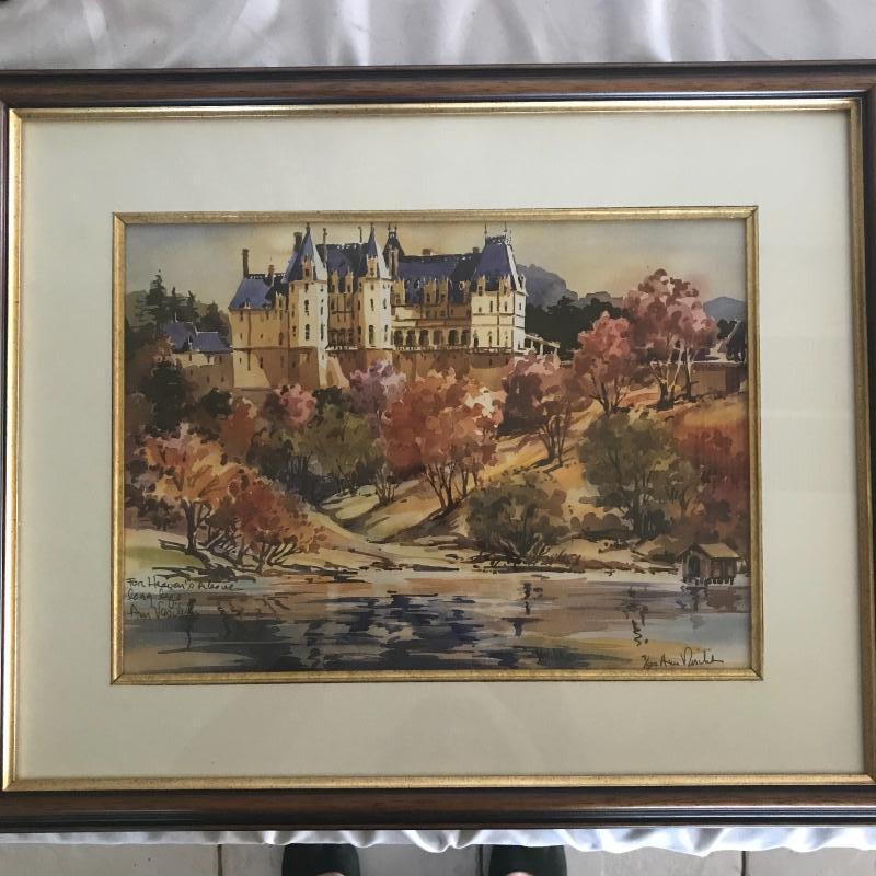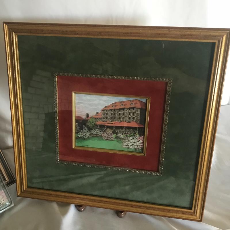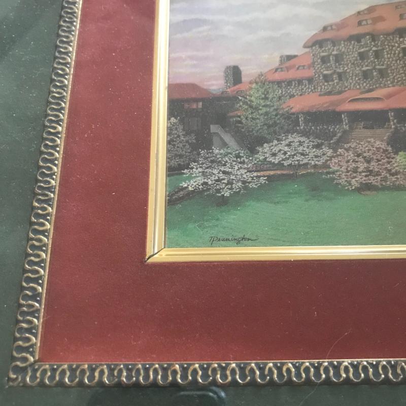 Biltmore Estate numbered print 9/500 by Ann Vaslik with special message “For Heavens Above long life” “˜A Guide to Biltmore Estate’ book, Grove Park Inn note cards and matching double matted framed art by T. Pennington and Groce Arcade Pottery piece. Local pick up only.