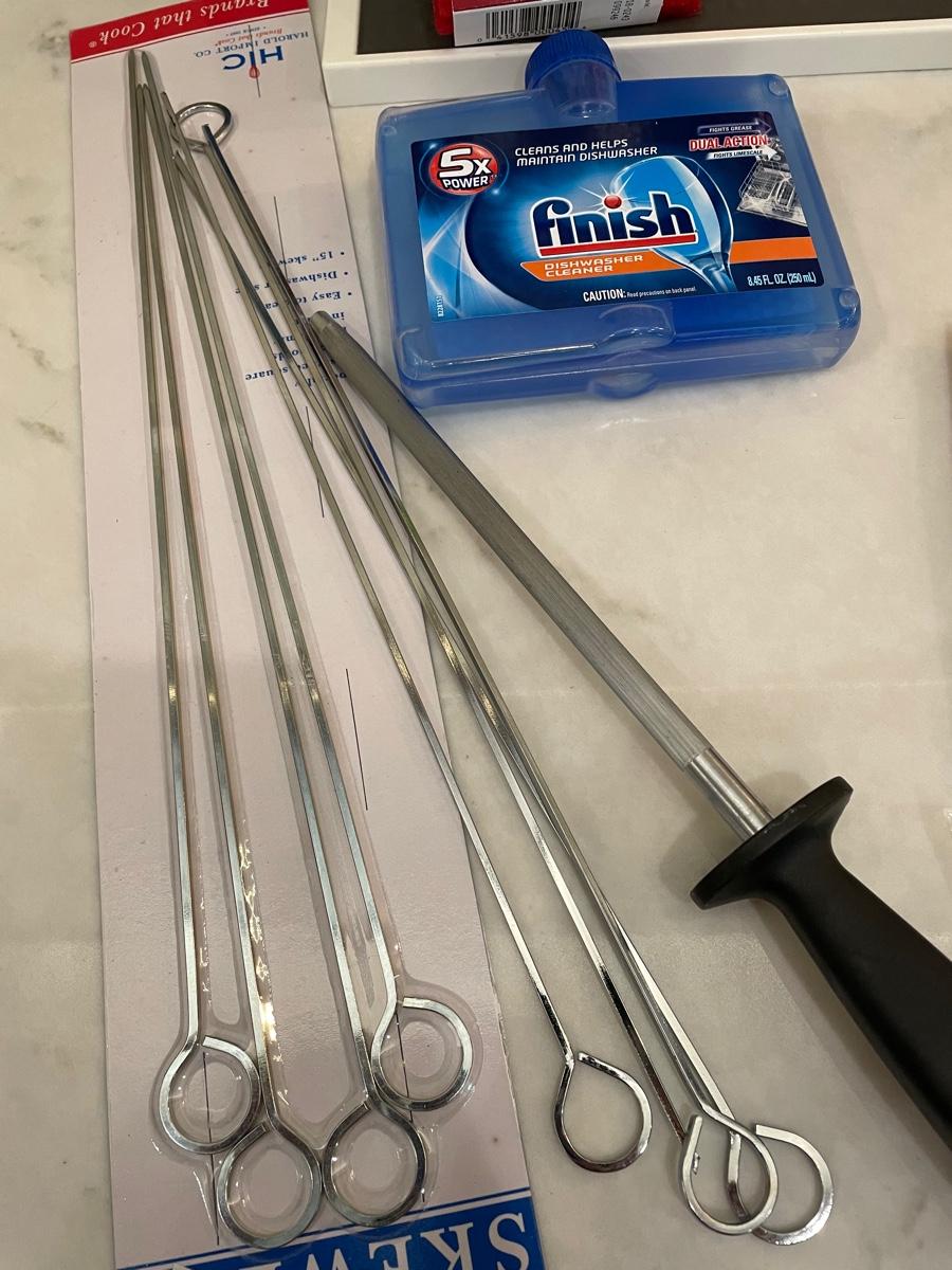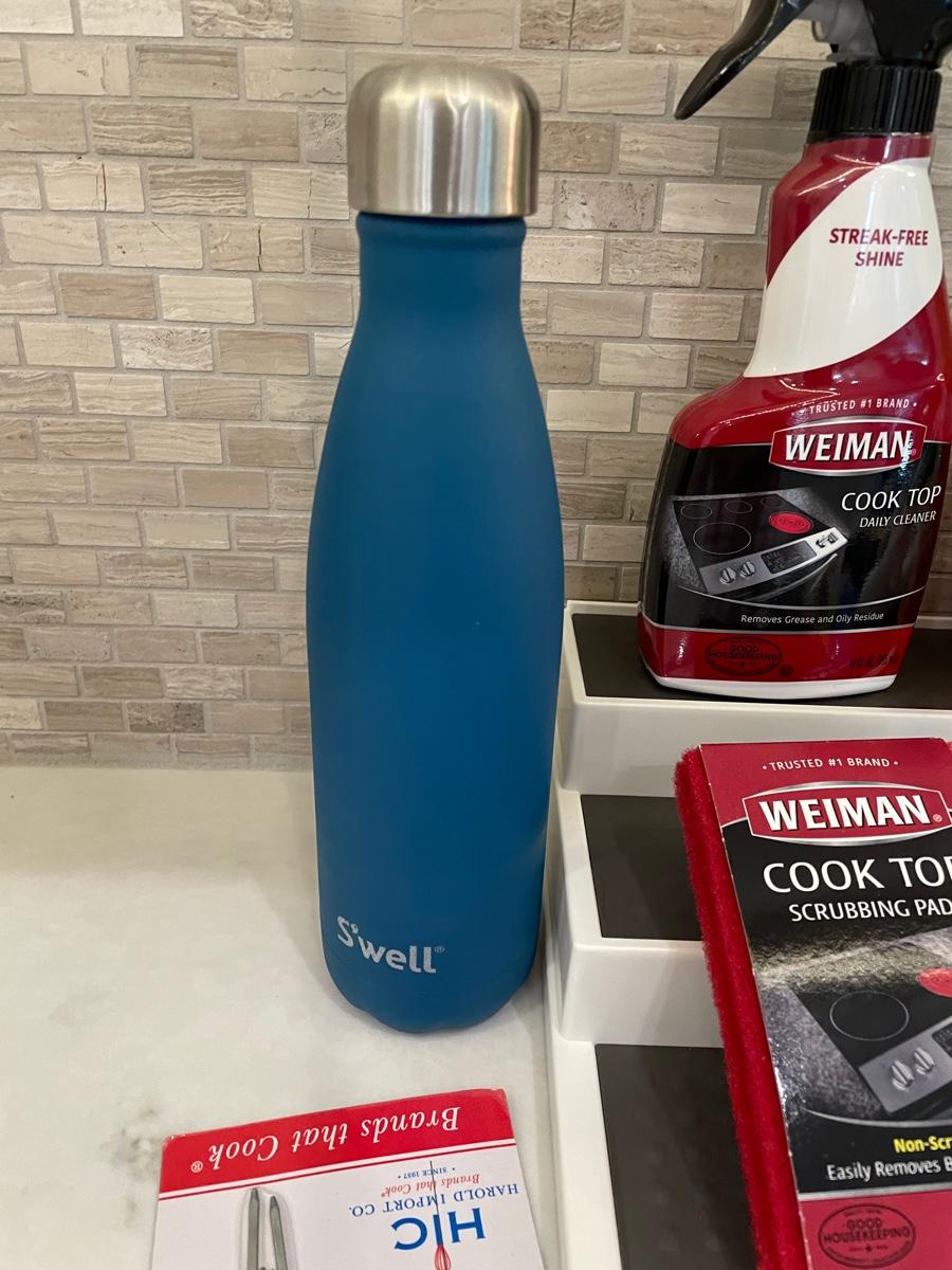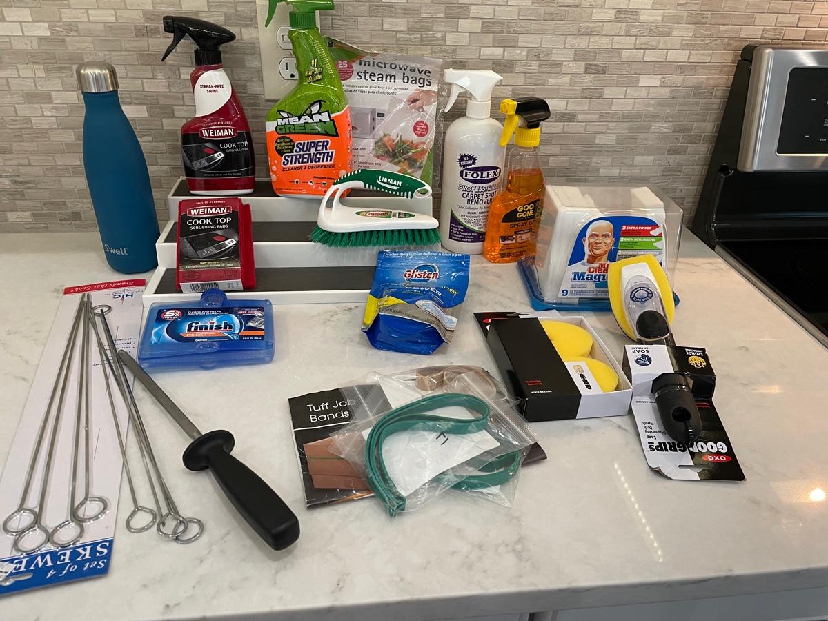 Big assortment of useful household items--cleaning products, a riser for spices, etc., a Swell insulated drink bottle, knife sharpener, skewers, giant rubber bands,