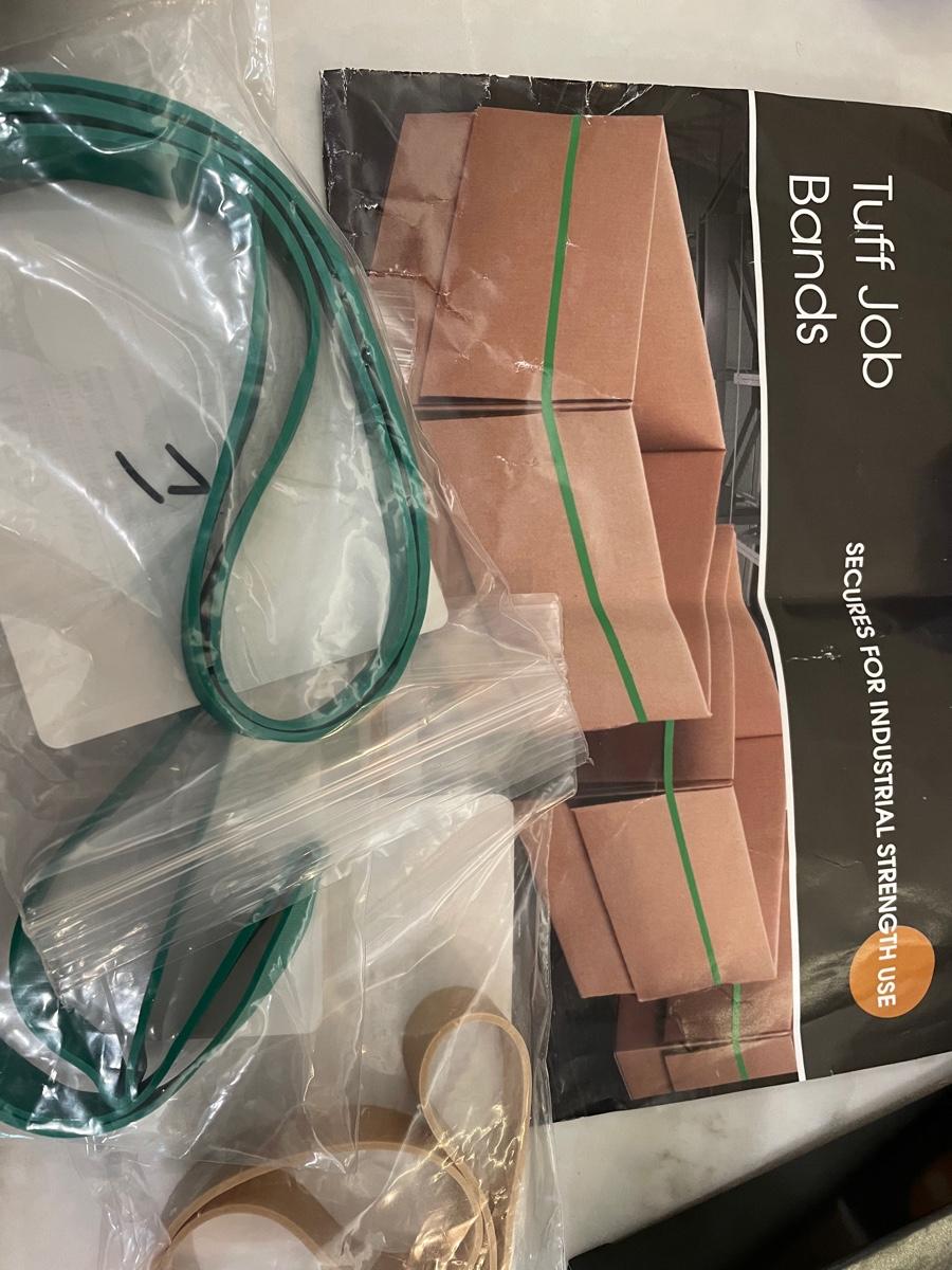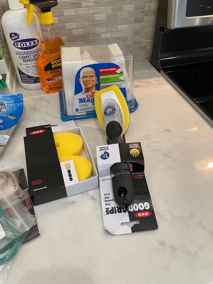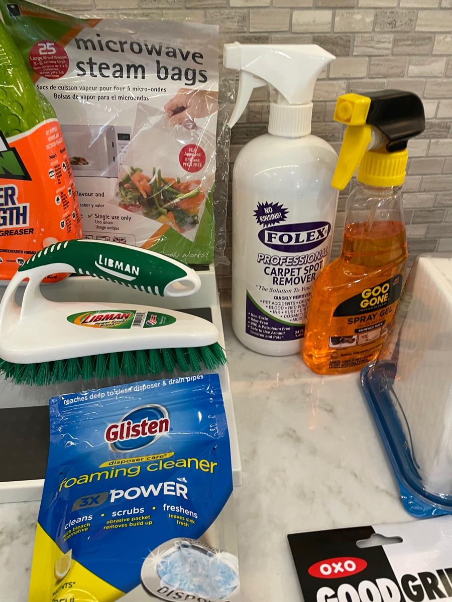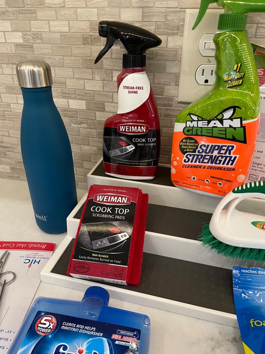 Big assortment of useful household items--cleaning products, a riser for spices, etc., a Swell insulated drink bottle, knife sharpener, skewers, giant rubber bands,