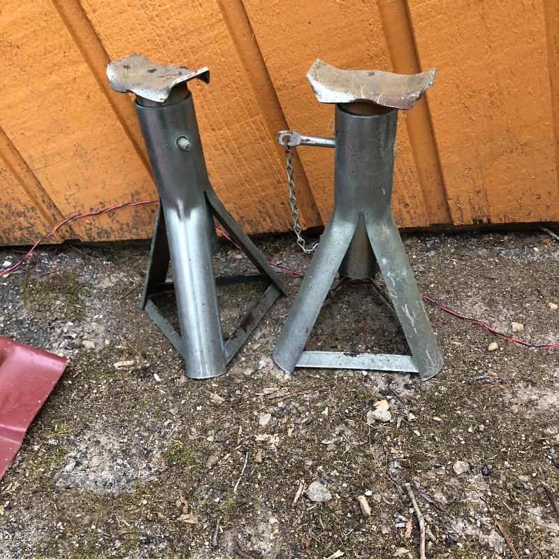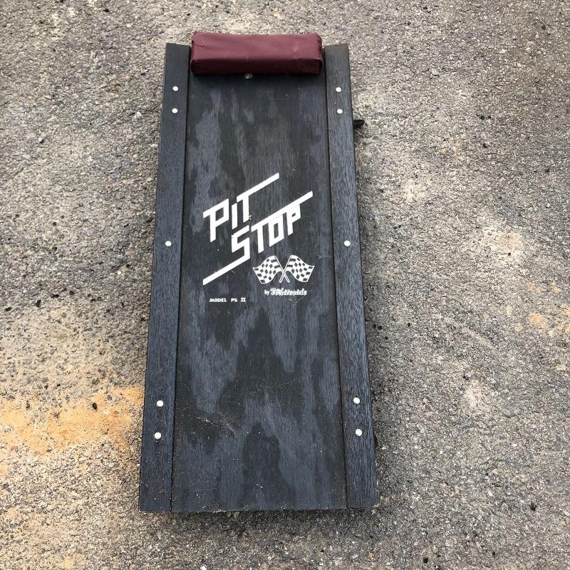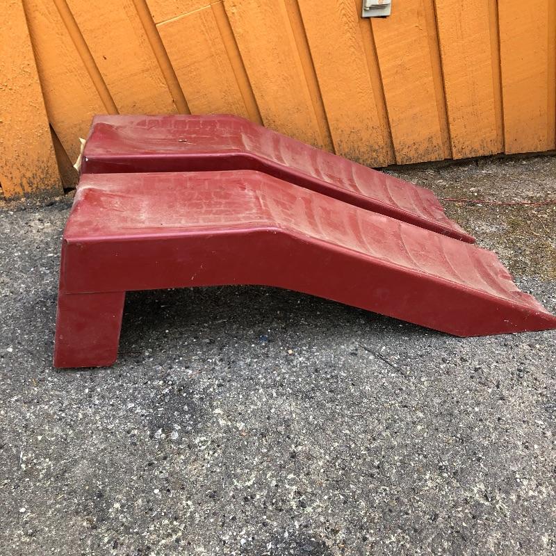 Get your car in shape with this array of auto tools. Lot includes two auto ramps, creeper, hand pump, fender cover, hanging retractable light, funnels and two Jack stands. Both lights worked when tested.
