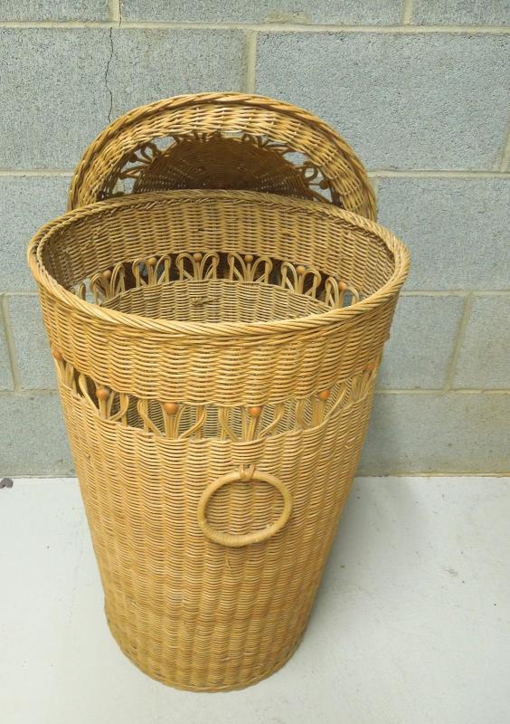 28" H wicker hamper with wood beads and open weave design. No broken wicker. Top has some white residue on it.