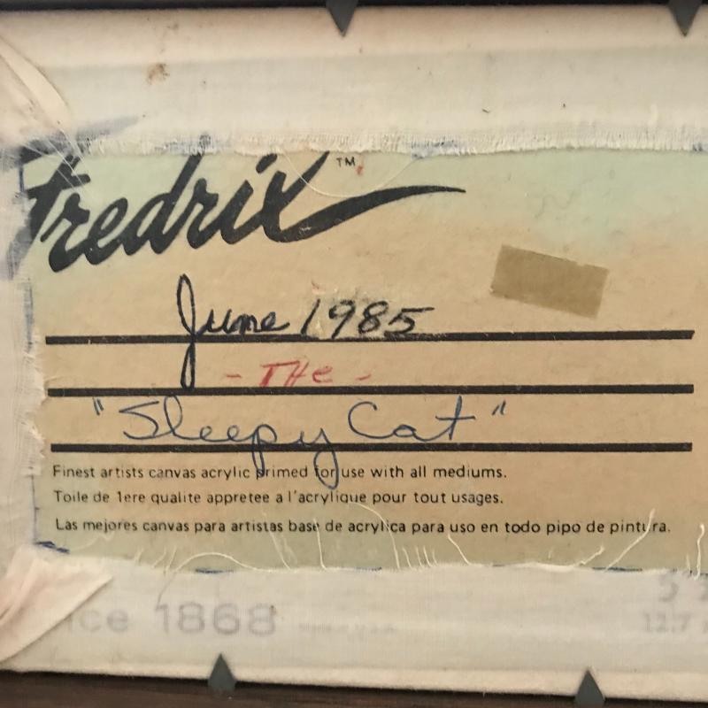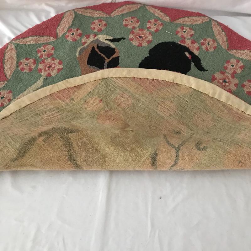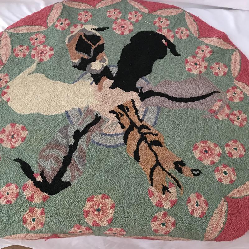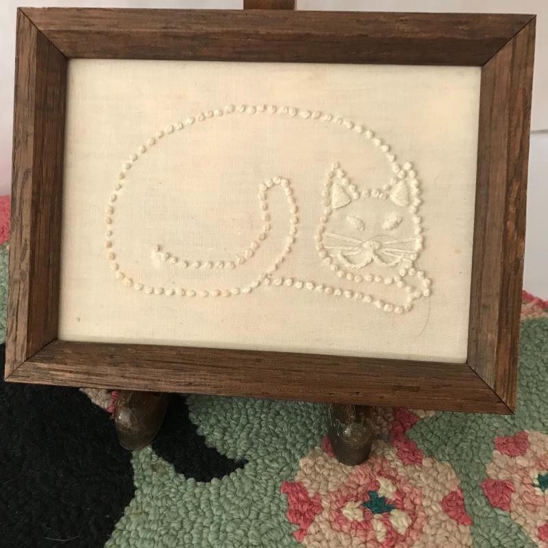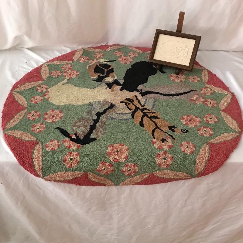 Round cate rug in pinks, blues, black, white and tan measuring 37” diameter, small framed stitch work measures 8” x 6”. Lot is available for shipping or local pick up in Maggie Valley, NC.