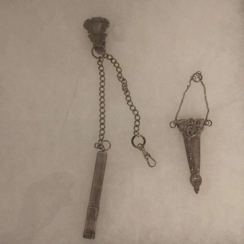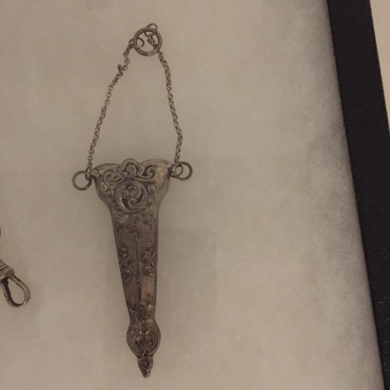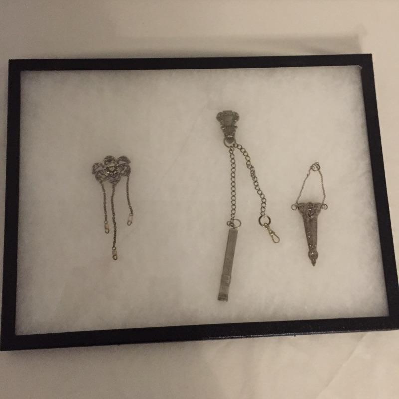 Chatelaines in display frame. Great for all you sewing buffs who know what these were used for. Frame measures 12.5” x 16.5” x 1”.