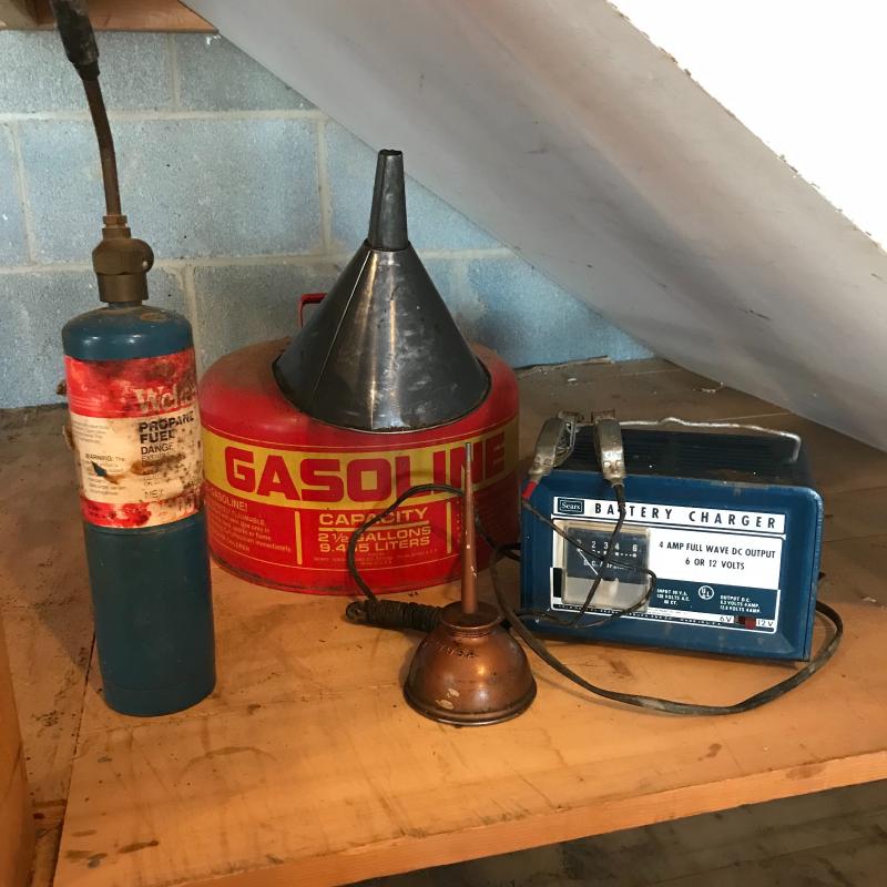 Metal gas can, welder's torch, metal funnels, small oil can and Sears battery charger. This lot is available for local pick up in Flat Rock, NC only.
