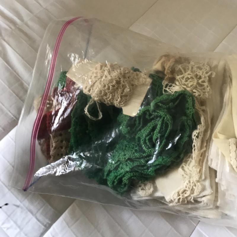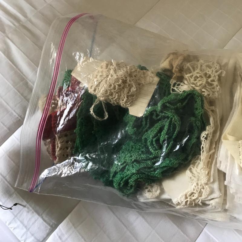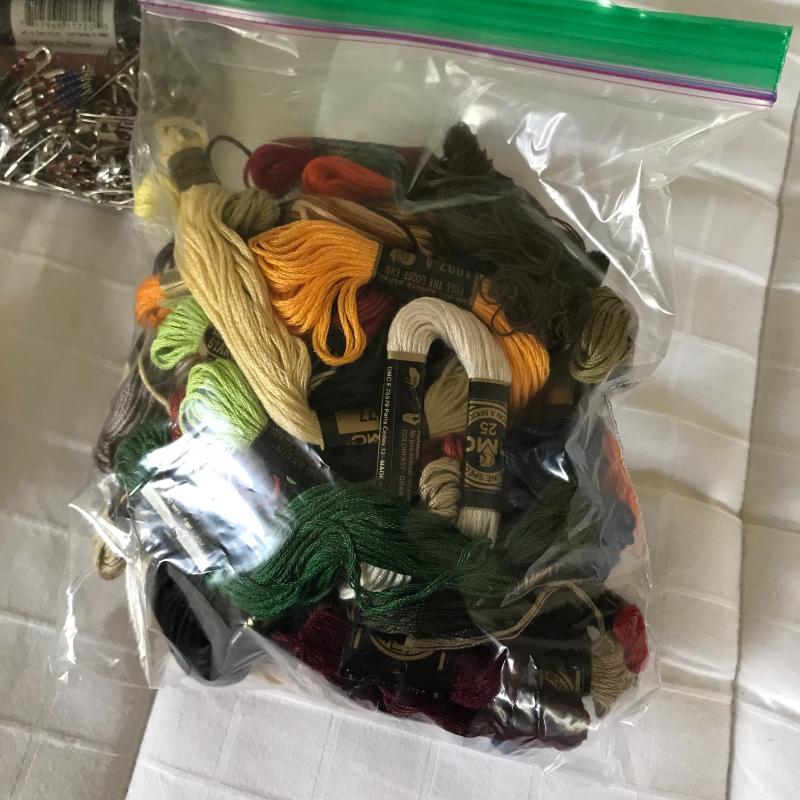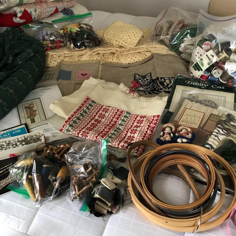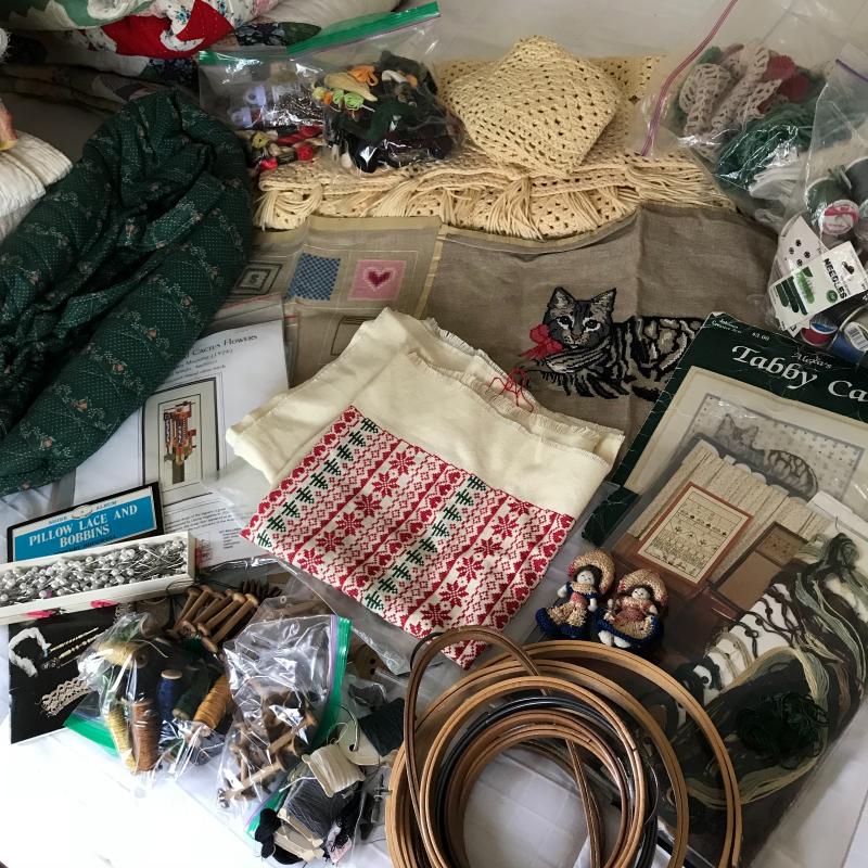 This lot is perfect for the skilled cross stitcher and/or needlepoint crafter. Includes several gorgeous incomplete projects, thread, antique bobbins, a crocheted afgahn, and more. See pics for details. Shipping available or local pickup in Asheville, NC.