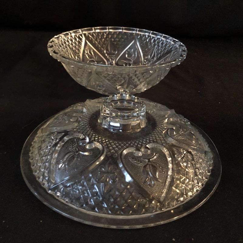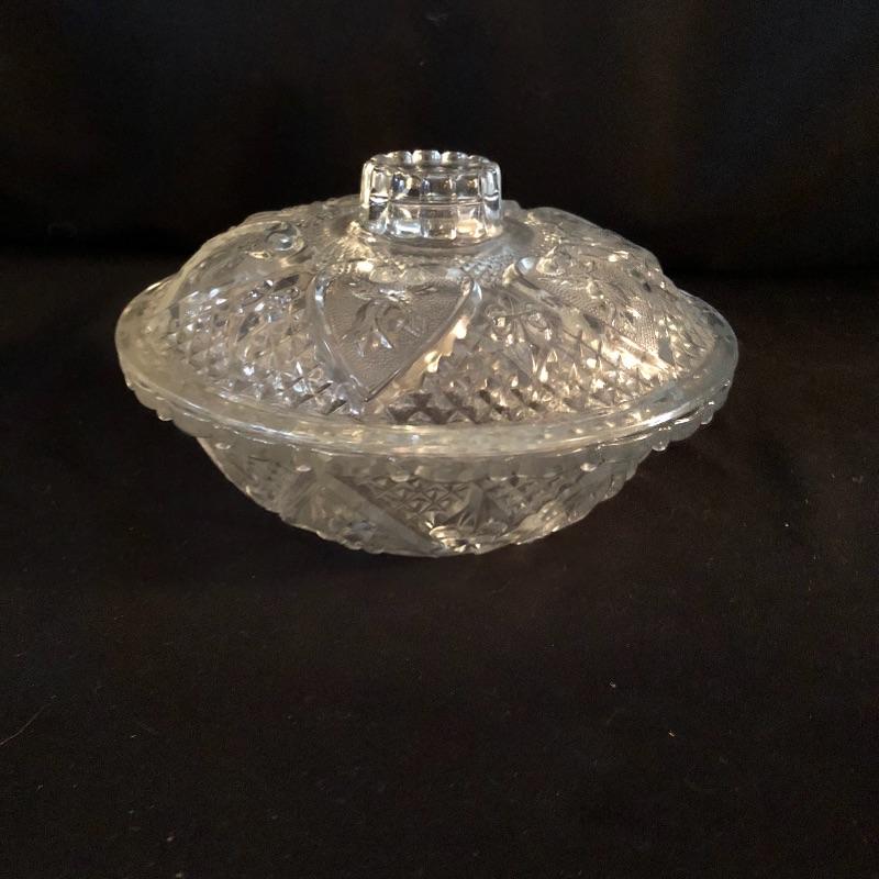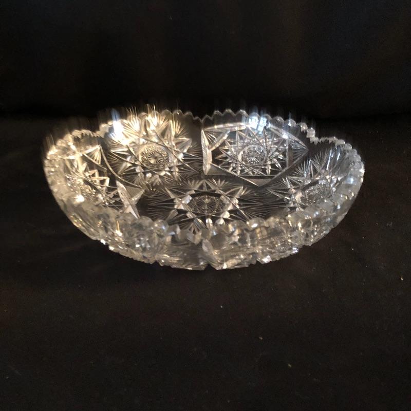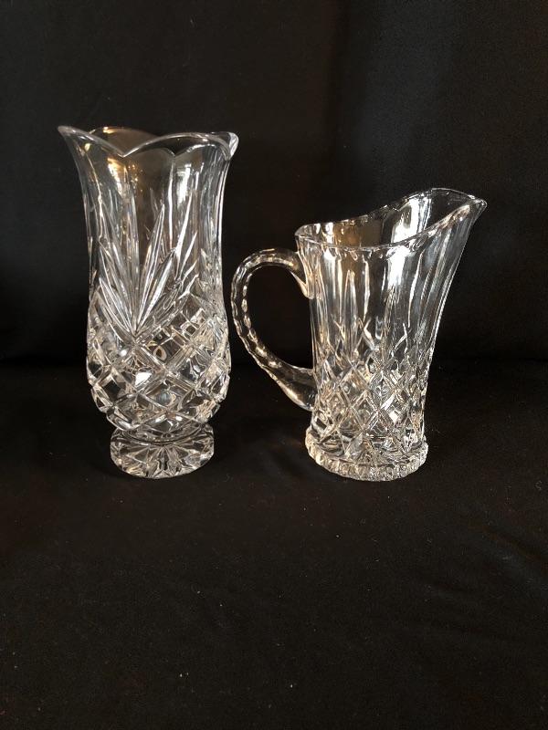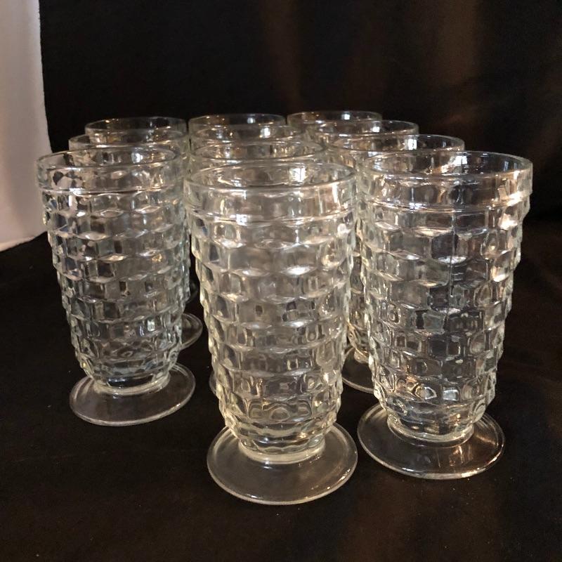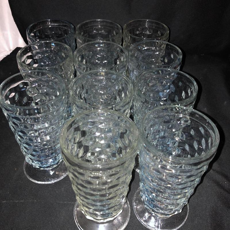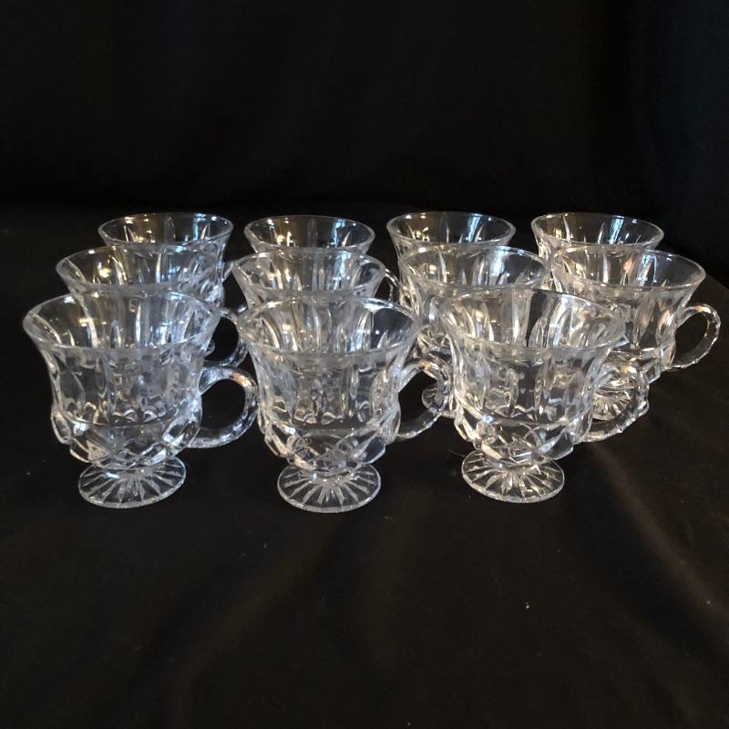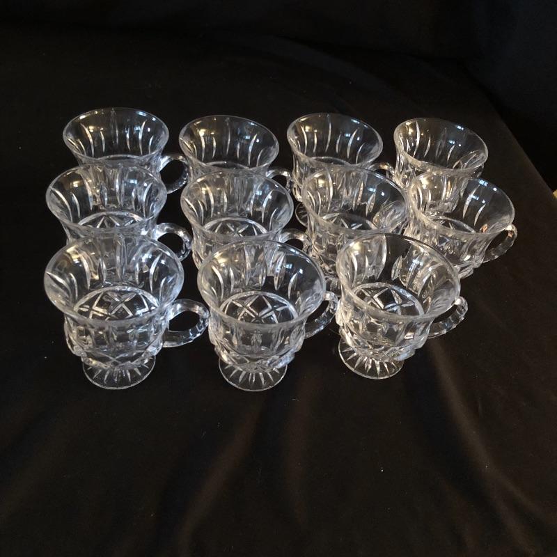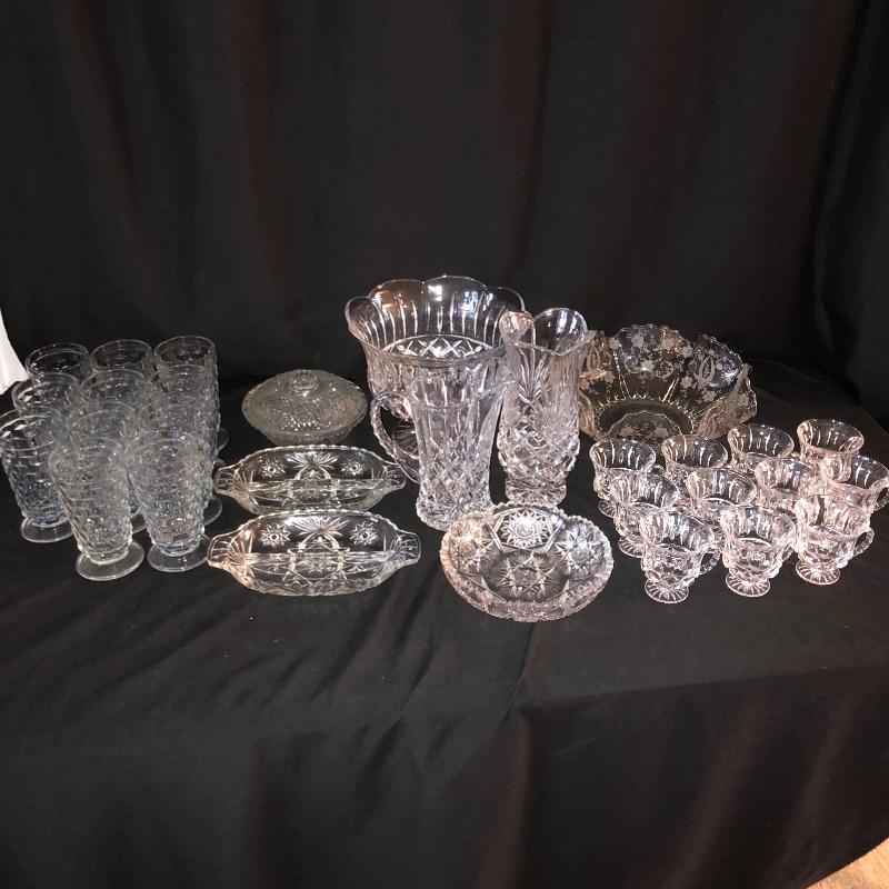 A dazzling array of cut and formed glass. Lot includes eleven cups and eleven glasses, pitcher, vase, footed bowl, two dishes, lidded bowl and bowl. Footed bowl measures 10”D x 8.5”.