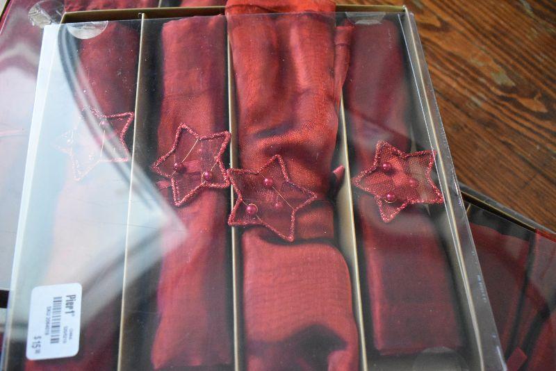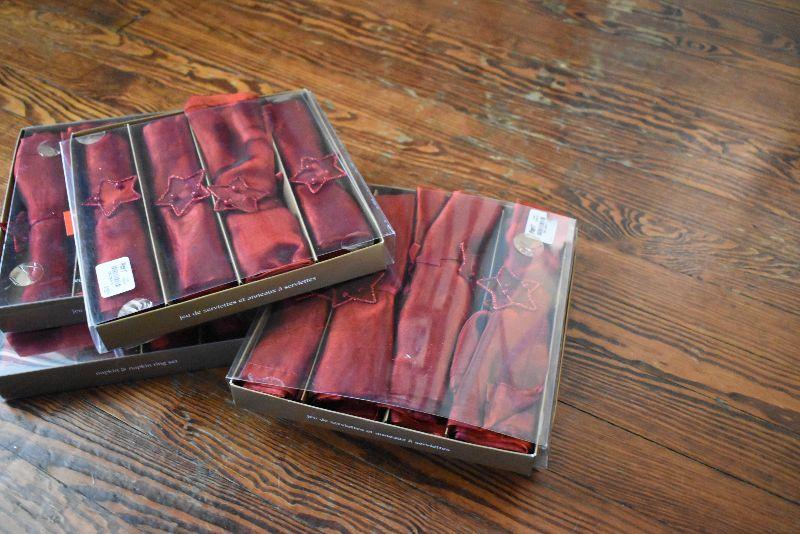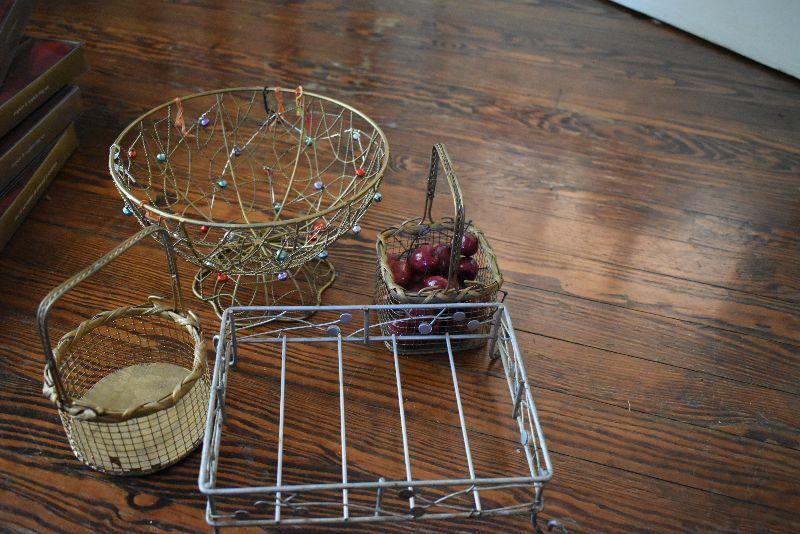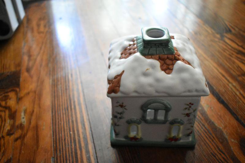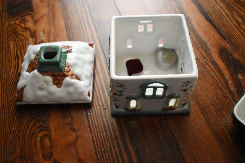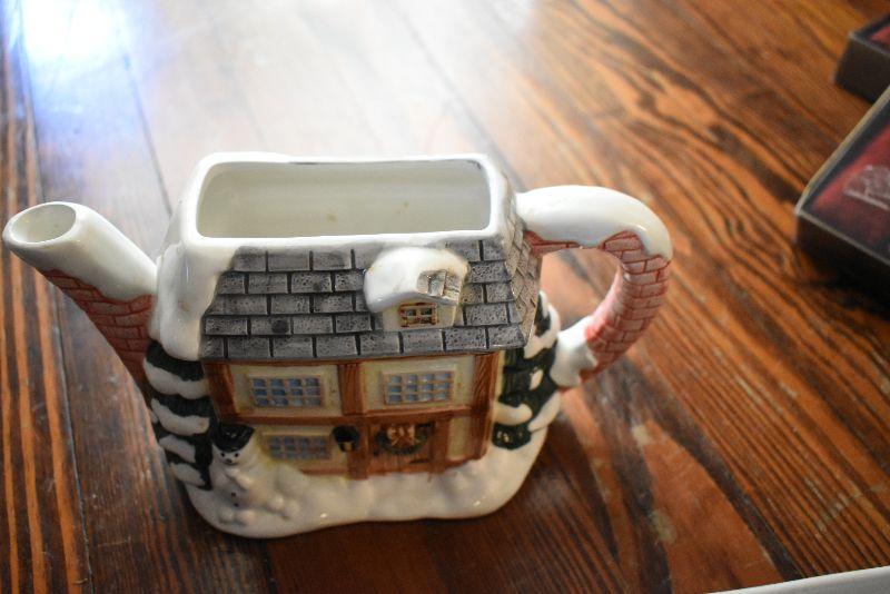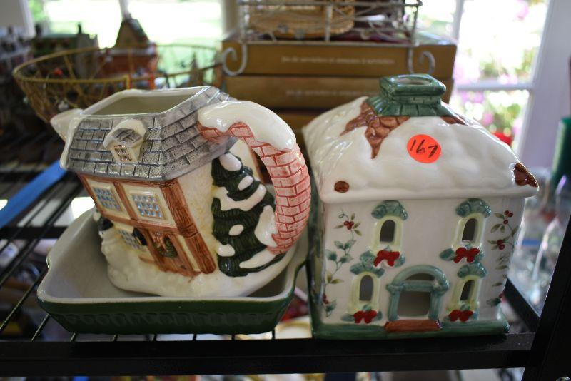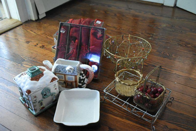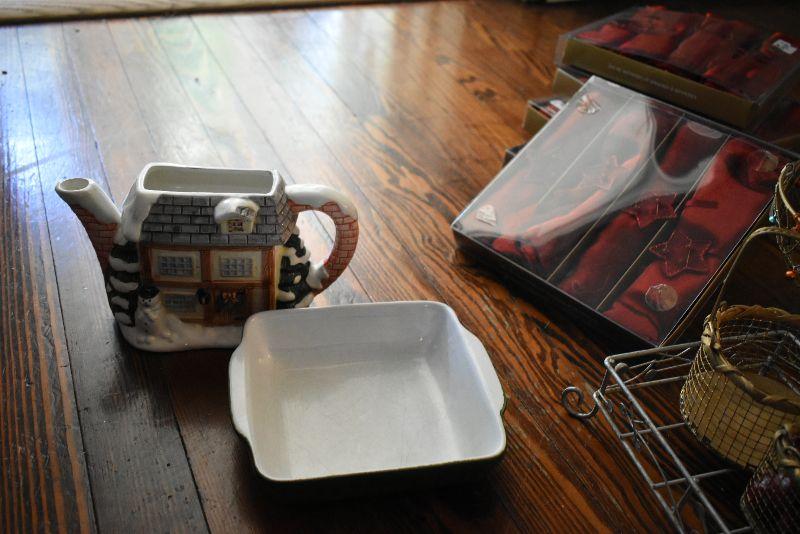 Christmas candle house, teapot, missing lid, square baking dish, wire baskets, and new napkins and napkin holders, four boxes.