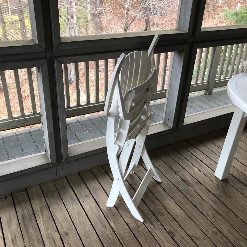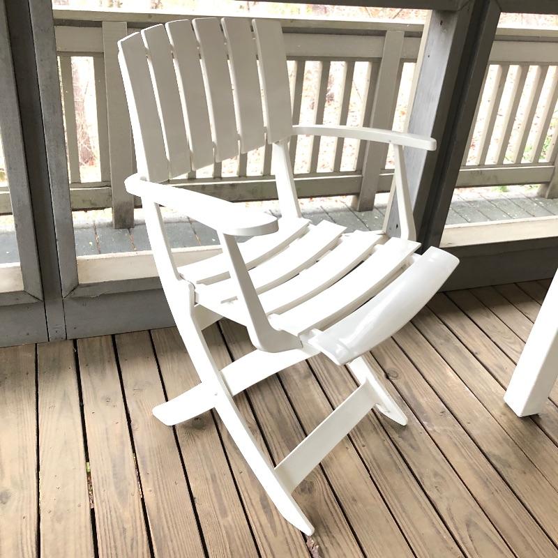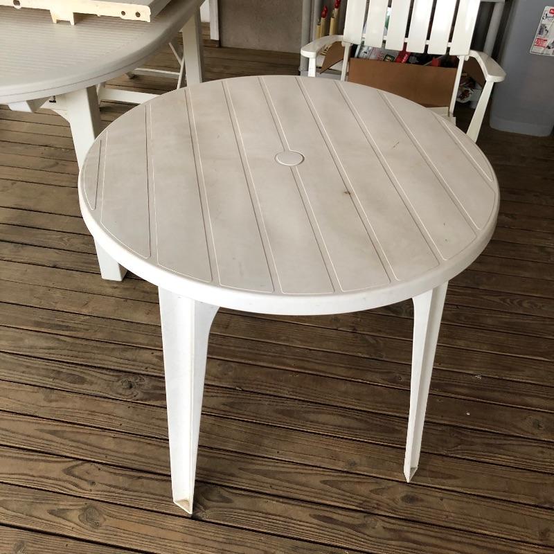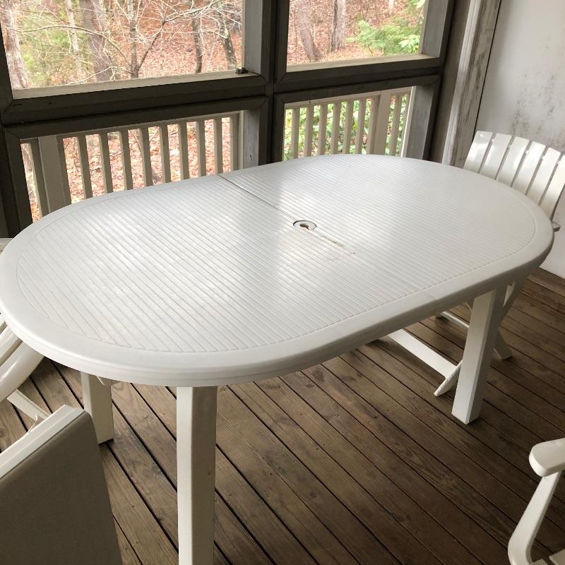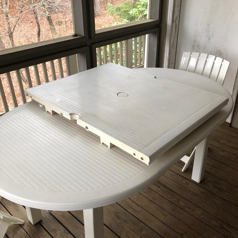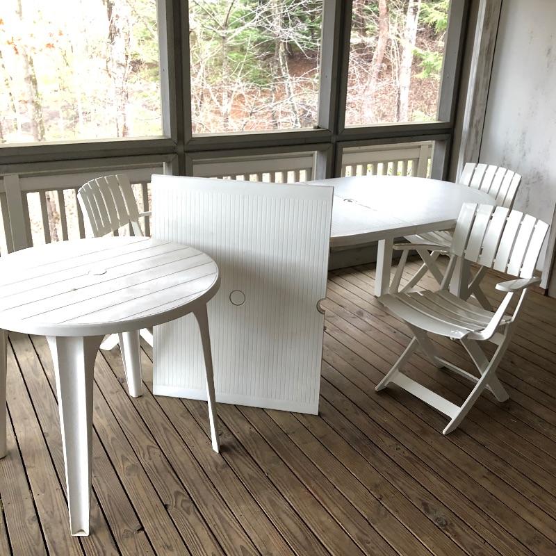 Room for the family and guests with this white patio table that measures 63” and an additional 28” can be added with the leaf, 28” high. Table comes with 3 similar but not matching white folding chairs and a smaller round table that measures 30” and 28” high. Chairs sit 16” high.