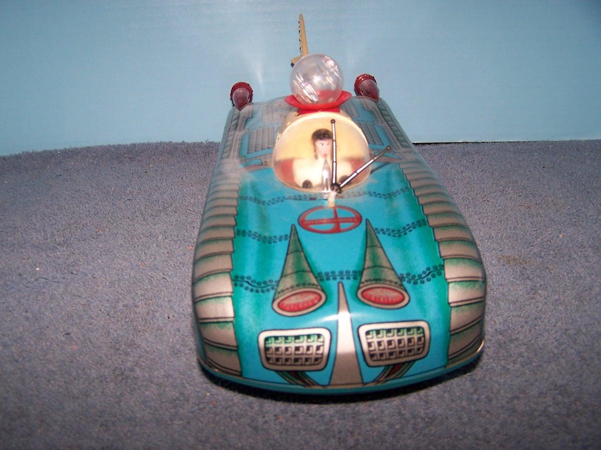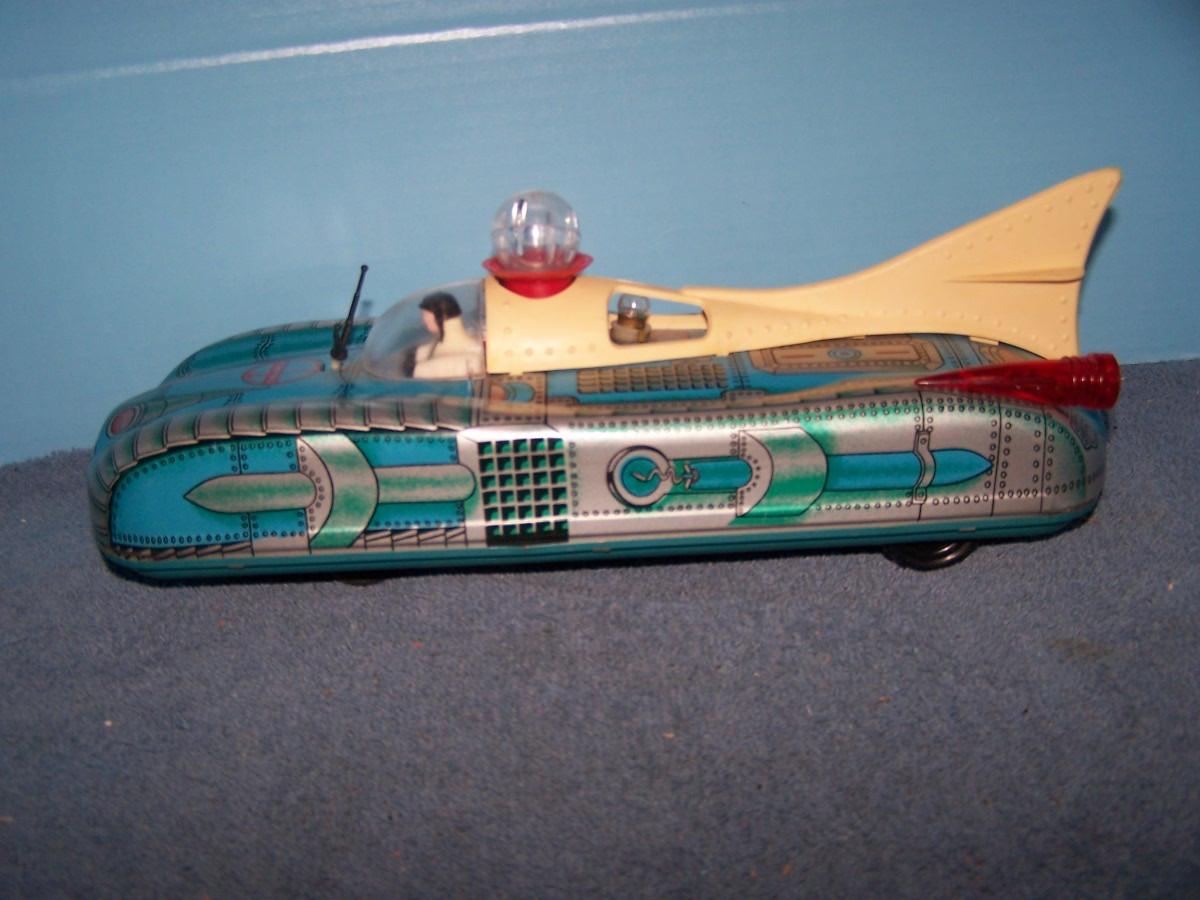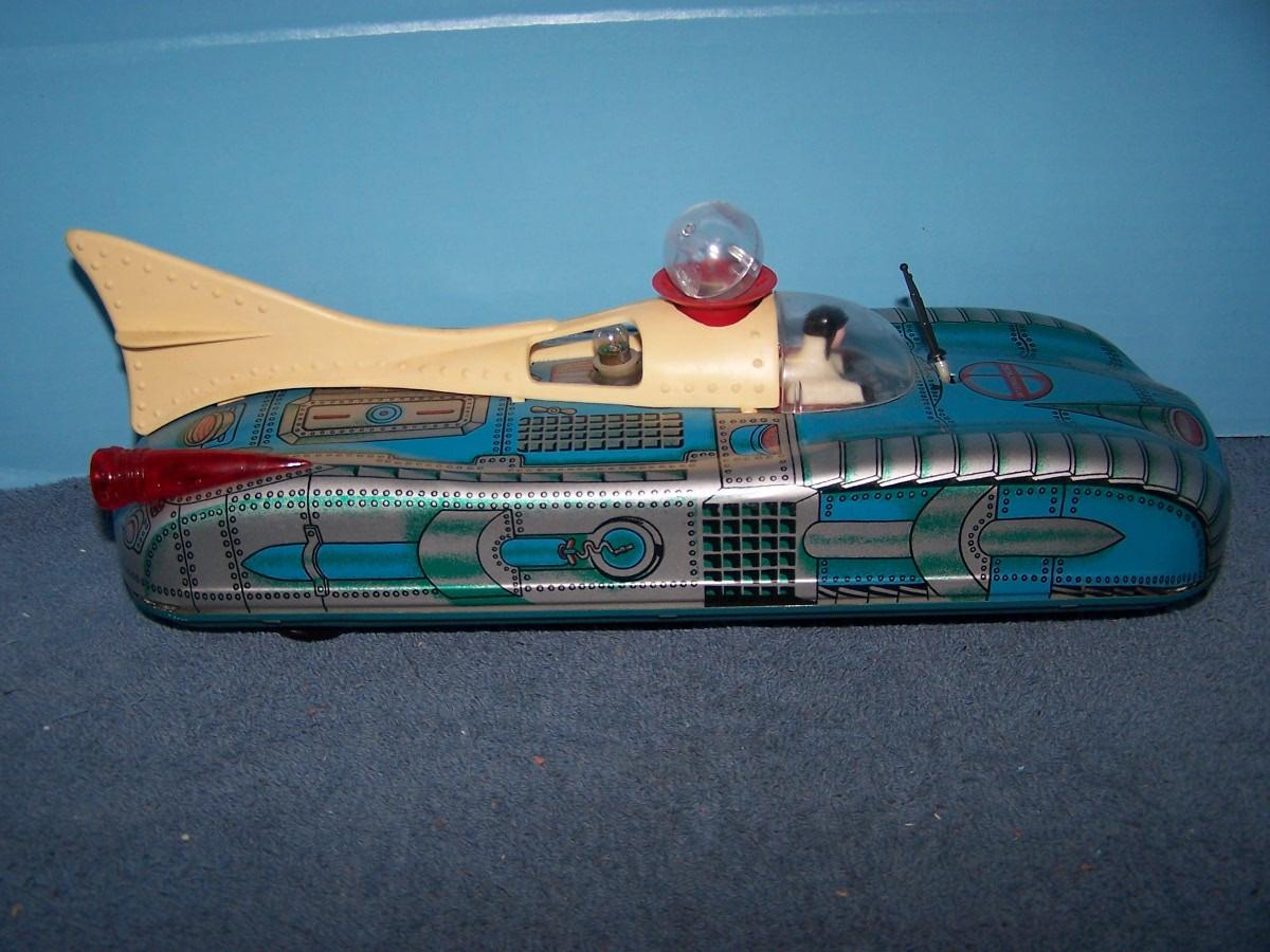 THIS IS A FAB COLLECTABLE TIN LITHO BLUE SPACE ROCKET TOY CAR!!! RUSSIAN??? 14'' LONG... NEEDS BATTERIES.. LIGHT WEAR... (NOT TESTED DID NOT HAVE BATTERIES, AS IS.)