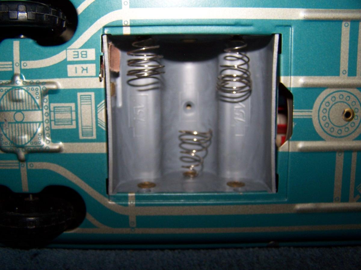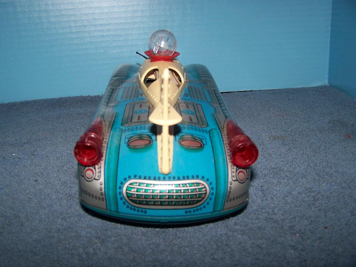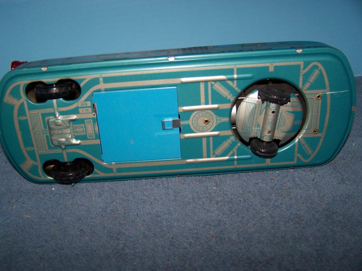 THIS IS A FAB COLLECTABLE TIN LITHO BLUE SPACE ROCKET TOY CAR!!! RUSSIAN??? 14'' LONG... NEEDS BATTERIES.. LIGHT WEAR... (NOT TESTED DID NOT HAVE BATTERIES, AS IS.)