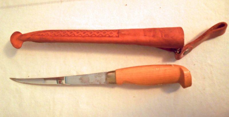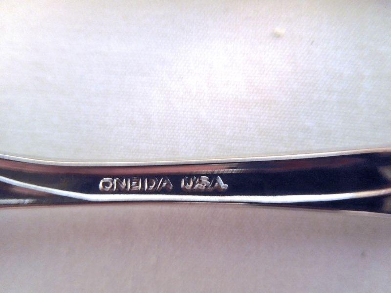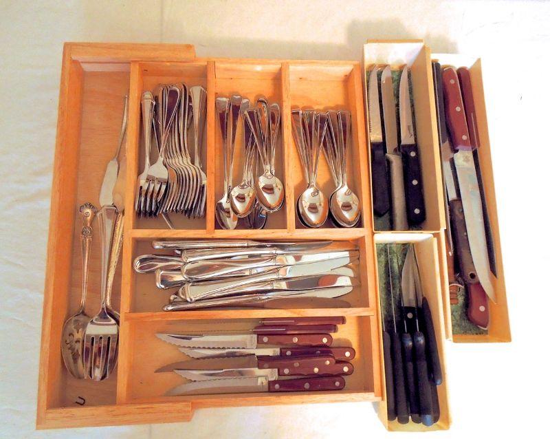 Oneida flatware includes spoons, knives, forks and serving pieces. See written list in phot for complete list. Also includes adjustable bamboo sectional tray and a Finnish filet knife with leather sheaf.