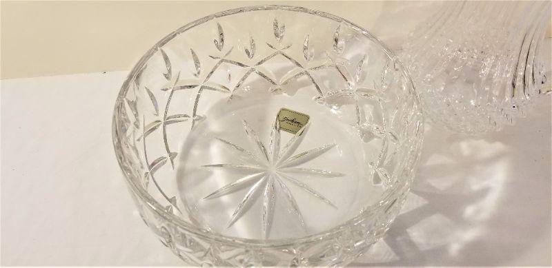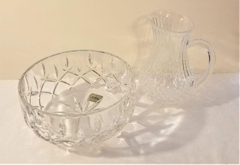Very pretty Gorham Lead crystal bowl - still has sticker - 9" across and a nice pressed glass pitcher that stands 8" tall. Both in nice condition.