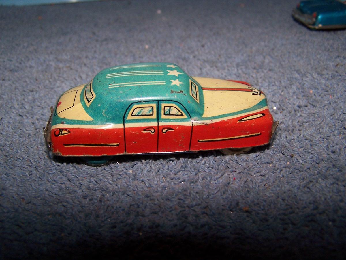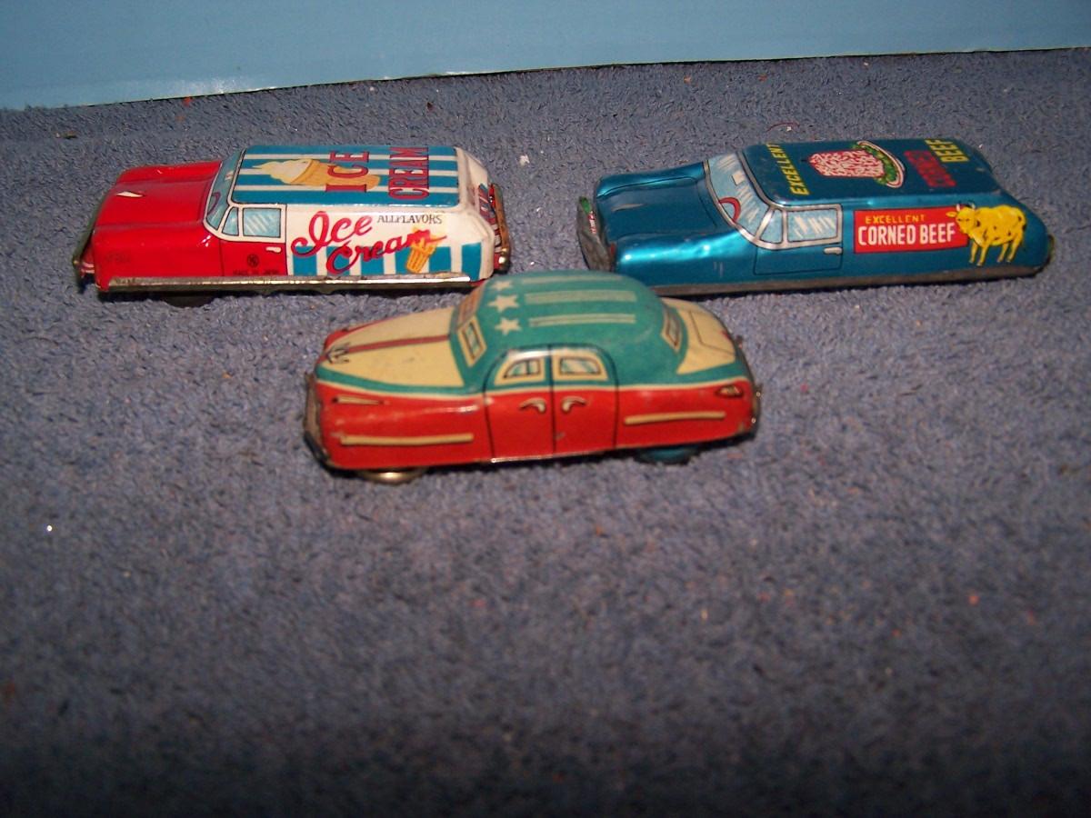 THESE ARE GREAT VINTAGE TIN LITHO CARS! FRICTION WORKS.. BEEF-3 3/4'' LONG.. ALL TOYS HAVE BEEN PLAYED WITH..