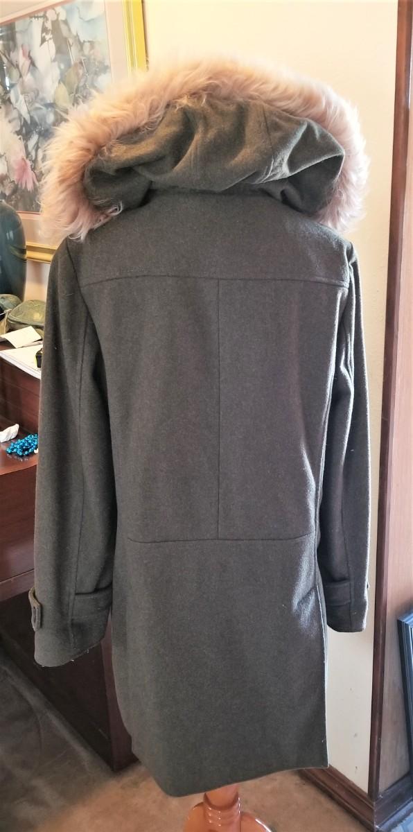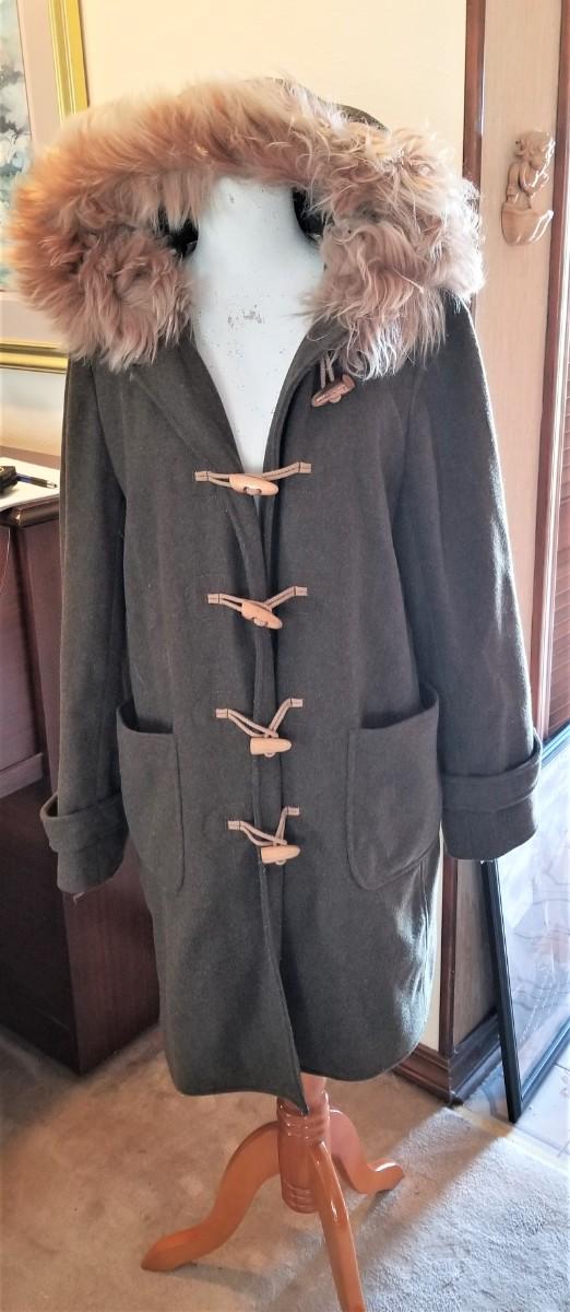 Nice J. Crew wood coat with faux fur hood - size Medium - good used condition. 24" long sleeves, coat is 34" long.