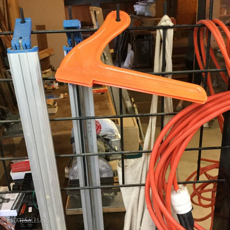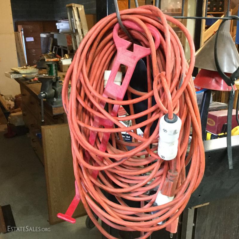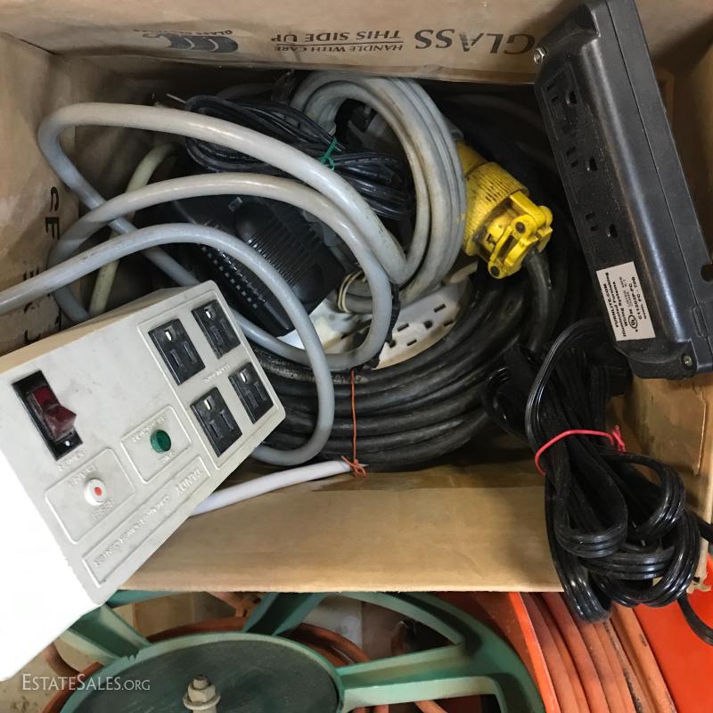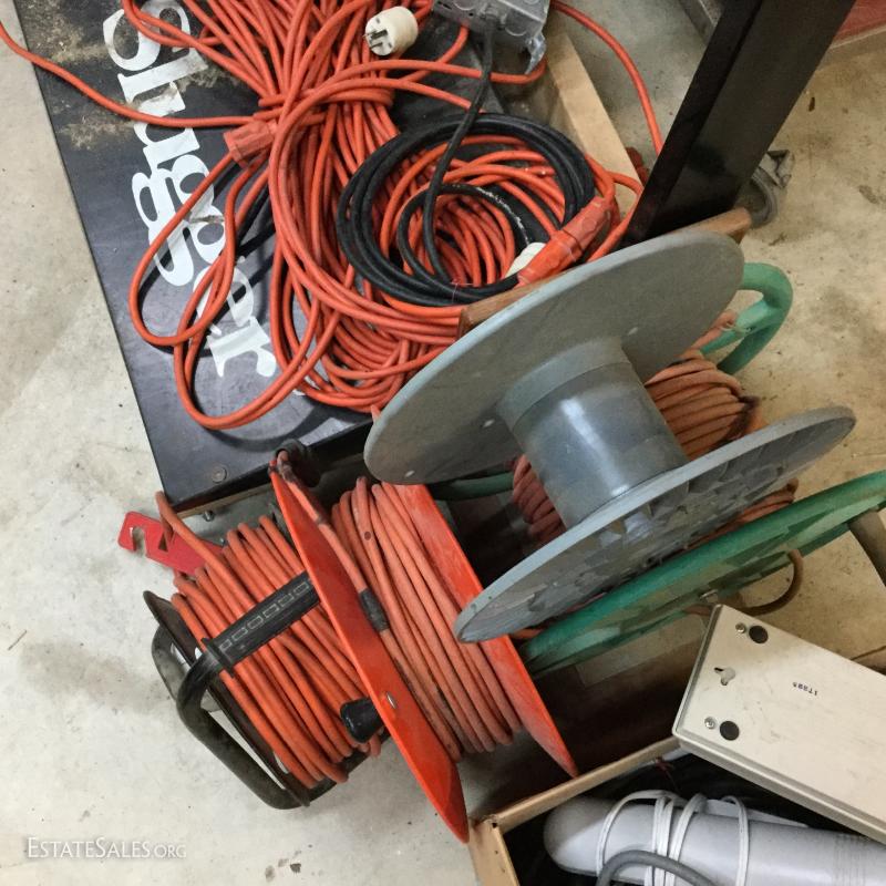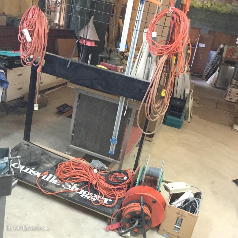 Metal stand on wheels. 48"L x 22"w x 82"high. Several extension cords, four cord holders, two portable lights, and a box of power strips.