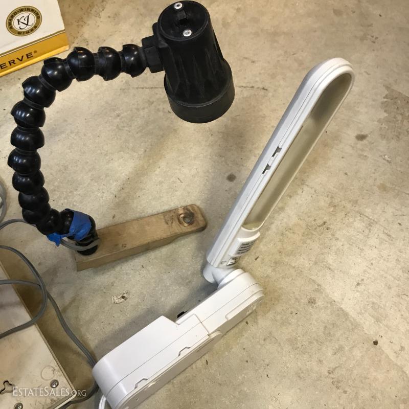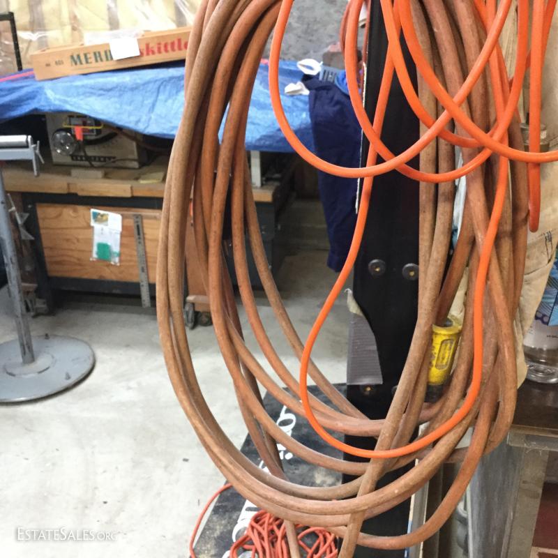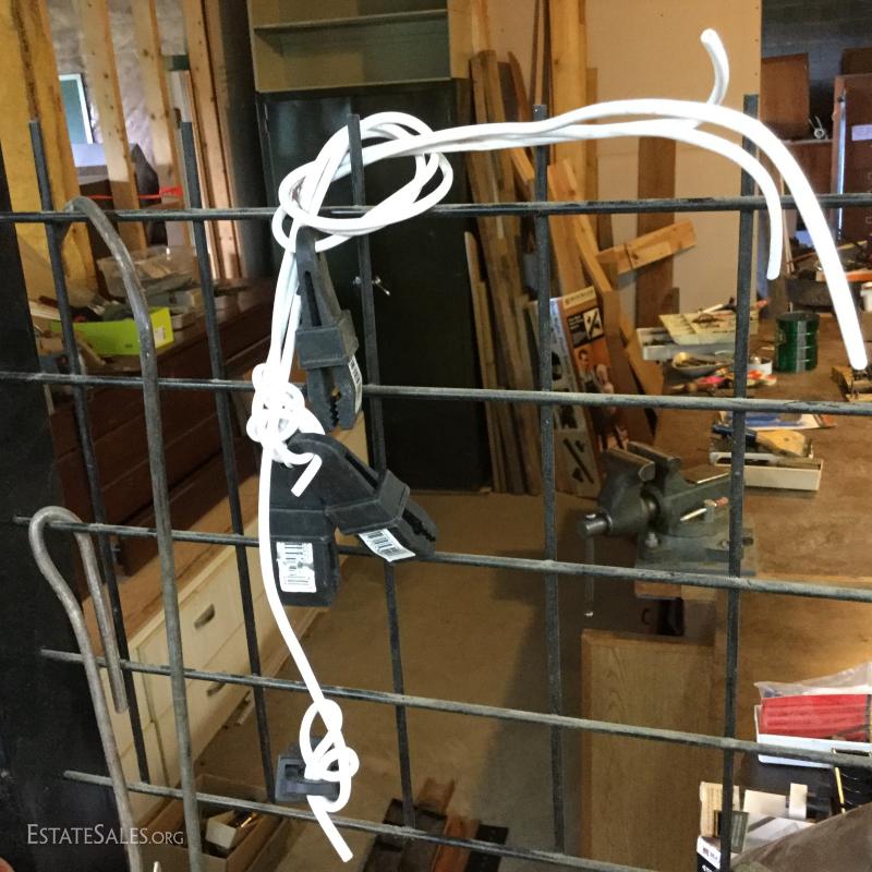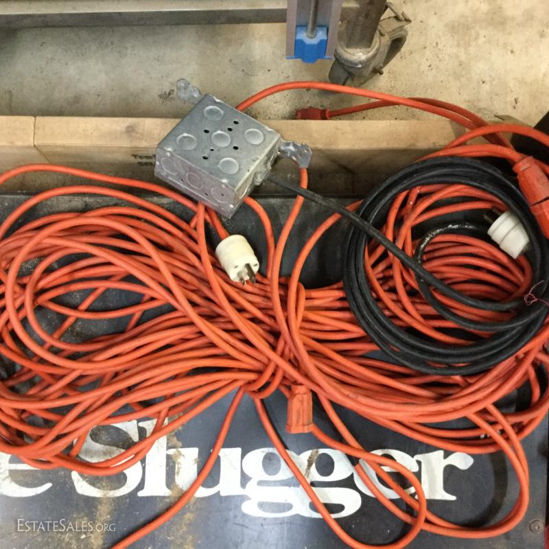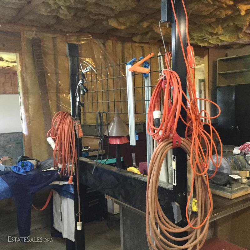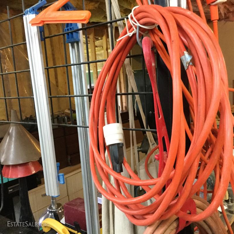 Metal stand on wheels. 48"L x 22"w x 82"high. Several extension cords, four cord holders, two portable lights, and a box of power strips.