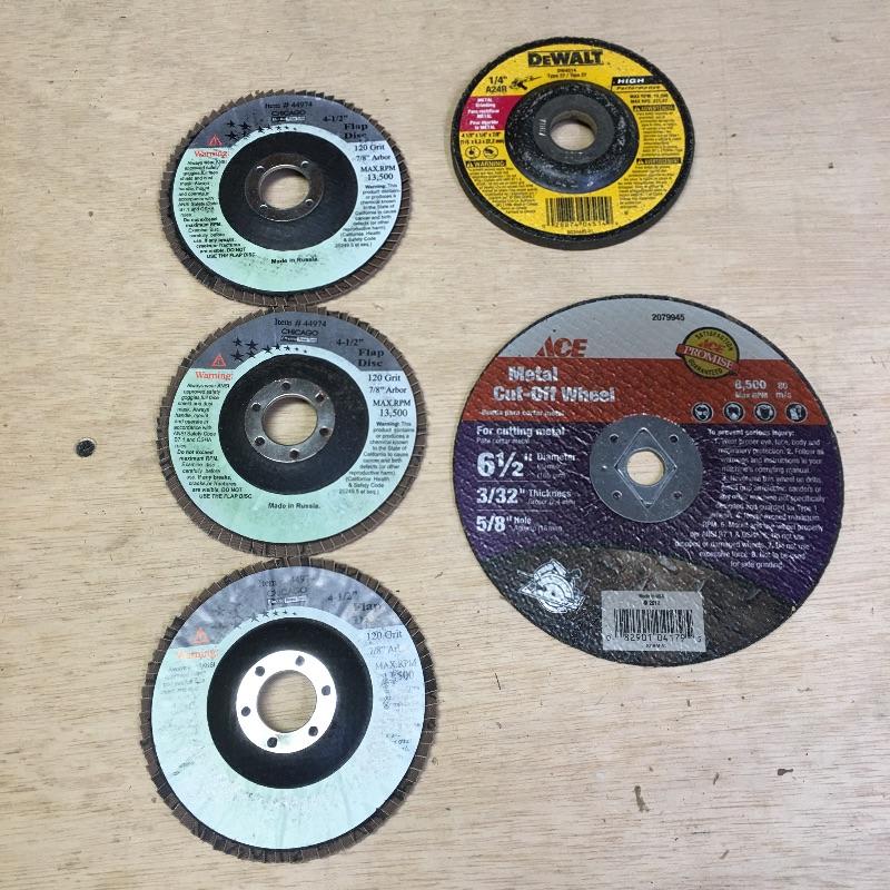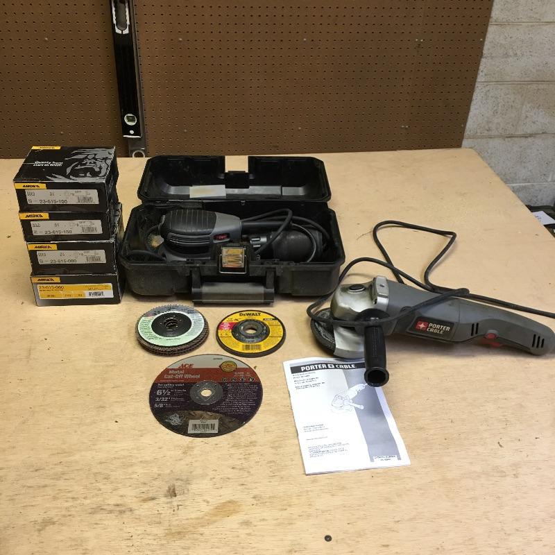 Two great tools to have in your workshop. The Porter Cable orbital sander model # 390 comes with four different grit sandpaper discs and the Porter Cable angle grinder model #PC750AG comes with extra discs. Both items worked when tested.