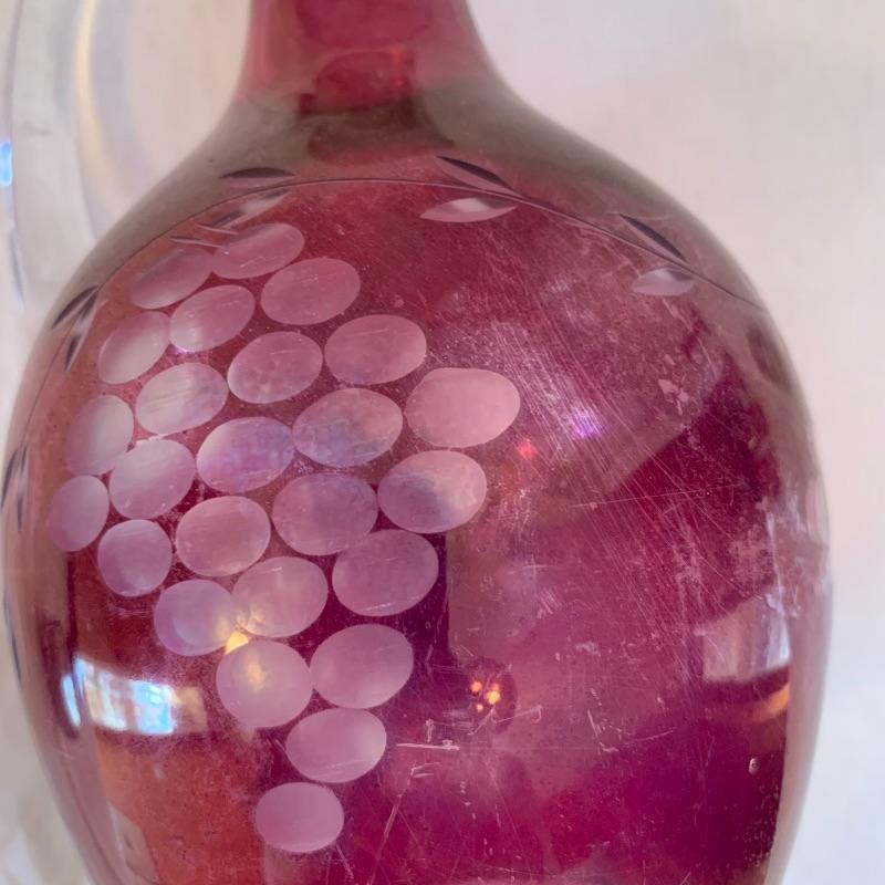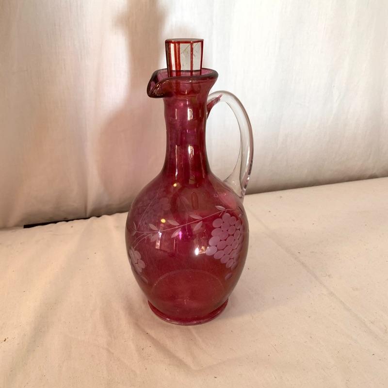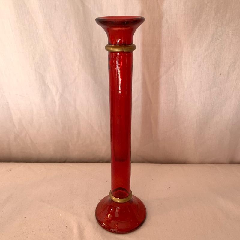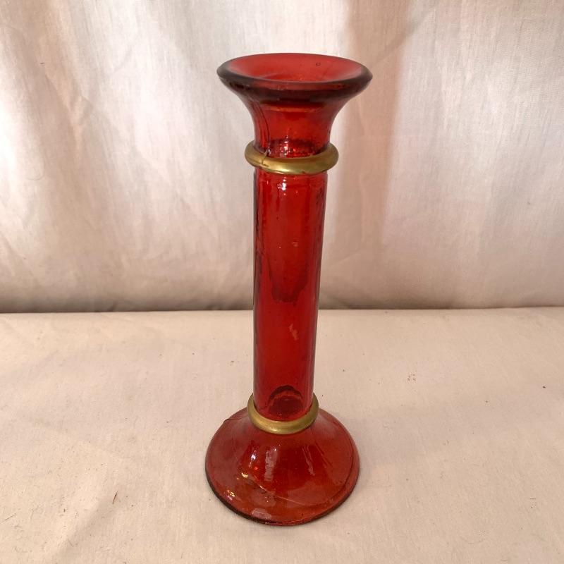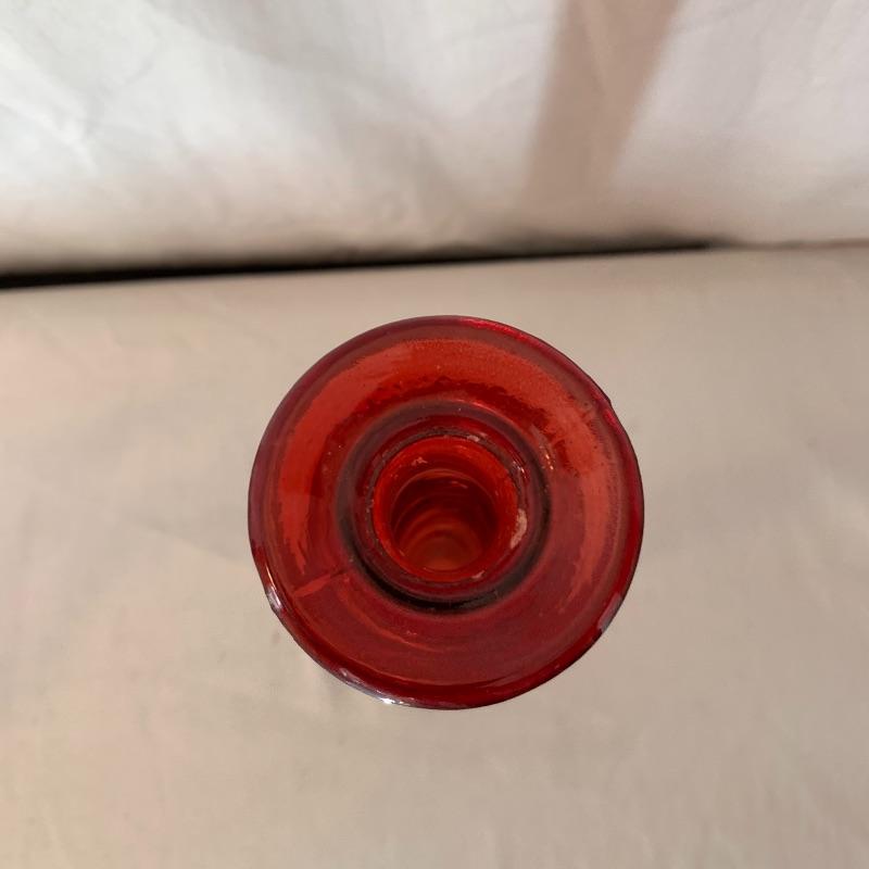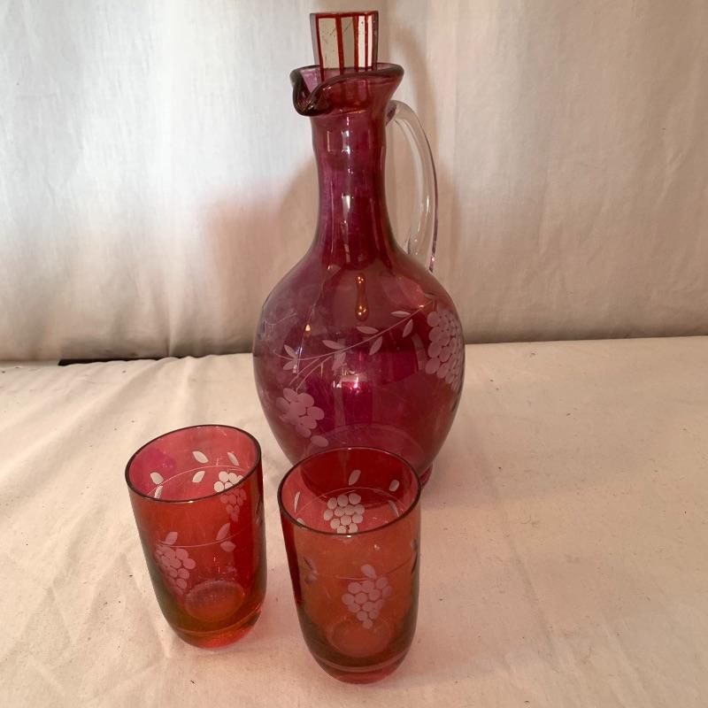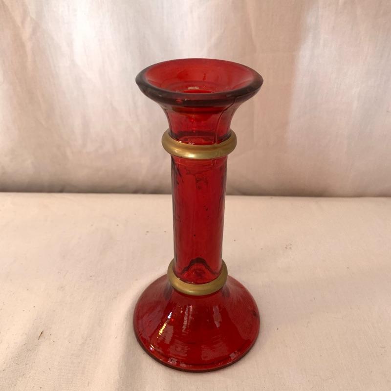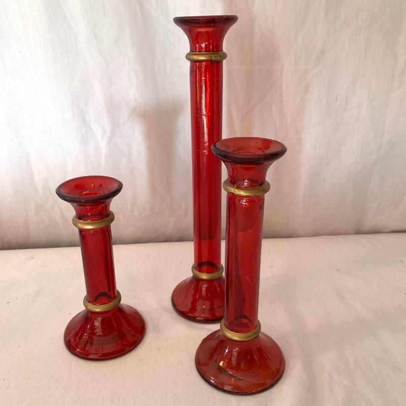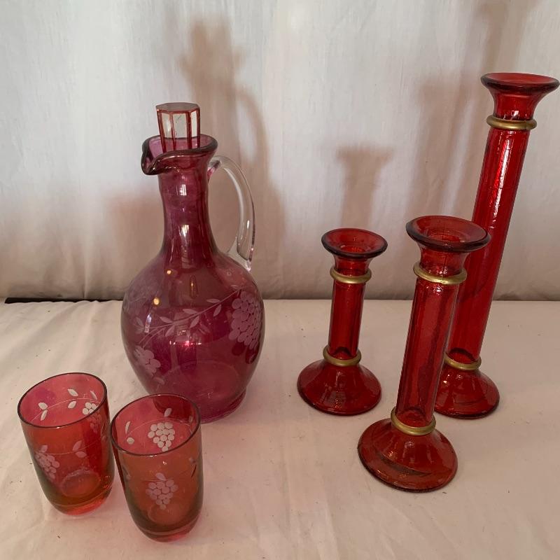 This lot includes a set of red glass candlestick holders and a red glass pitcher and glass set. The three glass candlestick holders are red glass with gold detail and are unbranded. The pitcher and two cups set is red glass with grape detail. The pitcher set is also unbranded. There is some slight wear to the red color on the pitcher and cups (see picture). The largest candlestick holder measures about 11in long and the smallest measures about 6 in long. The pitcher measures about 9.5in tall. Local pick up only.
