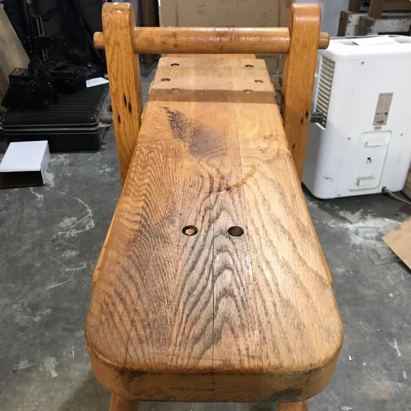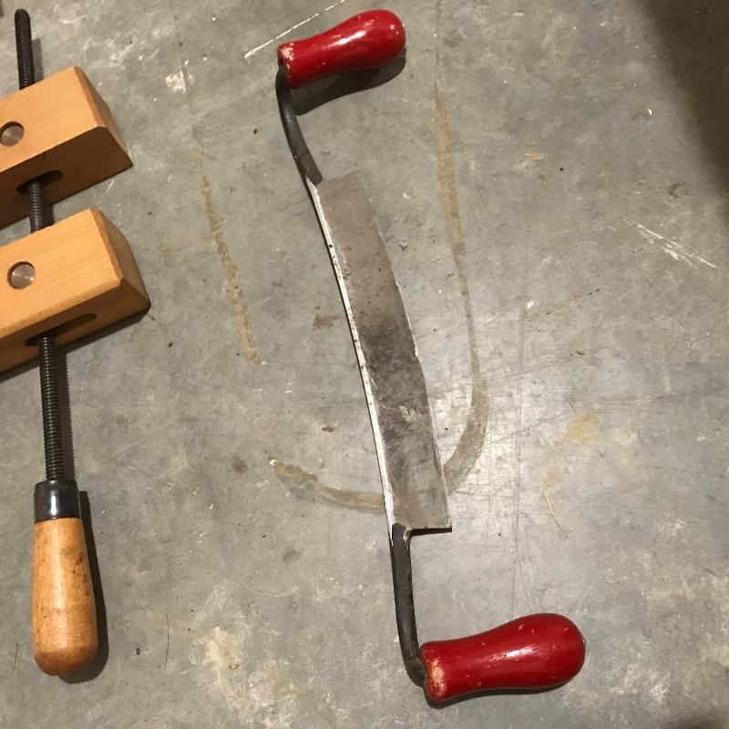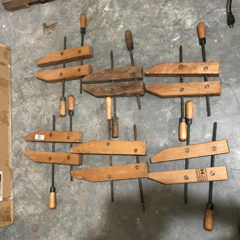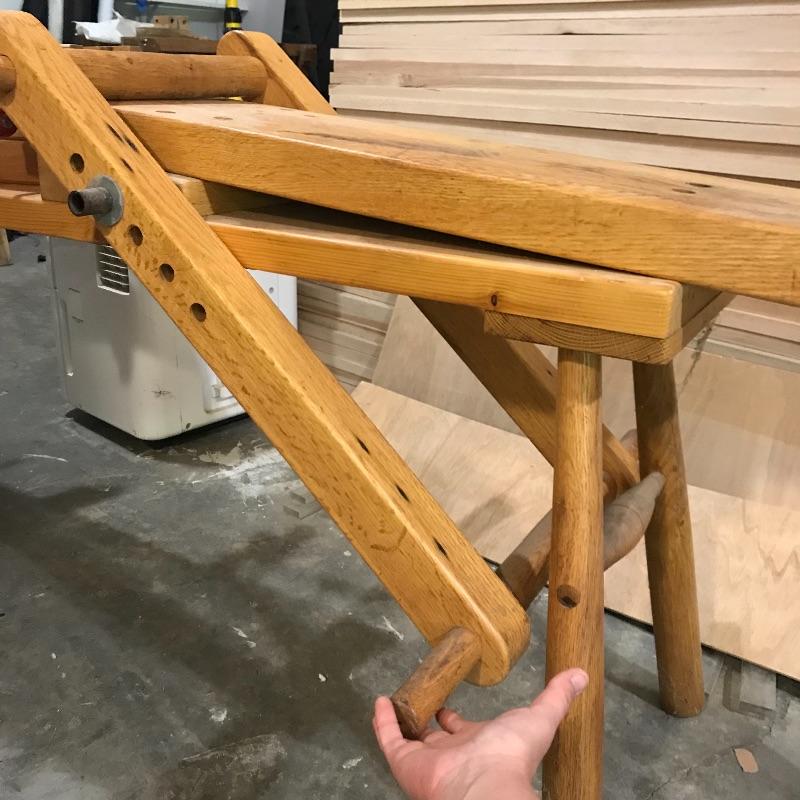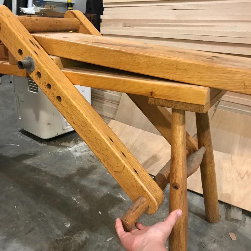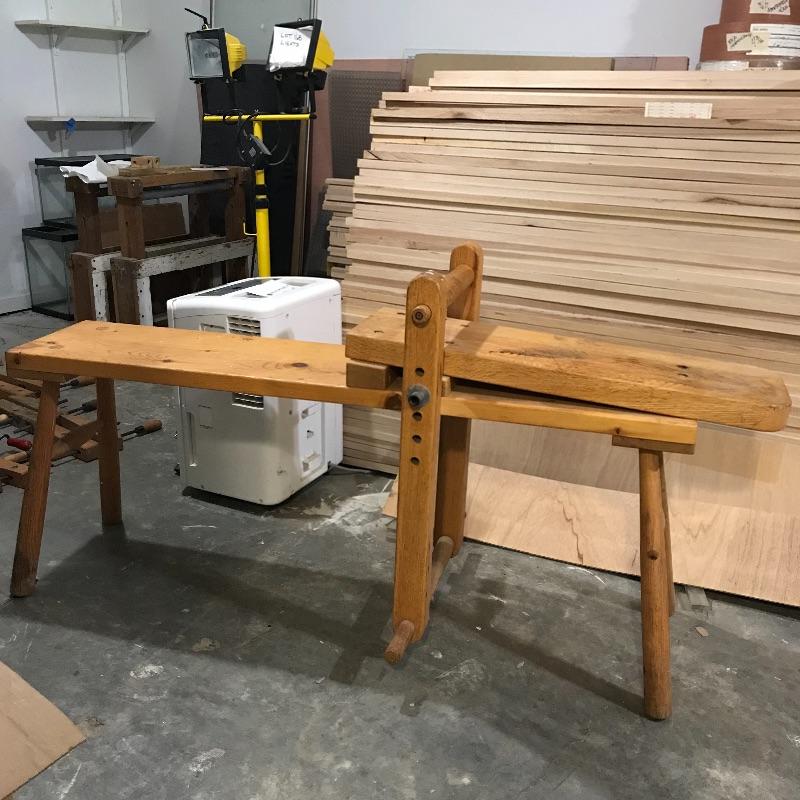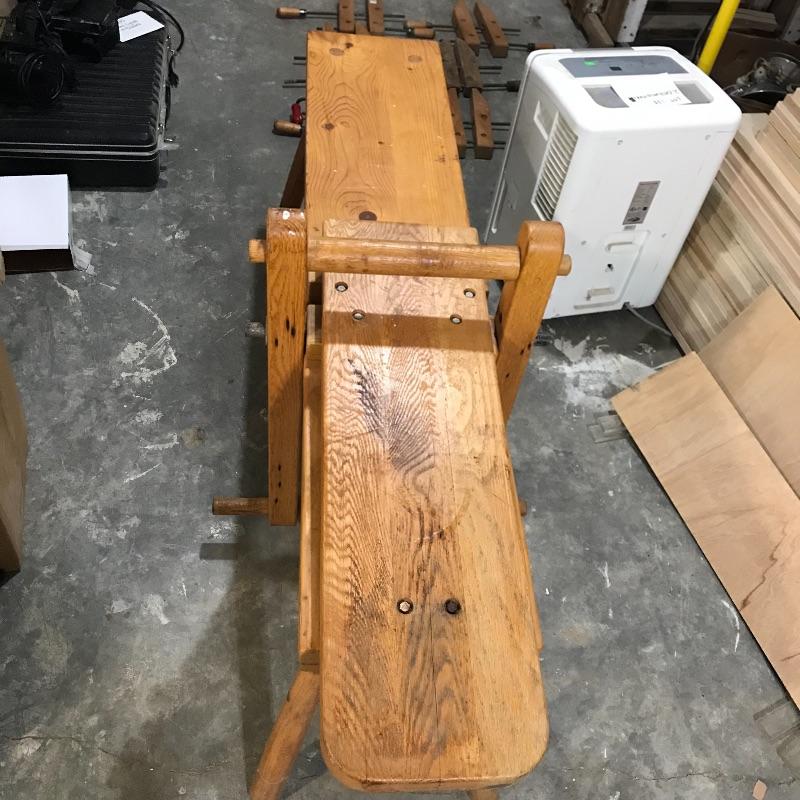 Adjustable wood shaving horse measures approximately 60” x 24” x 32” at its widest points. Piece is sturdy and moves smoothly. Lot includes straight draw shave with 9” blade and six wooden clamps. See photos. No shipping.