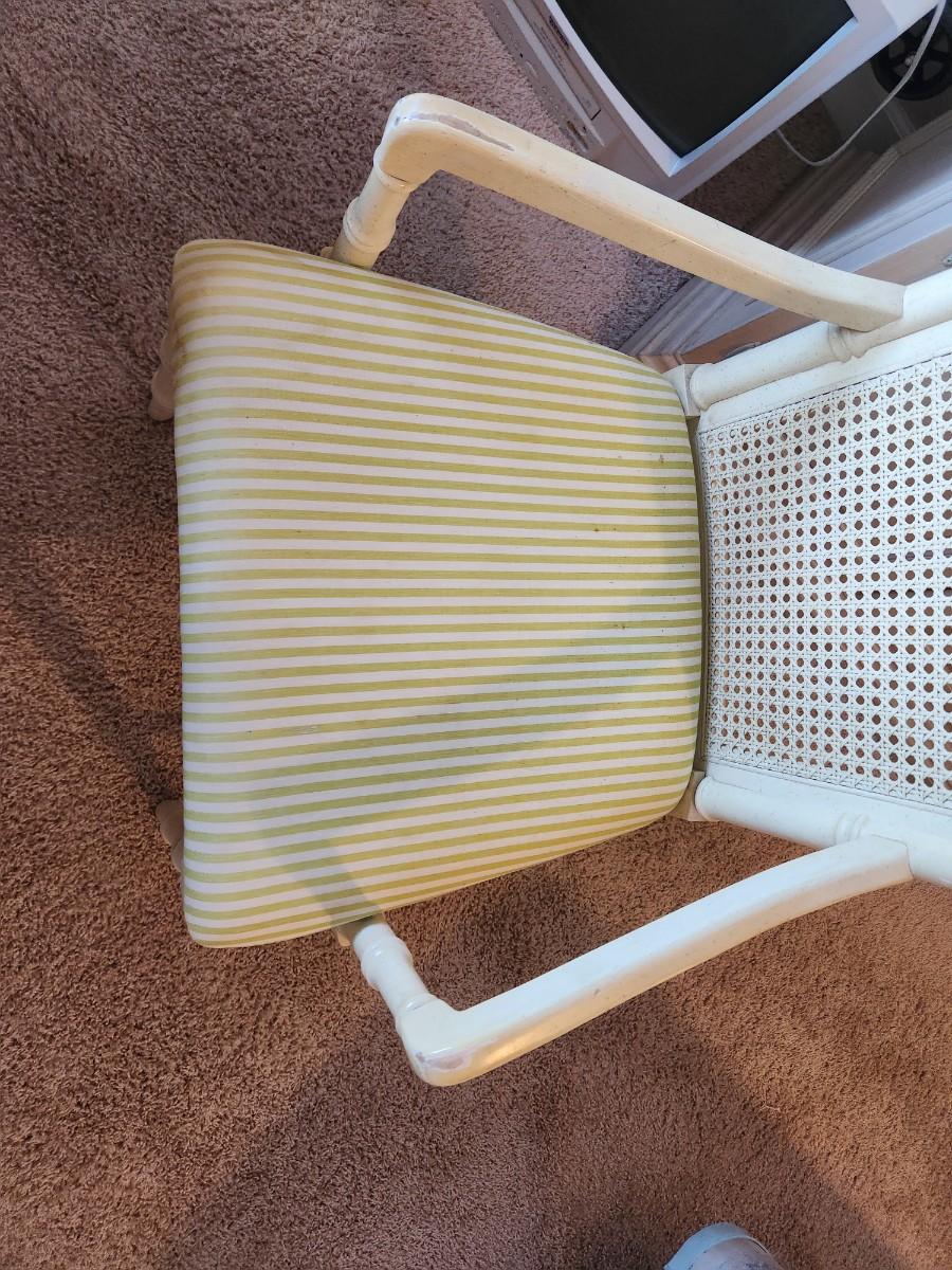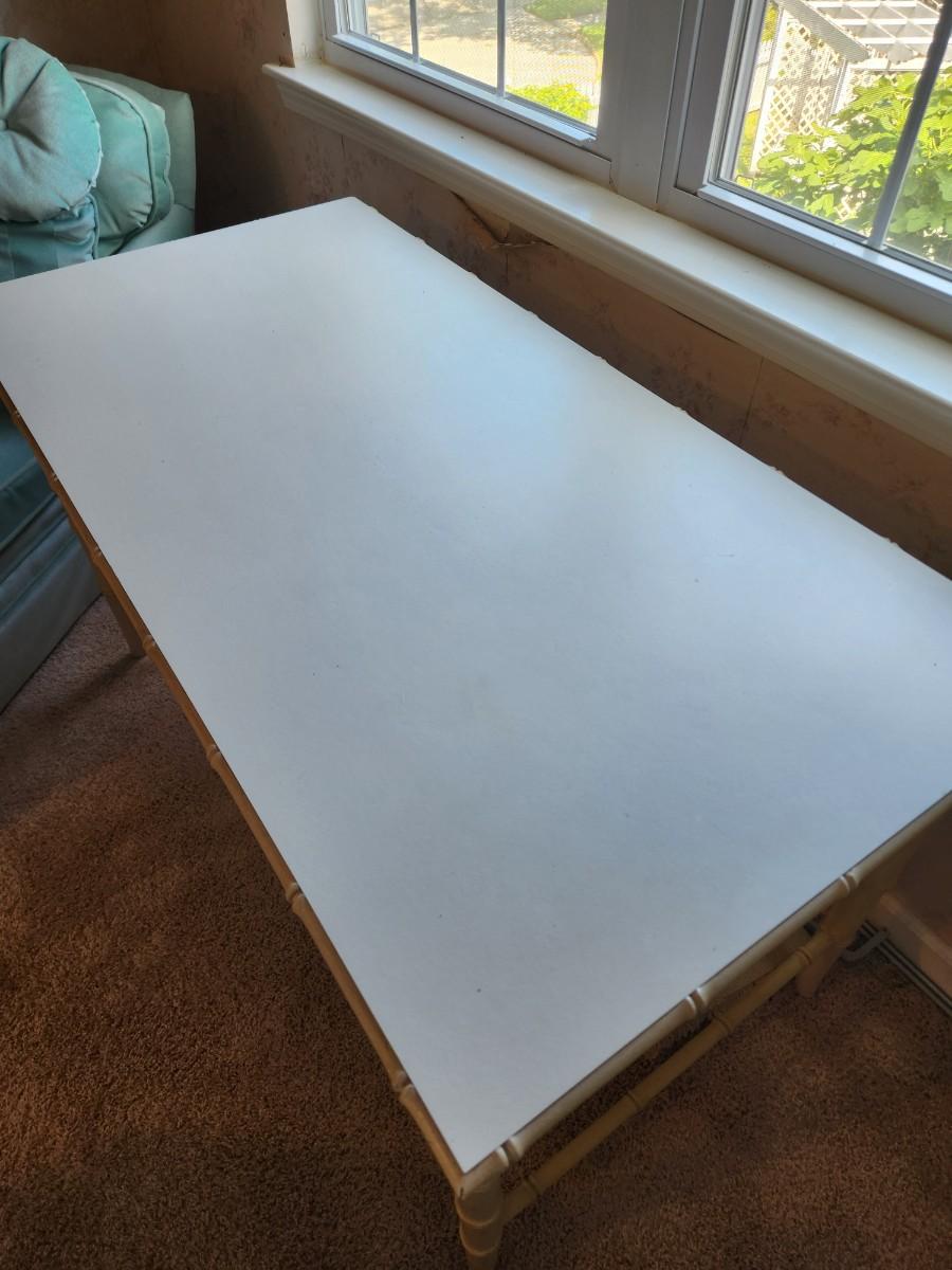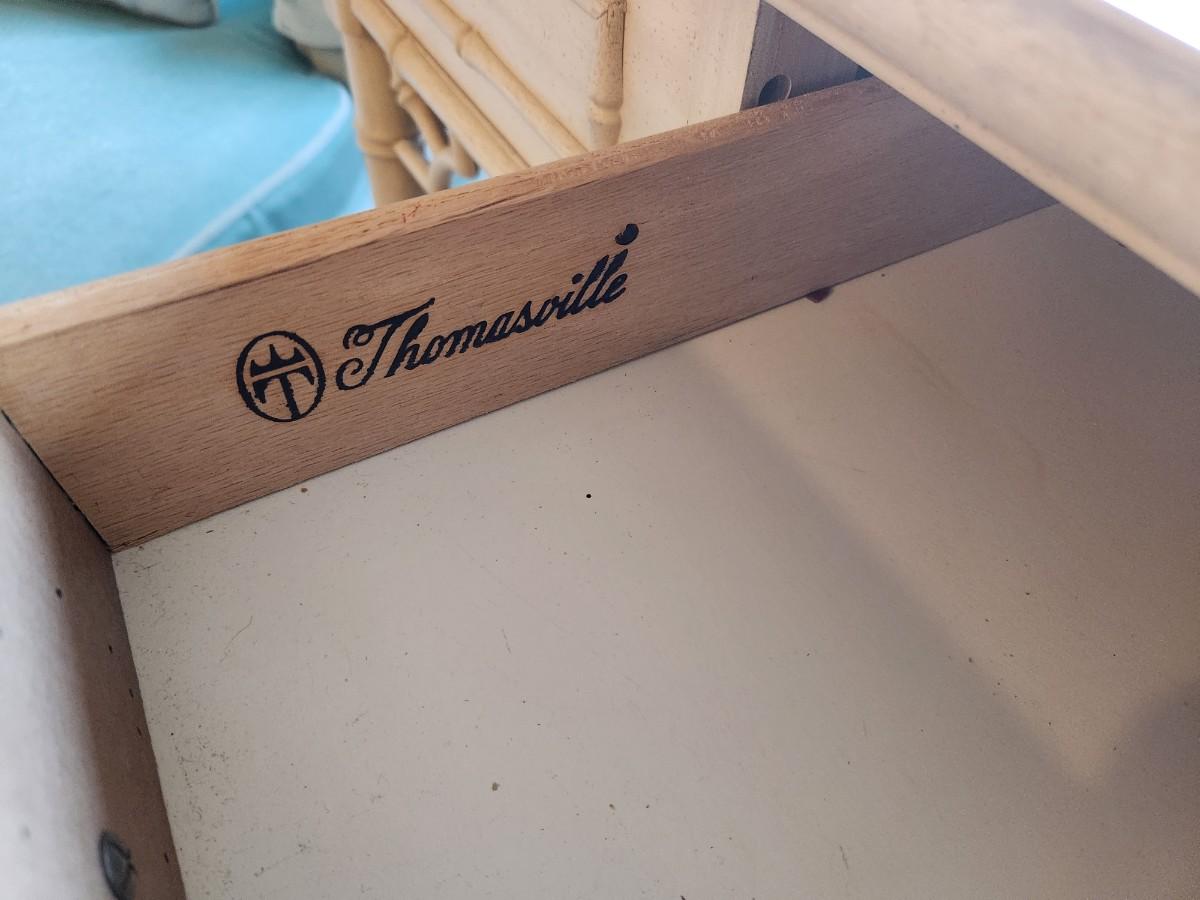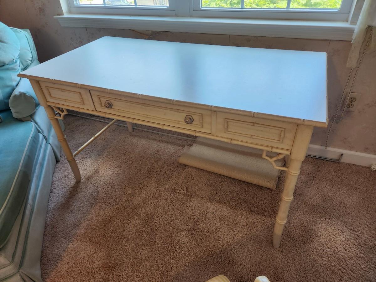 Charming vintage Thomasville 1970s Faux Rattan Desk w/1 drawer - 52" across, 26" deep, 29" tall, Matching Chair is 22" wide, 37" tall. Both show normal wear. Syled as a "ladies desk" - perfect for working on your laptop in your bedroom.