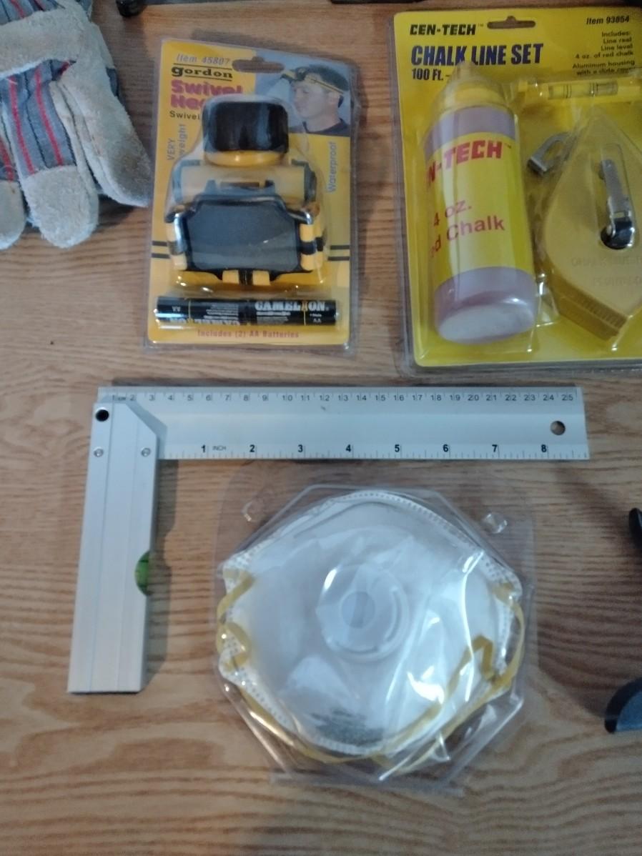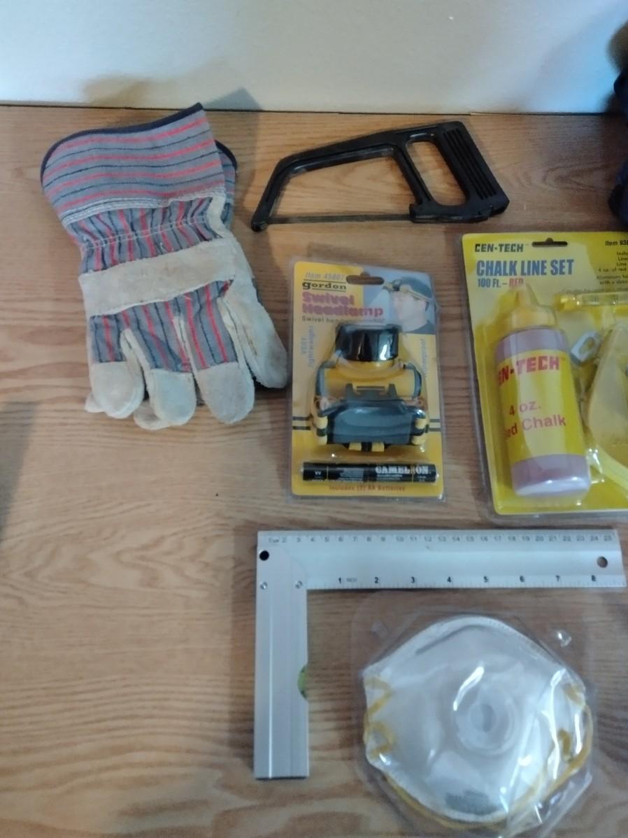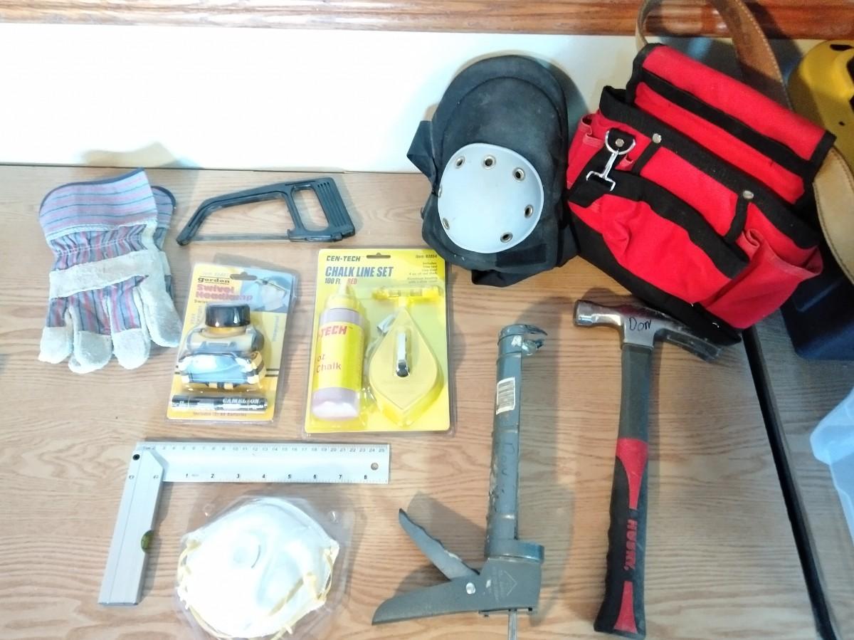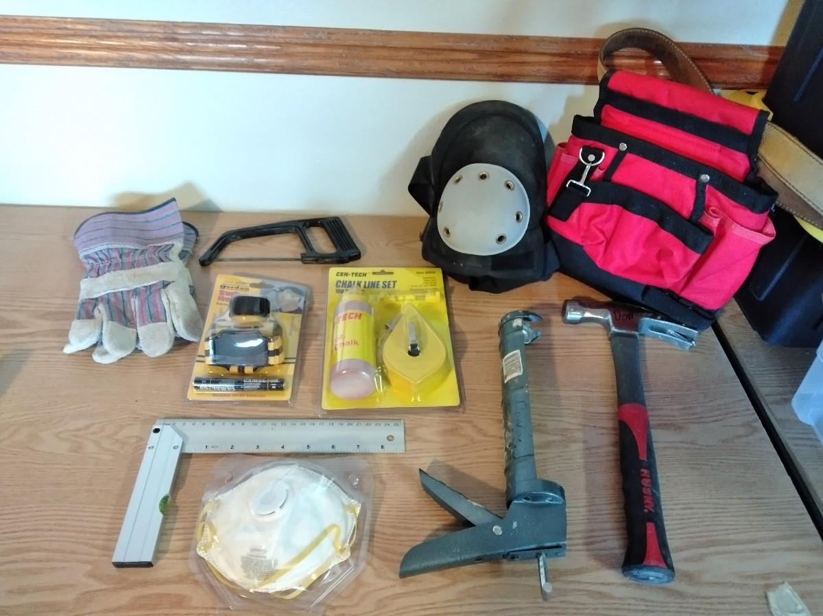 TOOL BELT POUCH, KNEE PADS, NEW CHALK LINE SET, GLOVES, LED HEADLAMP, HAMMER, CALKING GUN, MASKS, T-RULER, AND MINI HAND SAW.